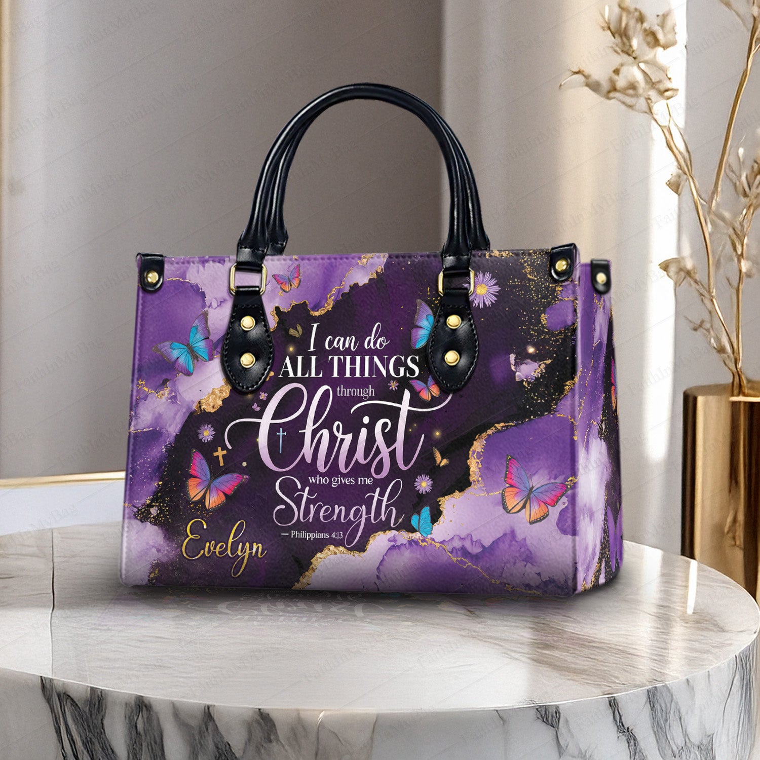 HB09-Personalized Christian PU Leather Handbag - Custom Name Philippians 4:13 Bible Verse Tote - Faith-Inspired Purse, Religious Gift for Women