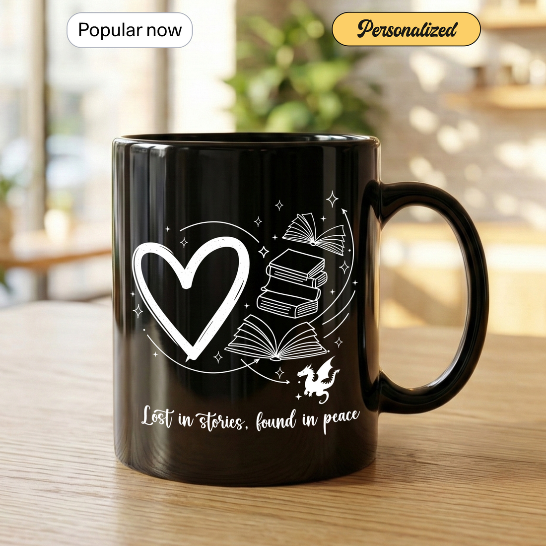 Lost in Stories Found in Peace Mug – Book Lover Black Coffee Cup, Reading Gift for Readers, Writers & Bookworms| Mug 133