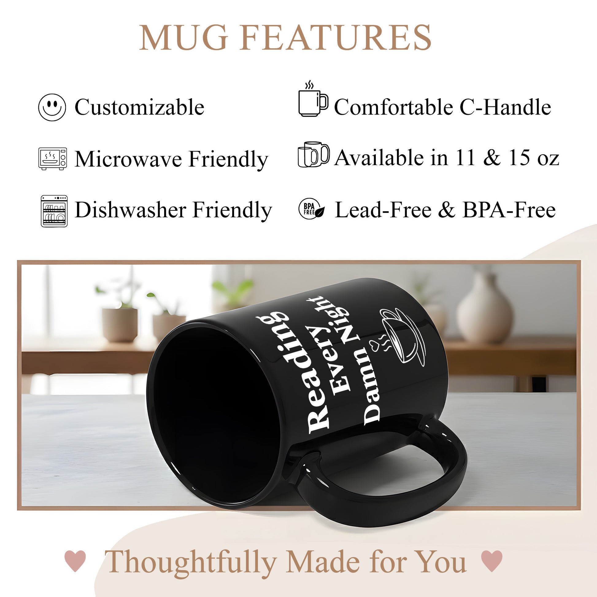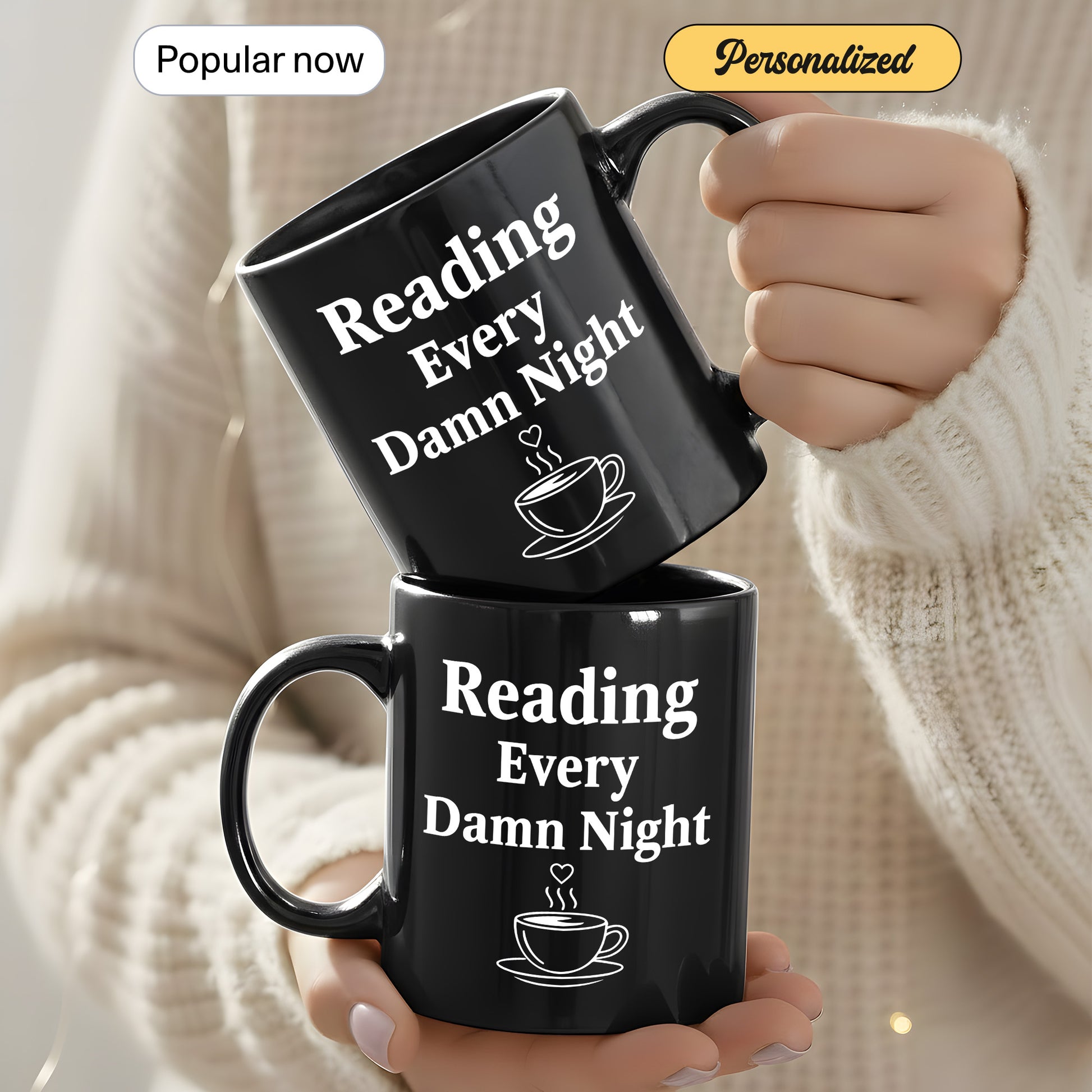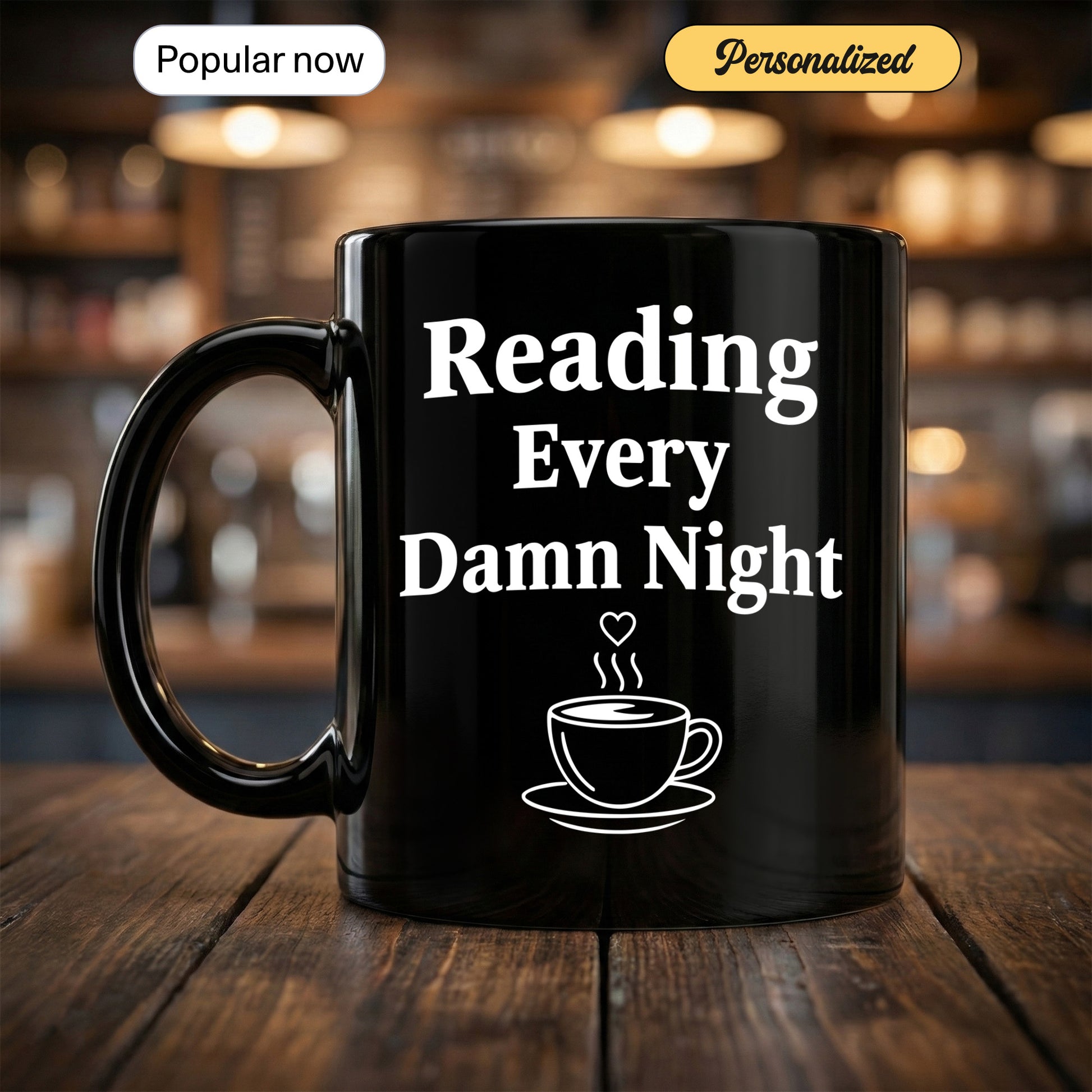 Design: Elegant black mug with the fun phrase "Reading Every Damn Night" and a cute coffee cup graphic, perfect for book lovers and coffee enthusiasts.