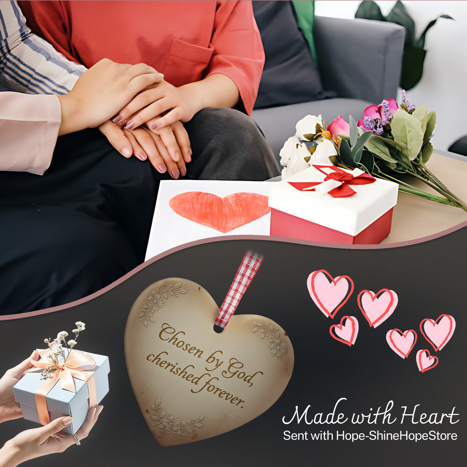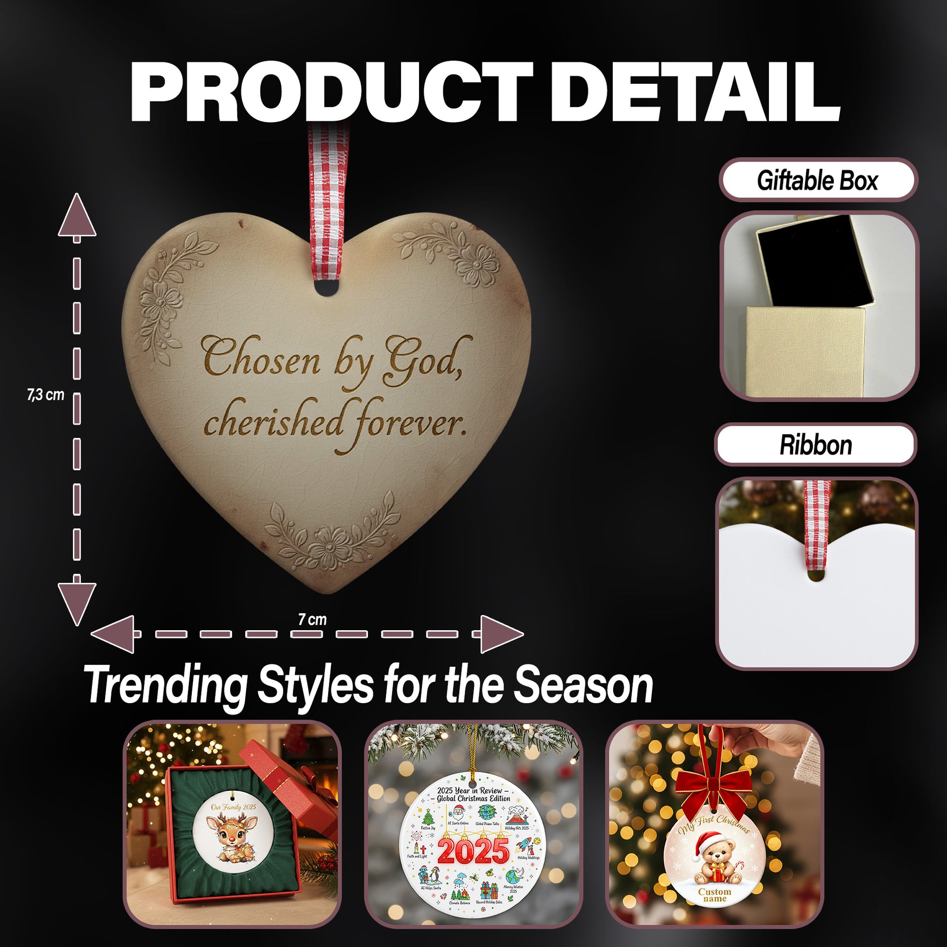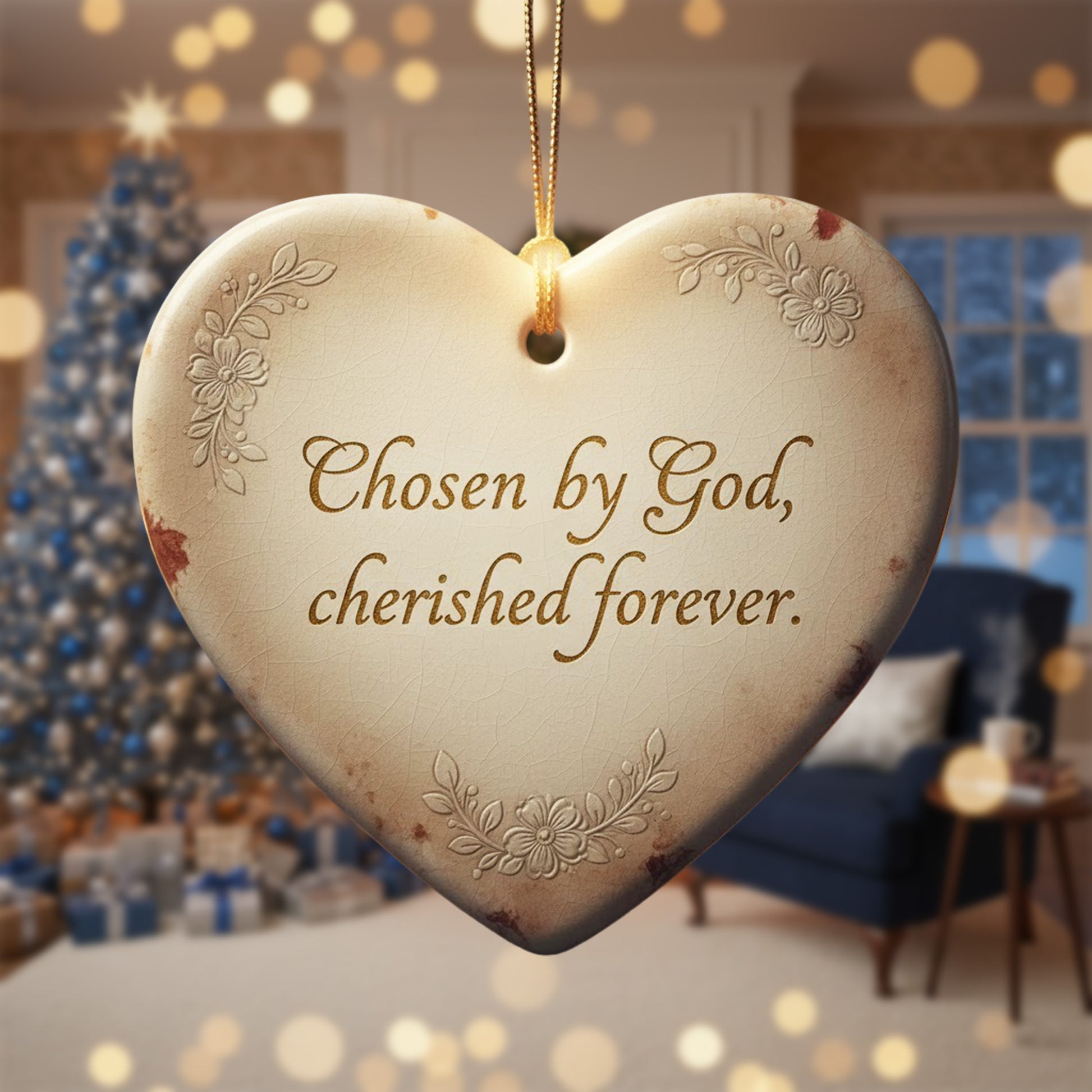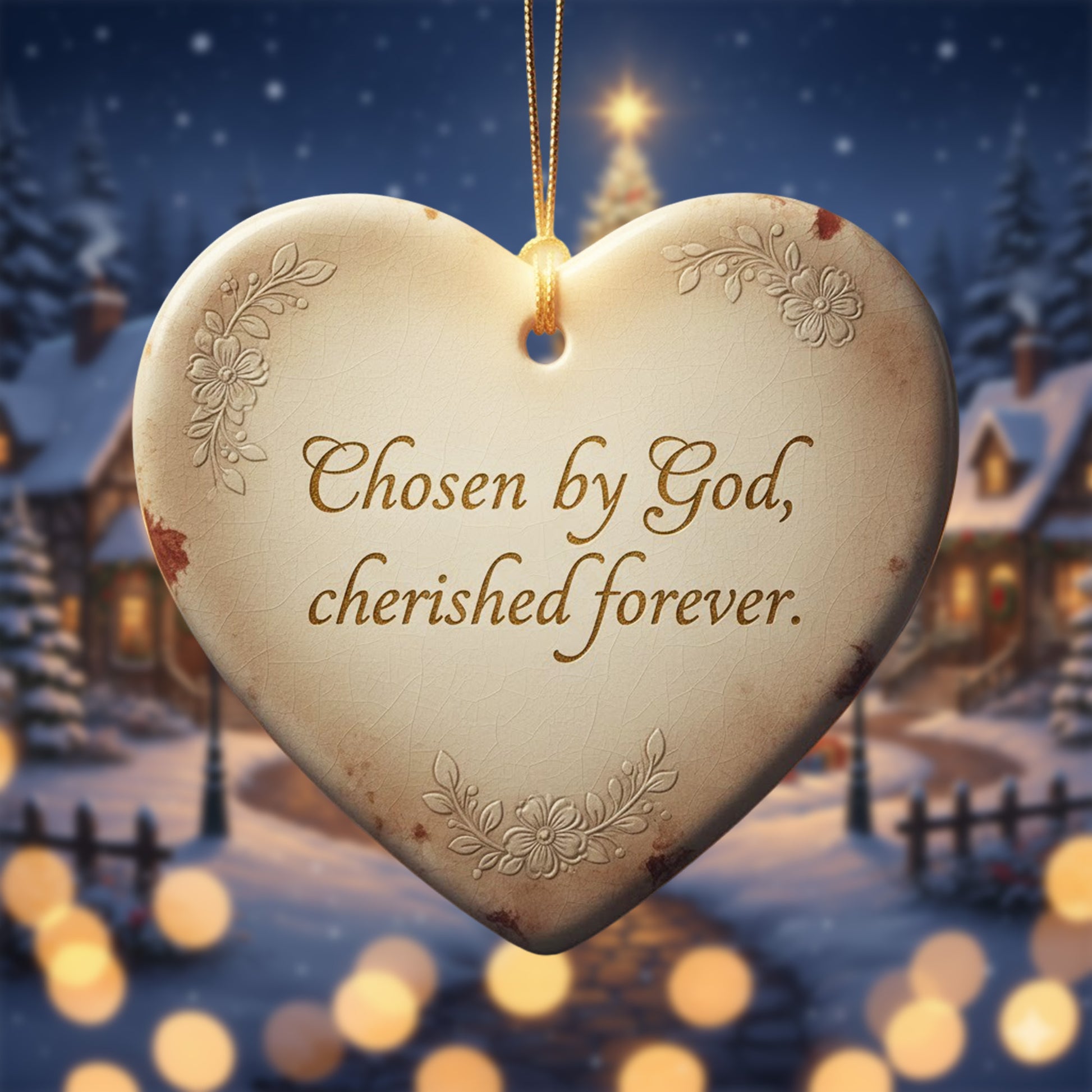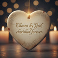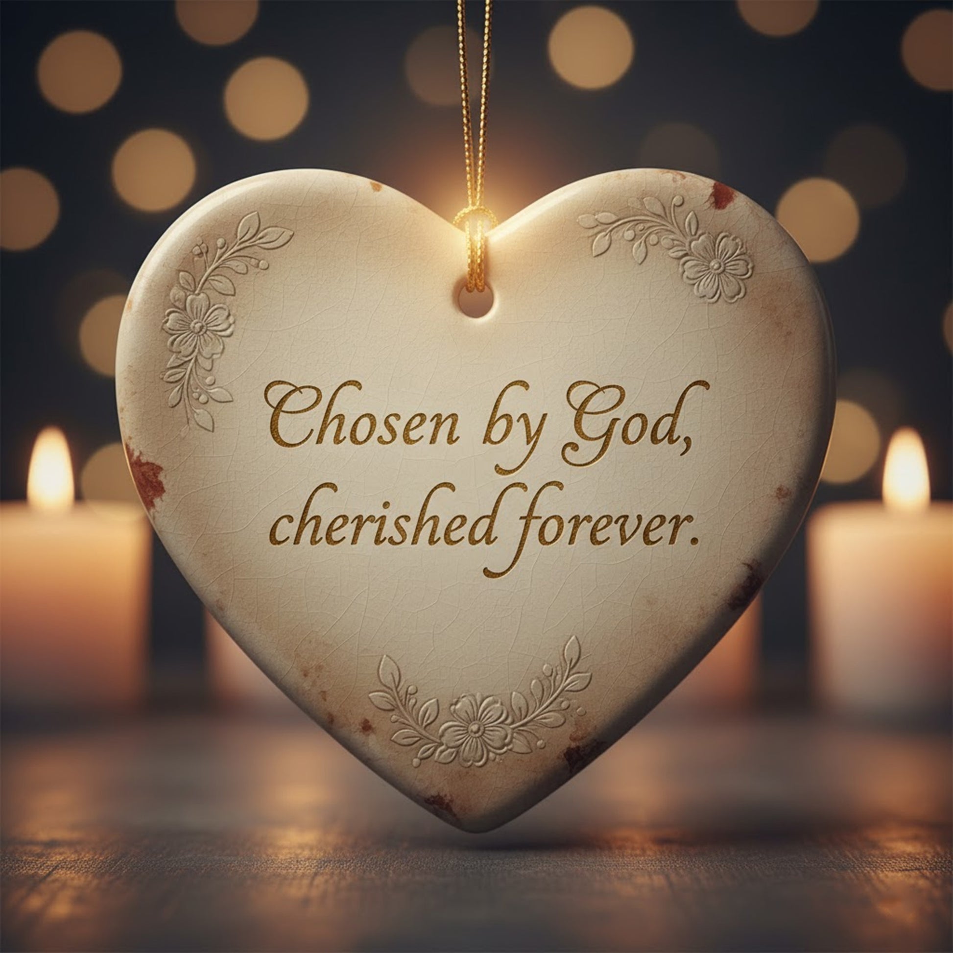 Under the soft glow of candlelight, this heart-shaped ornament whispers a message of faith - “Chosen by God, cherished forever.”