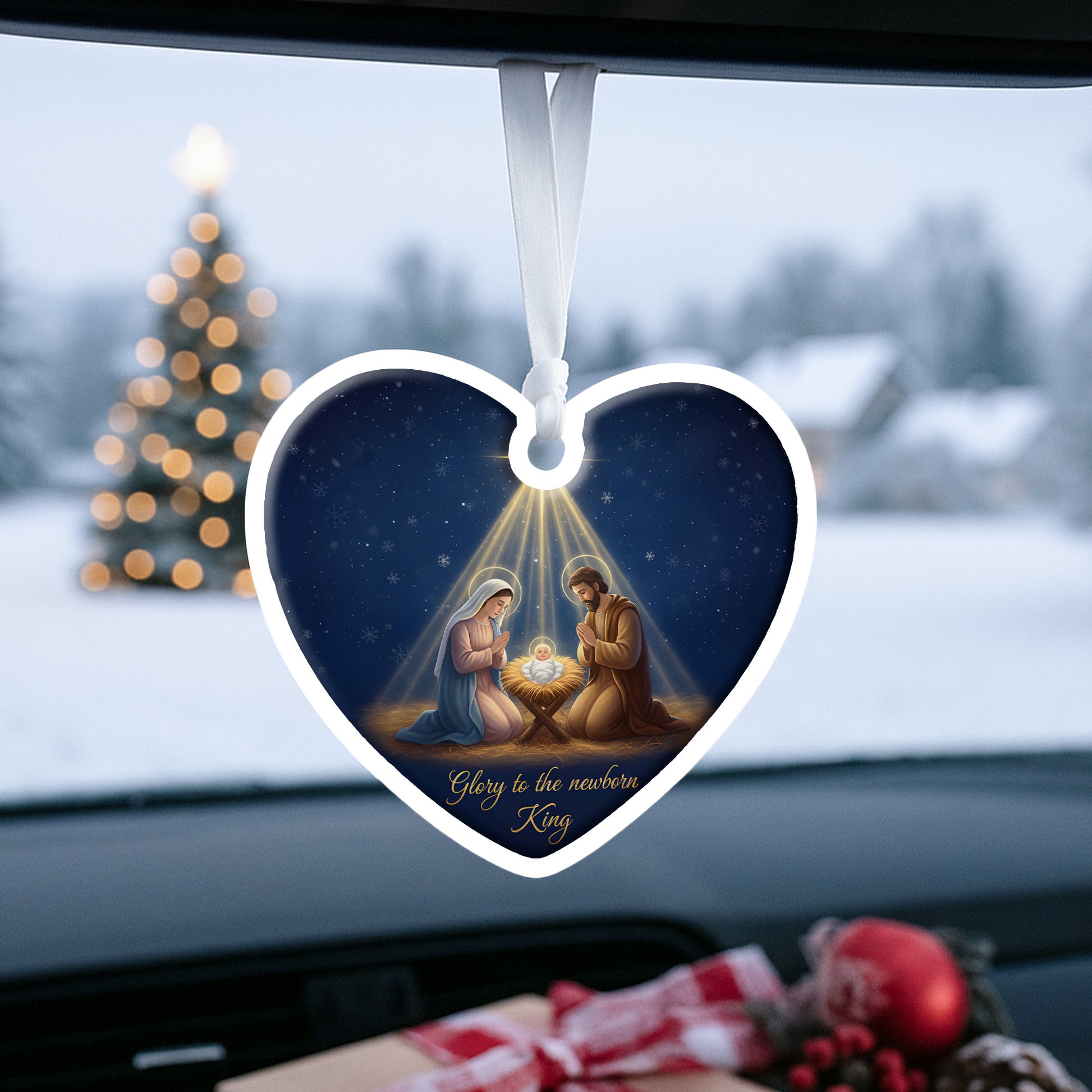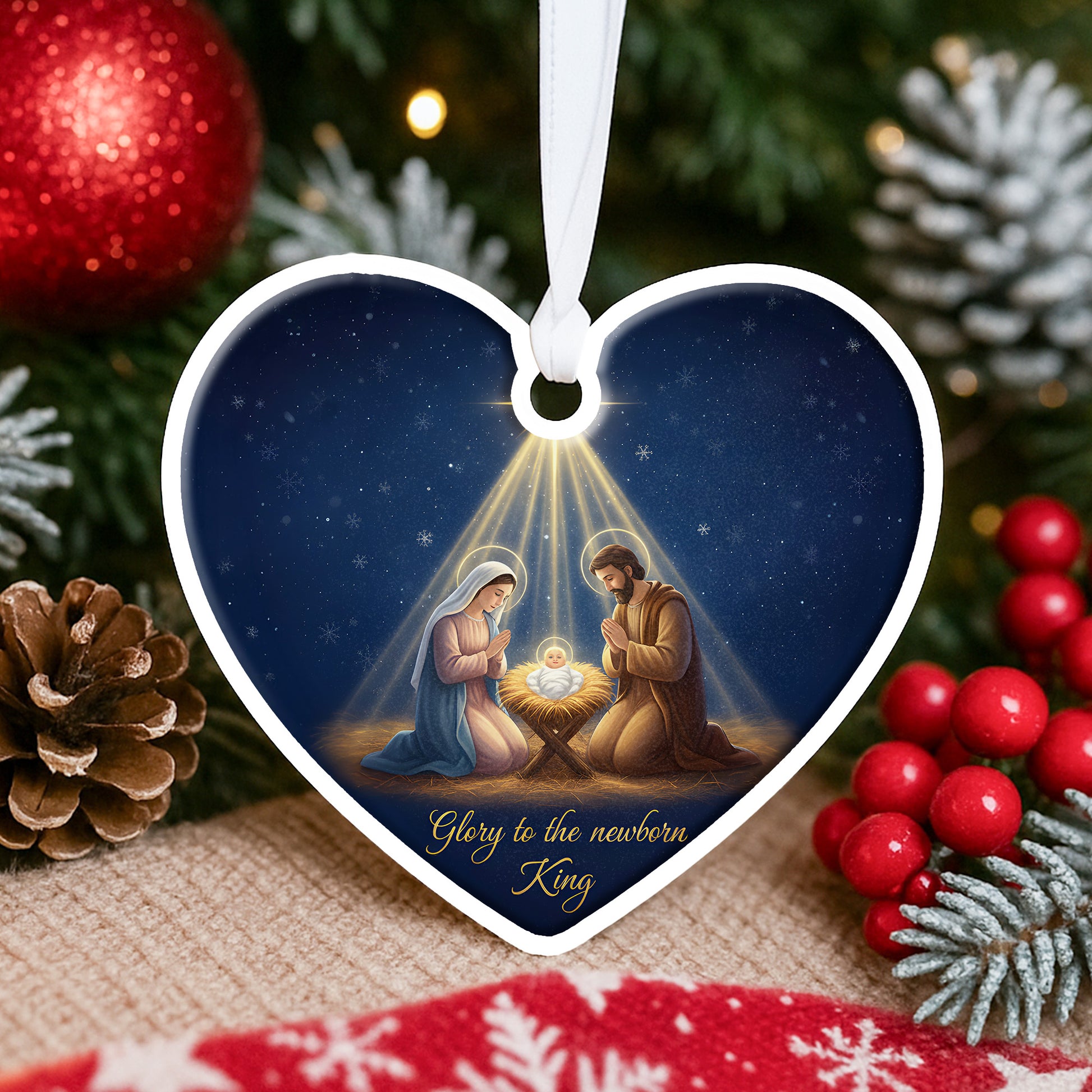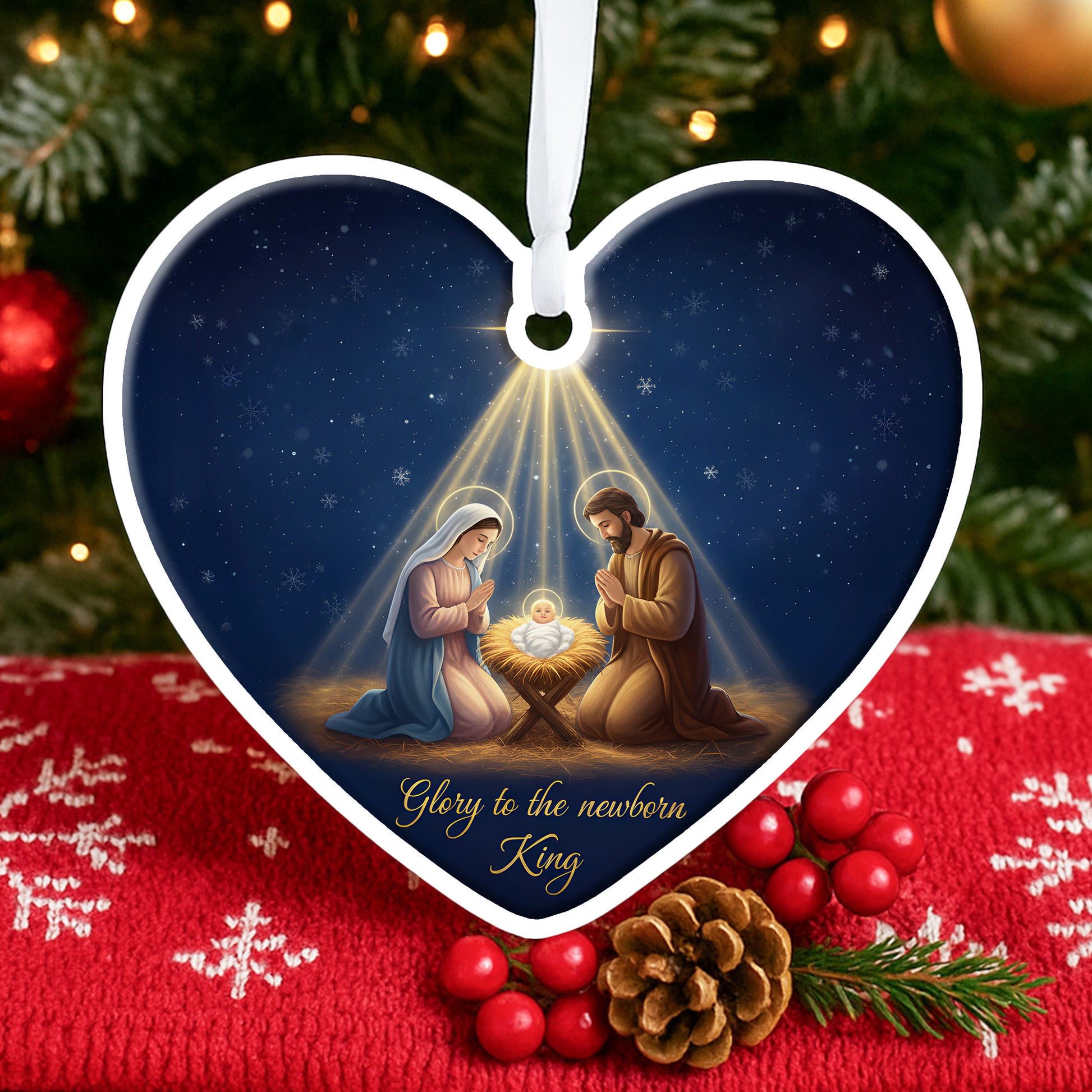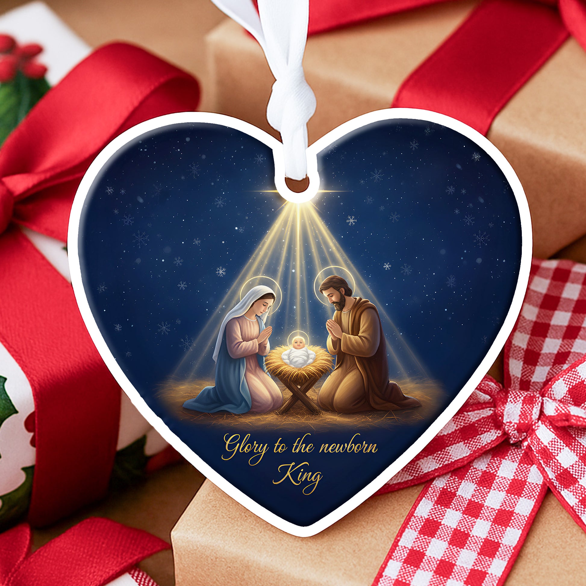 Glory to the Newborn King Ornament – Heart Shaped Nativity Scene, Holy Family Christmas Decoration, Christian Holiday Gift|ONM03