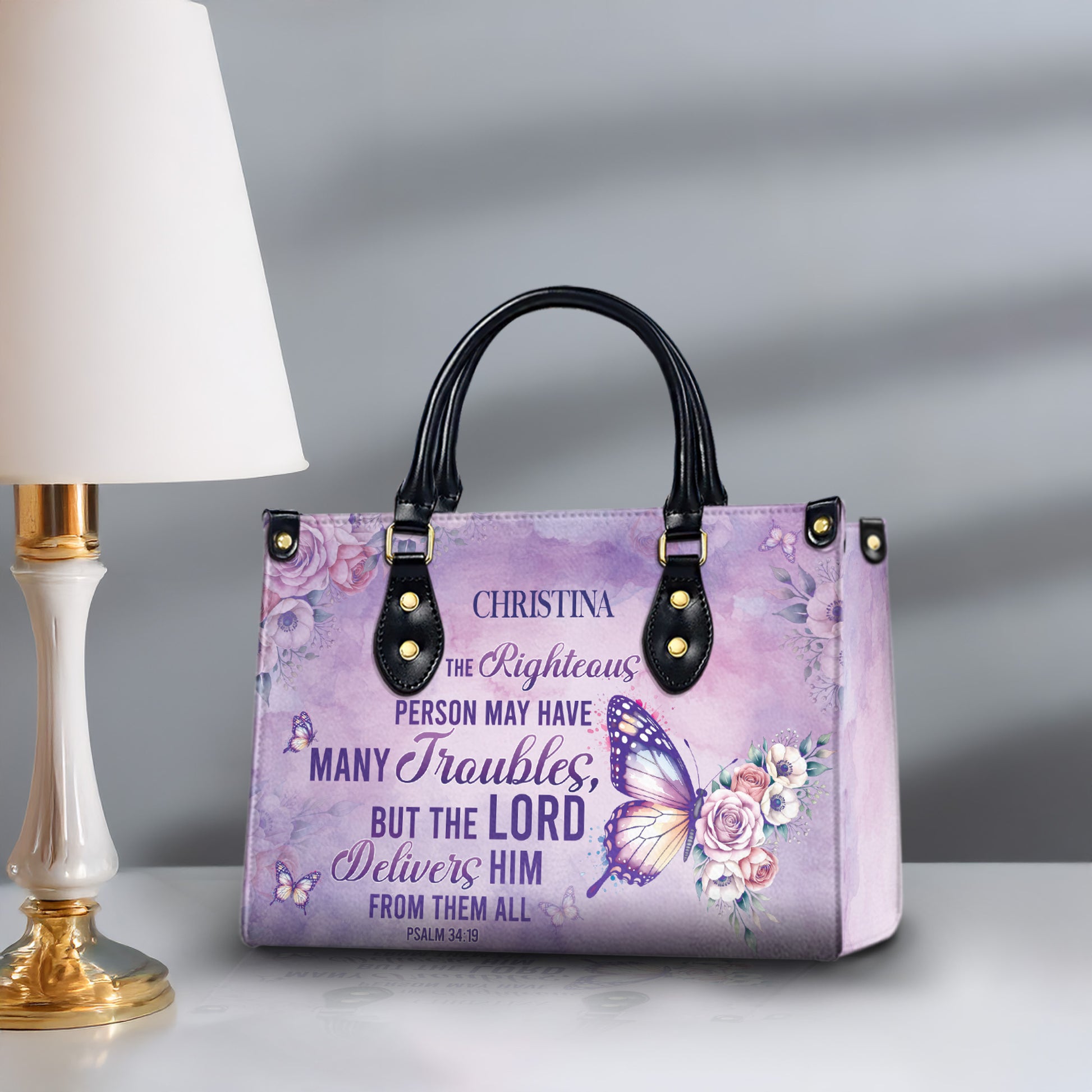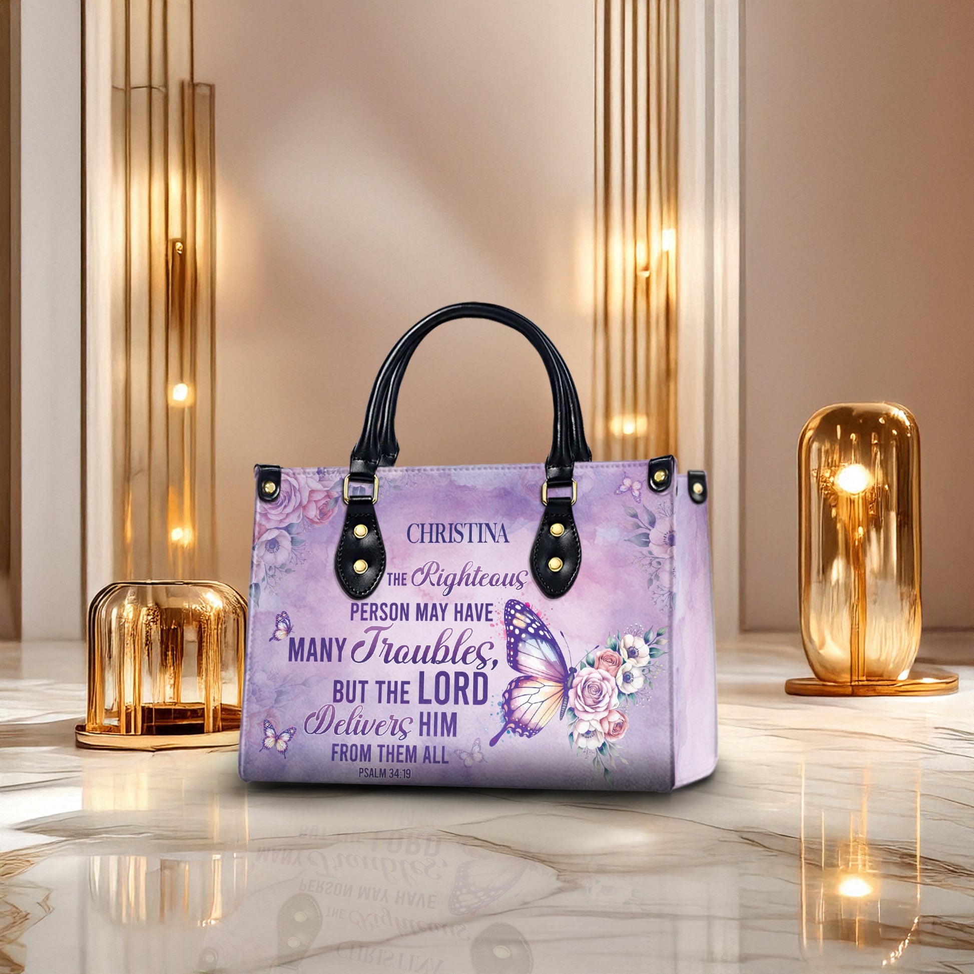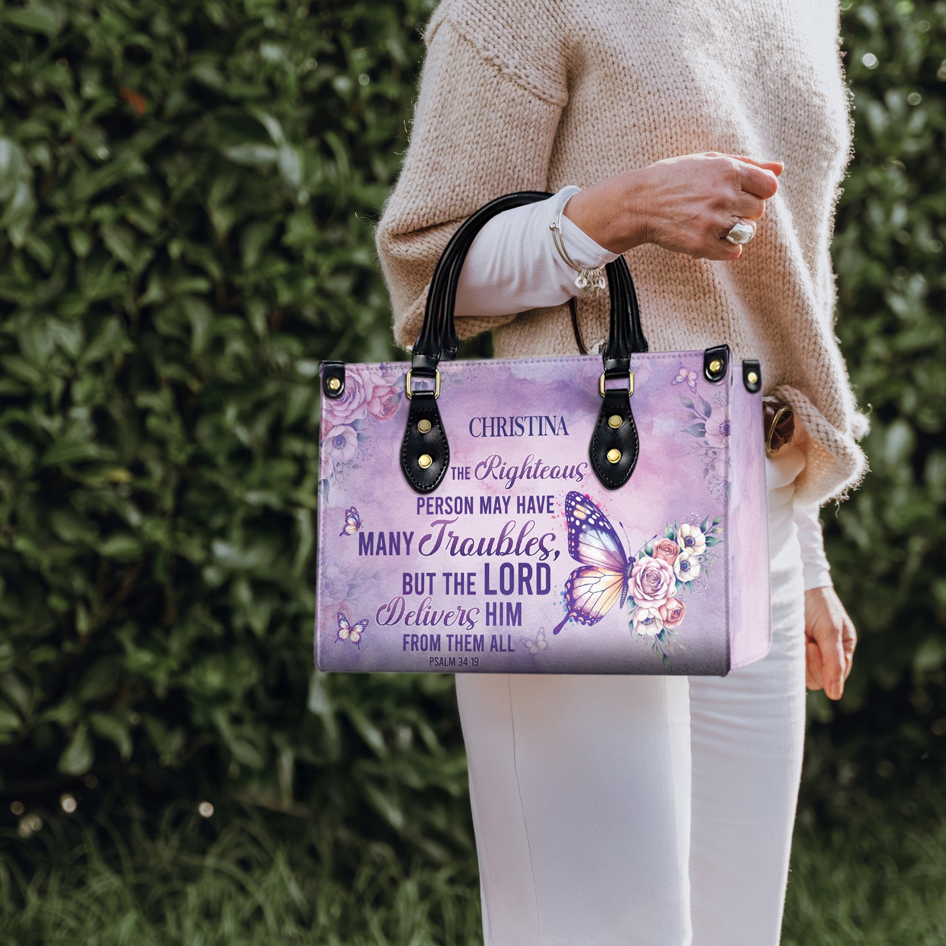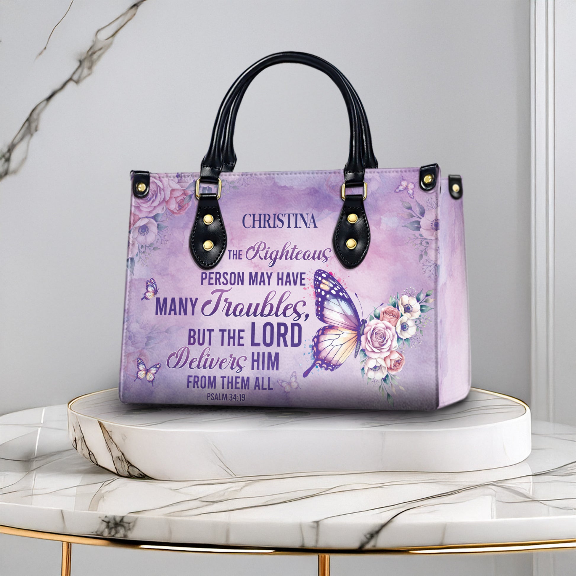 HB93 - Custom Name Christian Handbag – The Lord Delivers Purse – Bible Verse Psalm 34:19 Bag – Faith Butterfly Floral Tote for Women