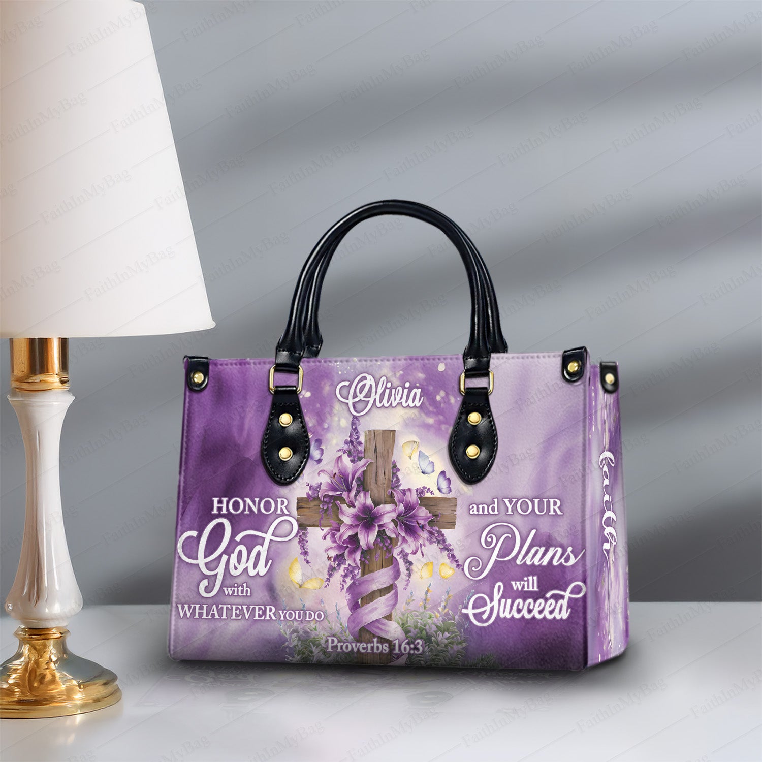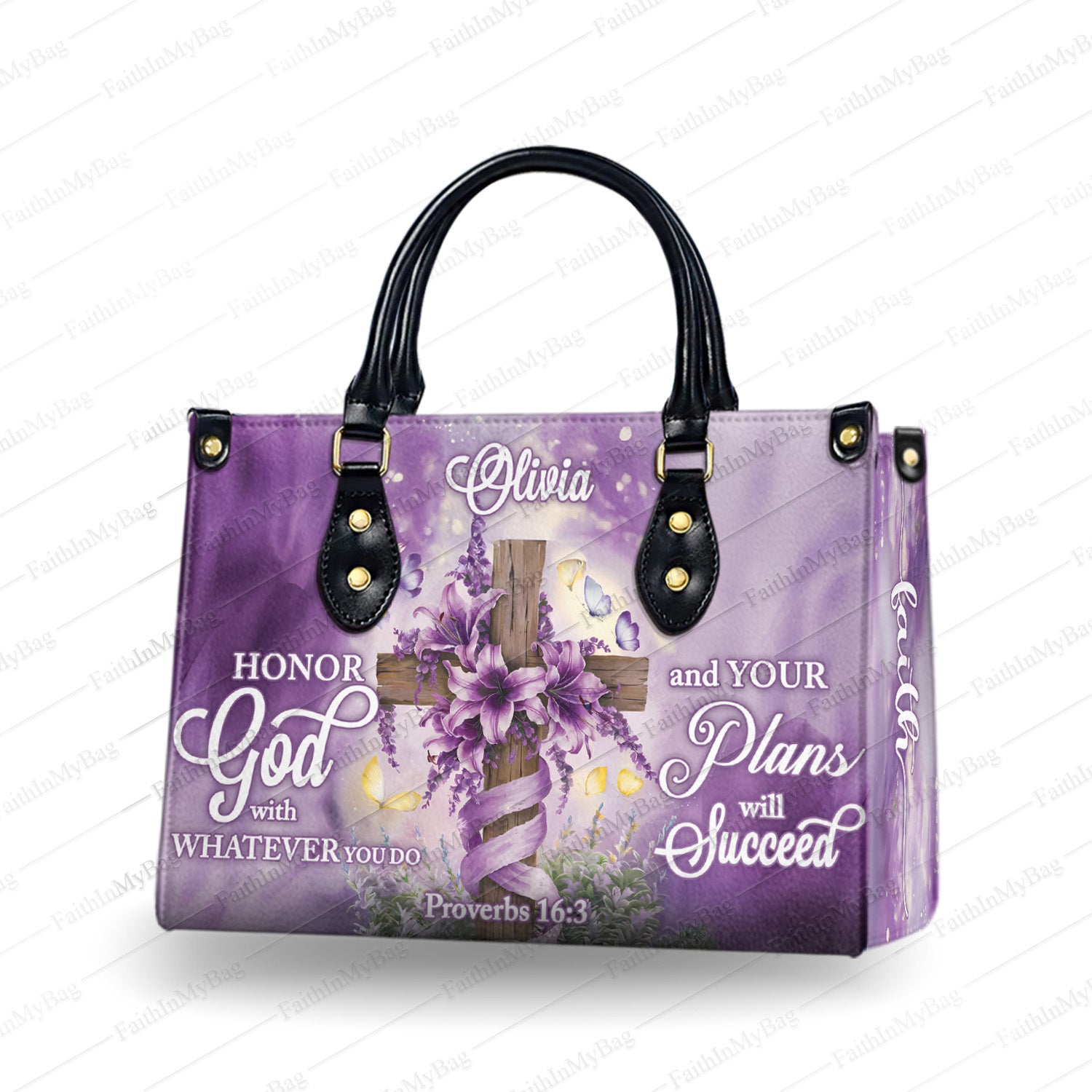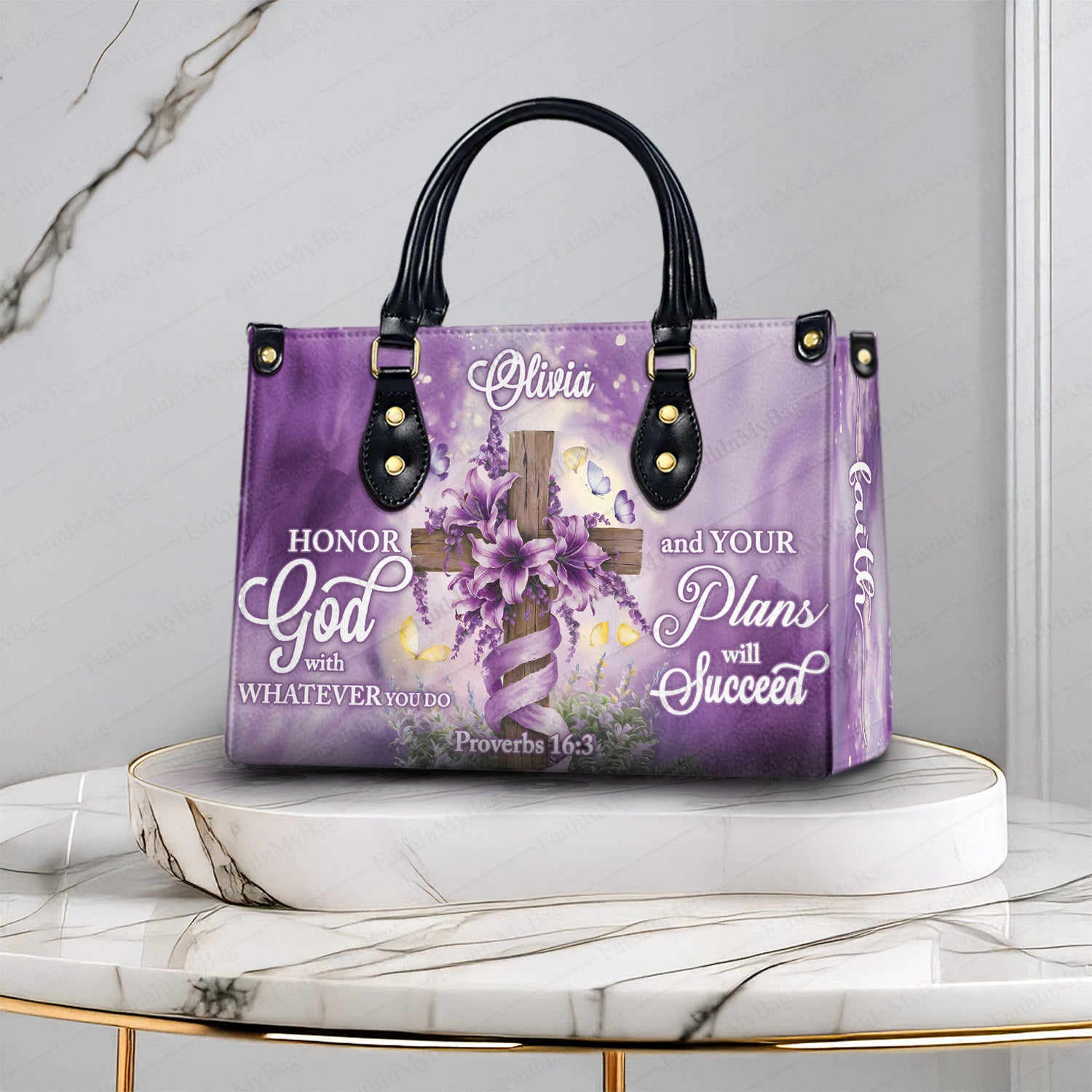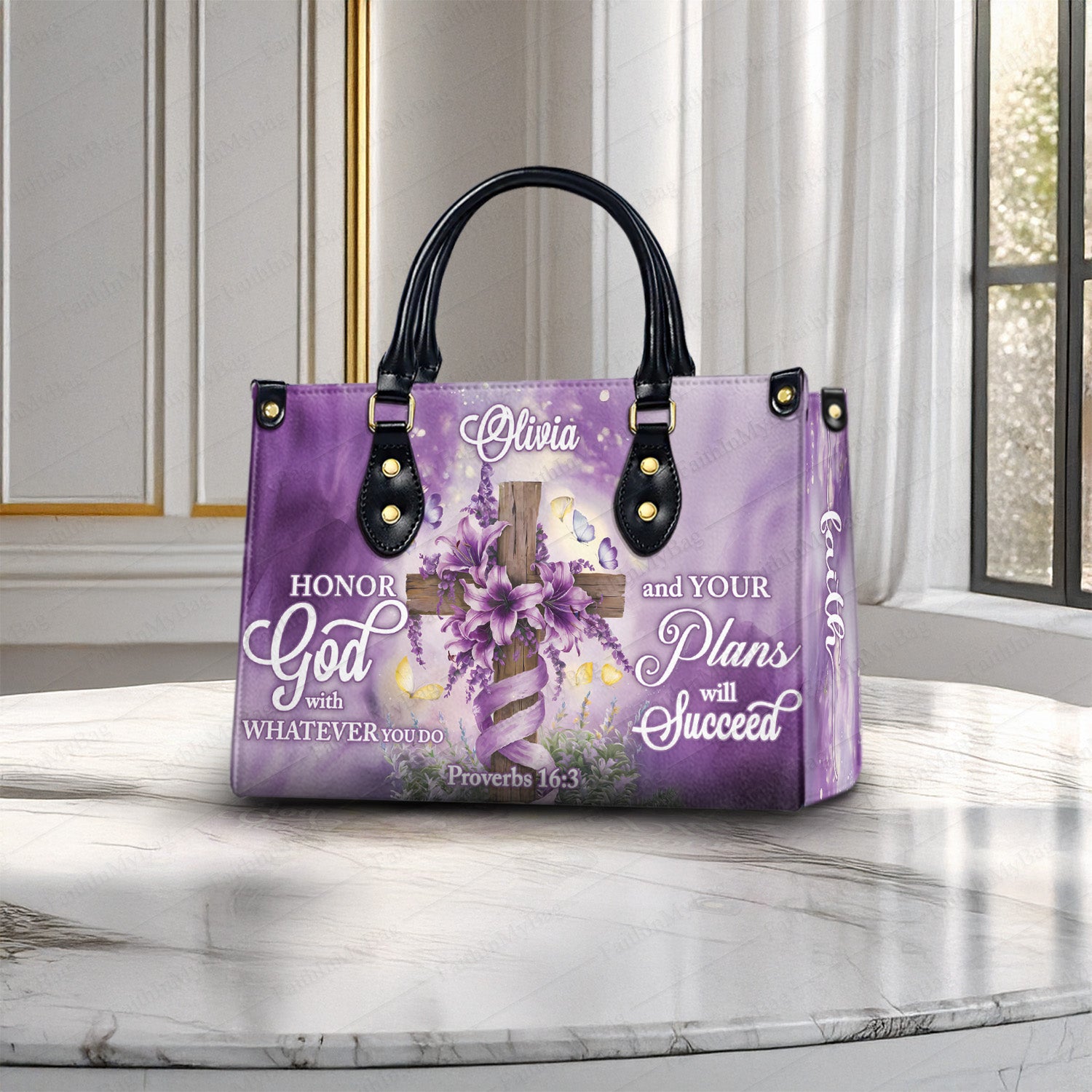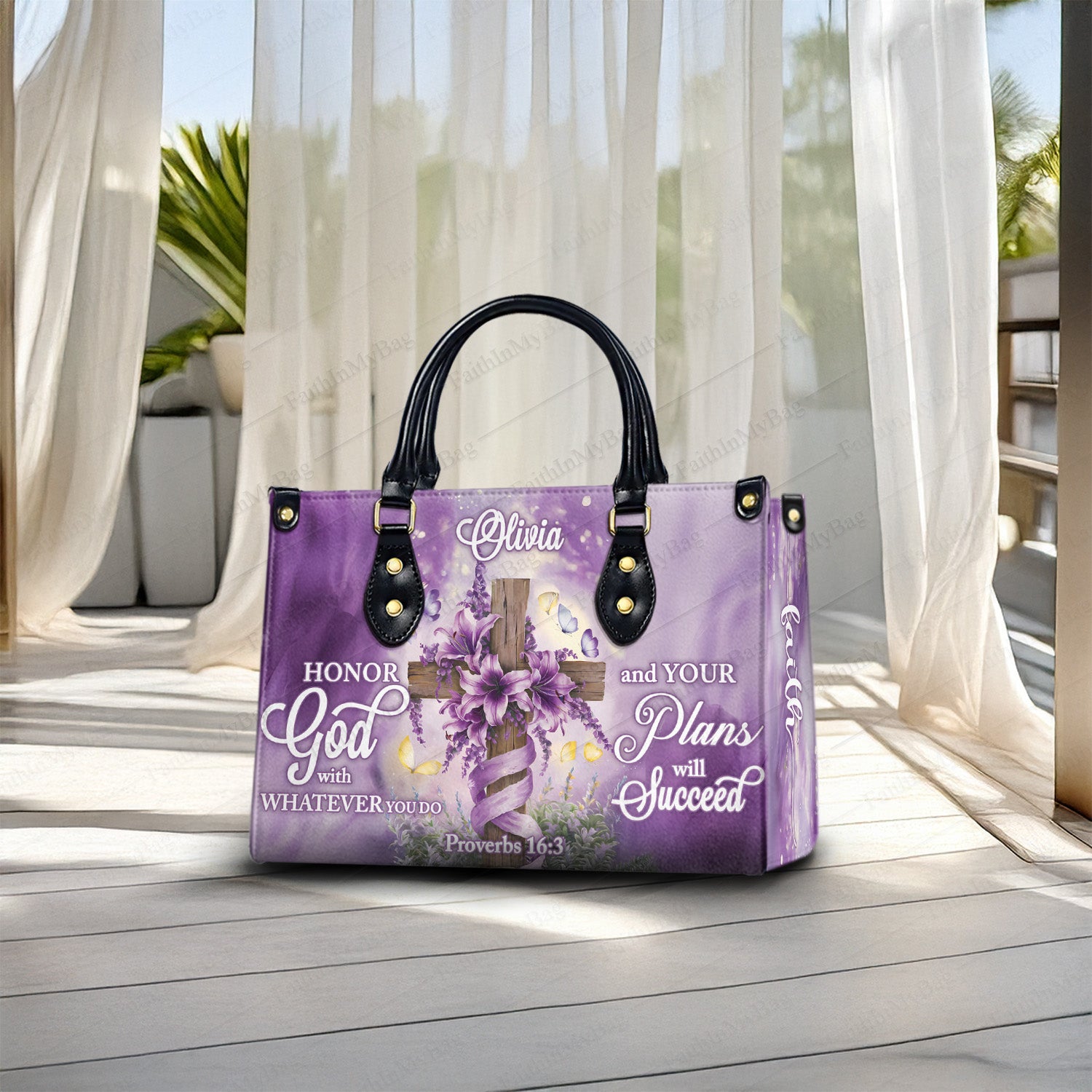 HB74-Custom Christian Handbag for Women - Proverbs 16:3 Bible Verse Purse - Personalized Faith Bag with Cross and Name - Gift for Her
