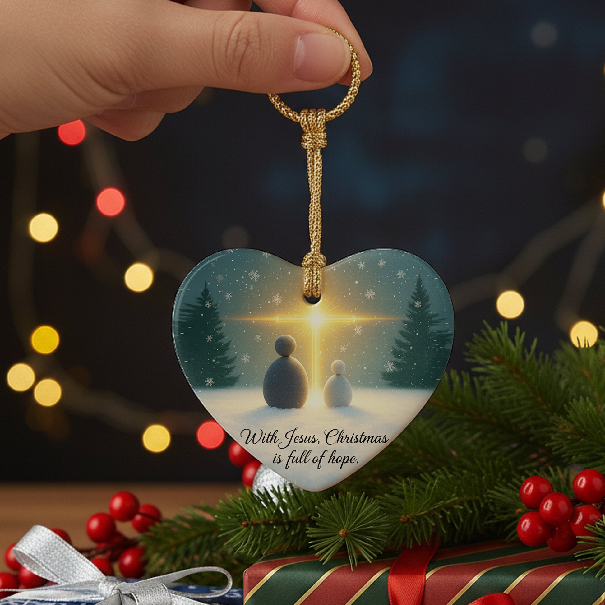 Celebrate the true meaning of Christmas with our 3-piece Christian ceramic ornament set. Each heart-shaped ornament beautifully expresses faith, hope, and love, reminding us that Jesus is the light of every season. Perfect for adding warmth and meaning to your holiday tree or gifting to loved ones who cherish their faith.