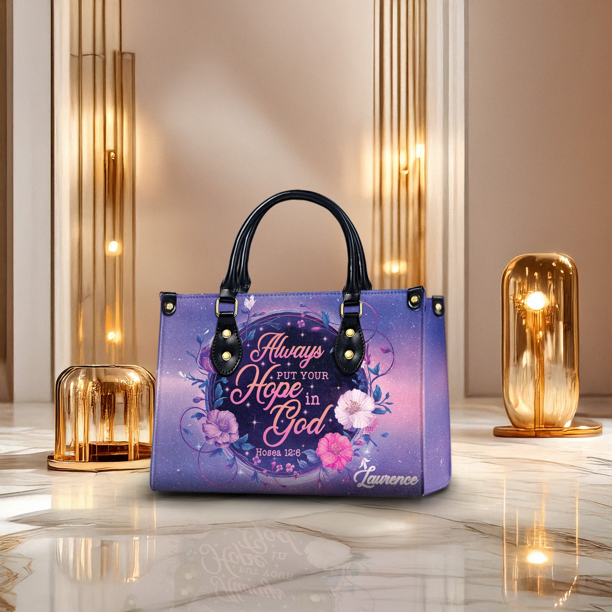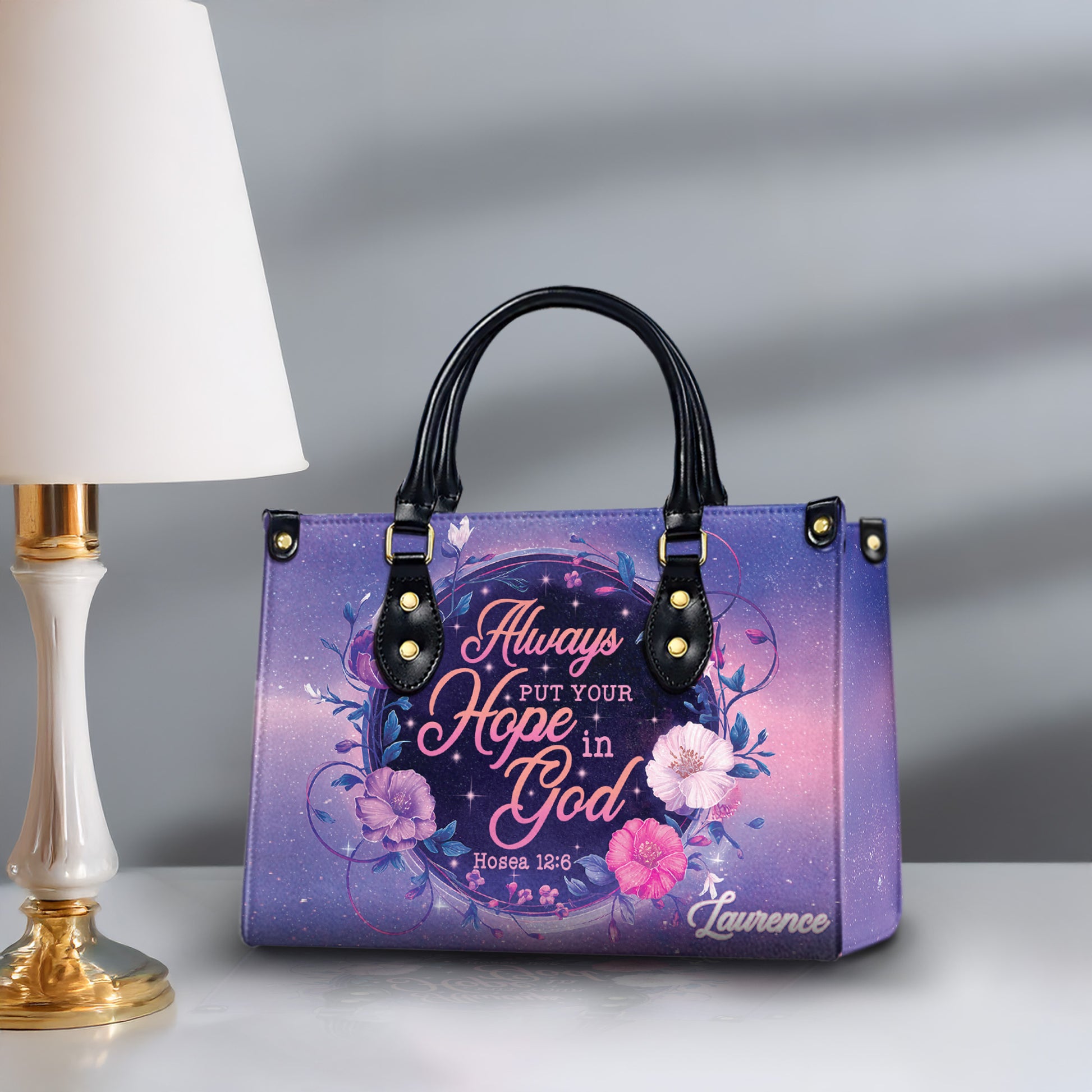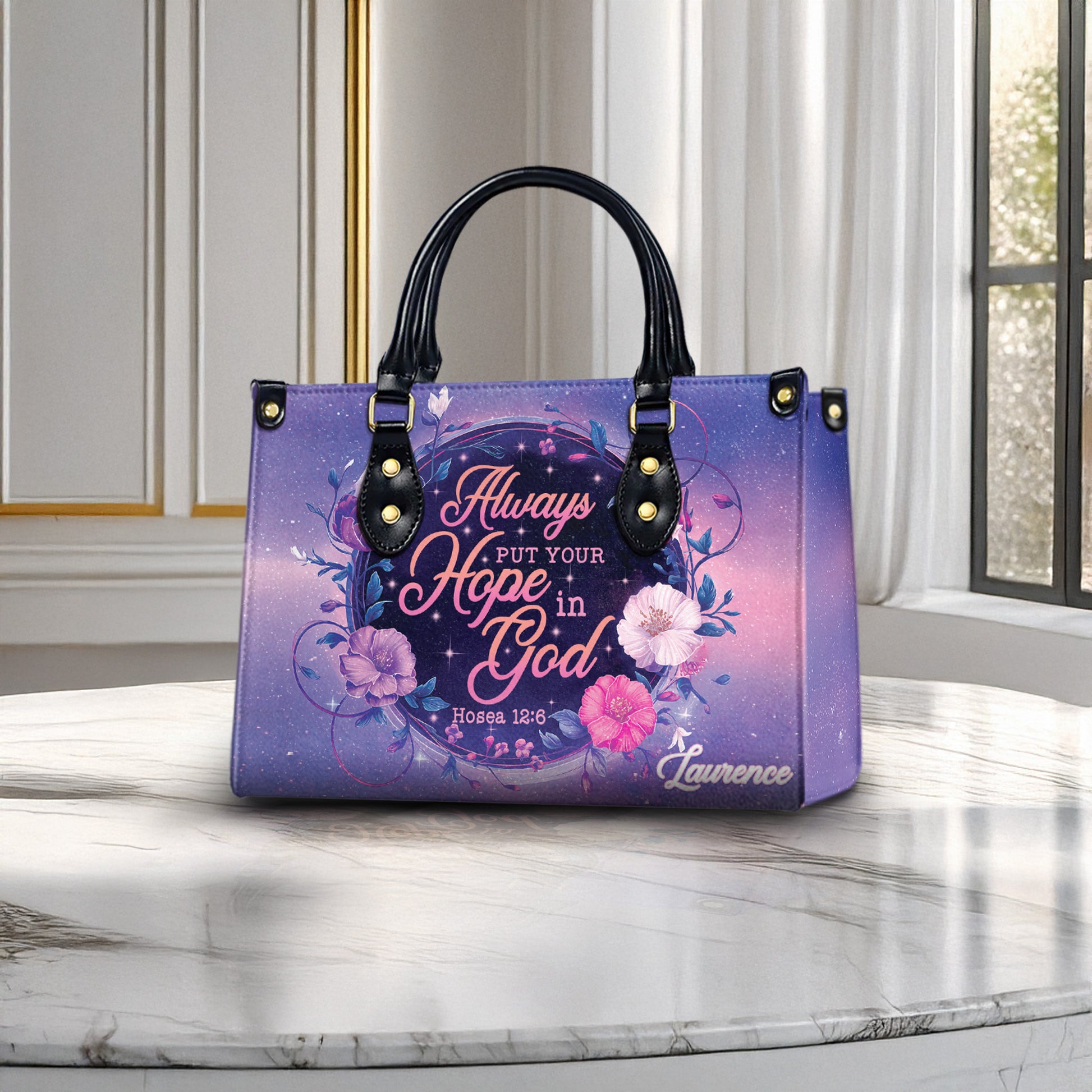 Express your faith with elegance through this beautifully crafted Christian handbag, featuring the powerful Bible verse Hosea 12:6: "Always put your hope in God." With its delicate floral design, glowing script, and spiritual message, this faith purse is the perfect everyday companion for women who walk with God’s love and grace.