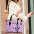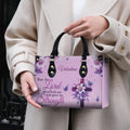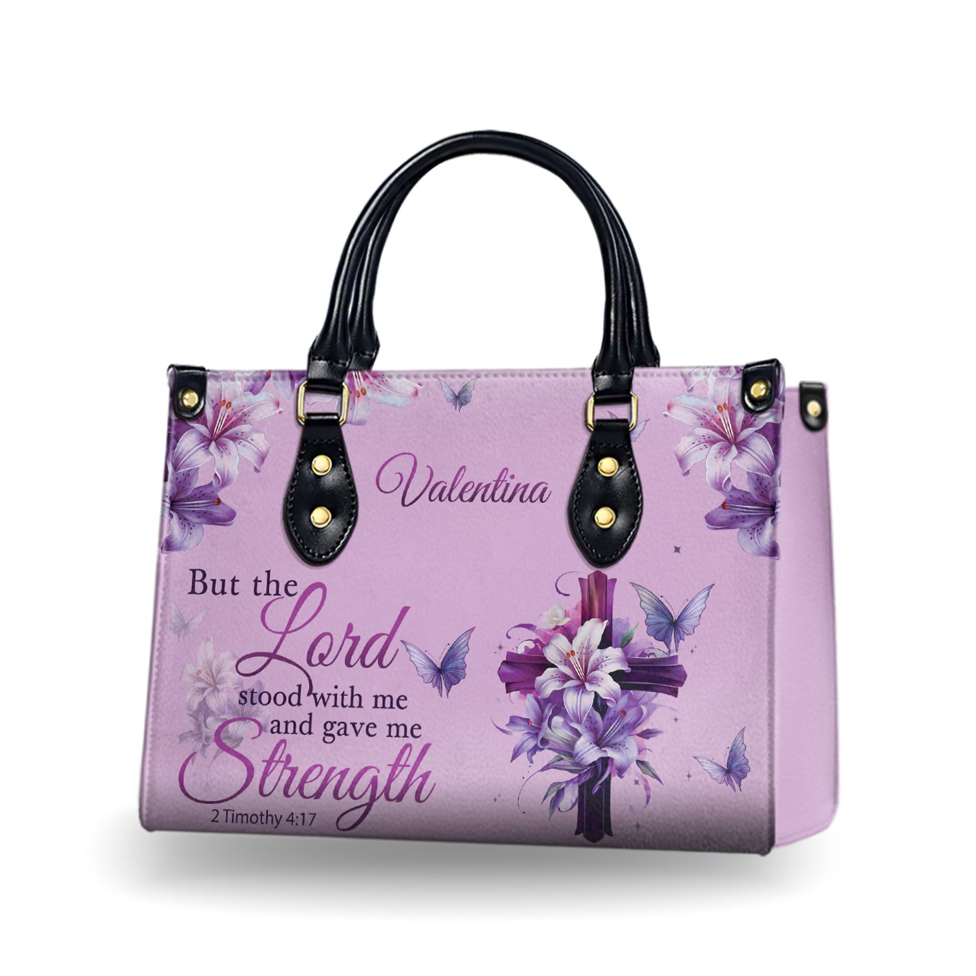 HB65-custom name christian handbag for women, lavender cross floral purse with butterflies, 2 timothy 4 17 verse the lord gave me strength bag