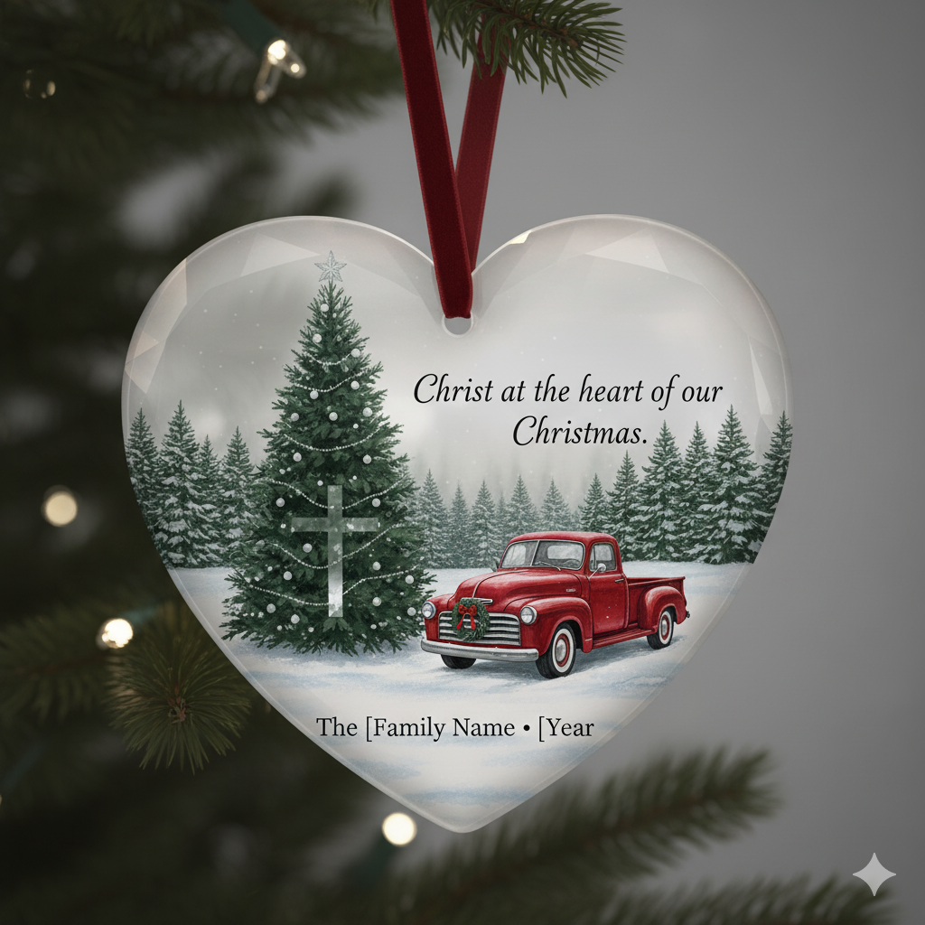 Featuring a classic red truck design surrounded by Christmas trees and a glowing cross, this ornament beautifully reminds us of the true reason for the season — keeping Christ at the heart of every celebration.