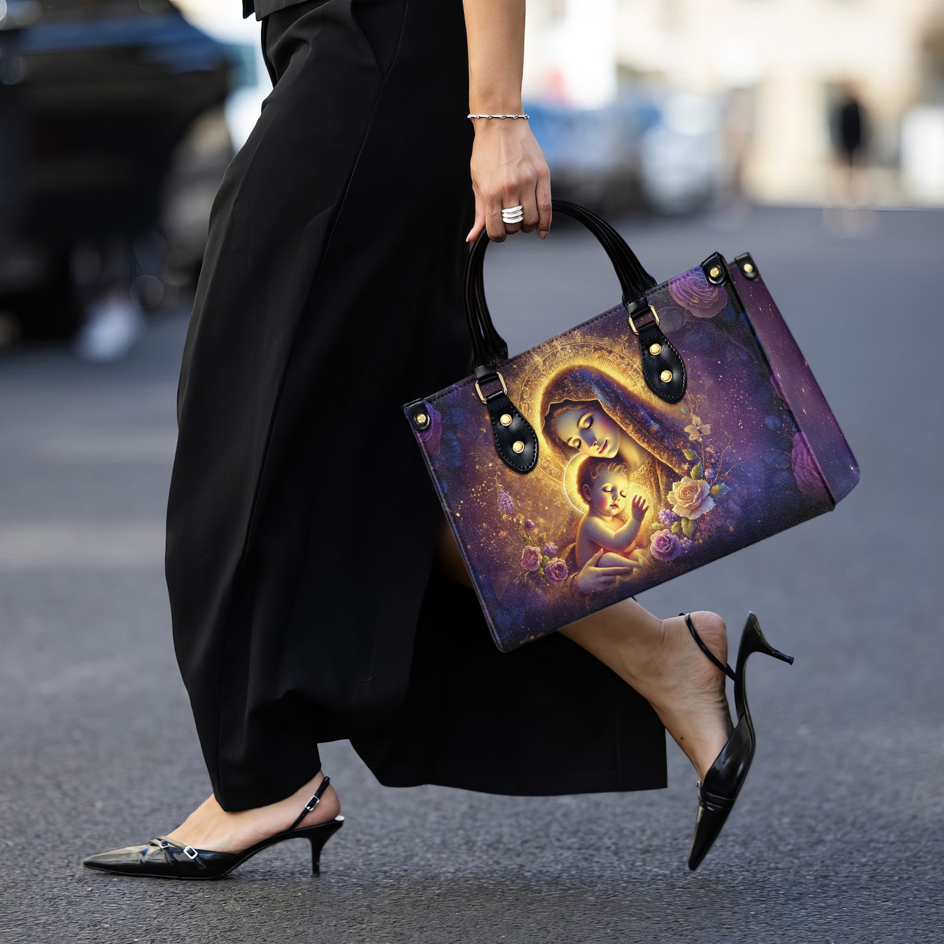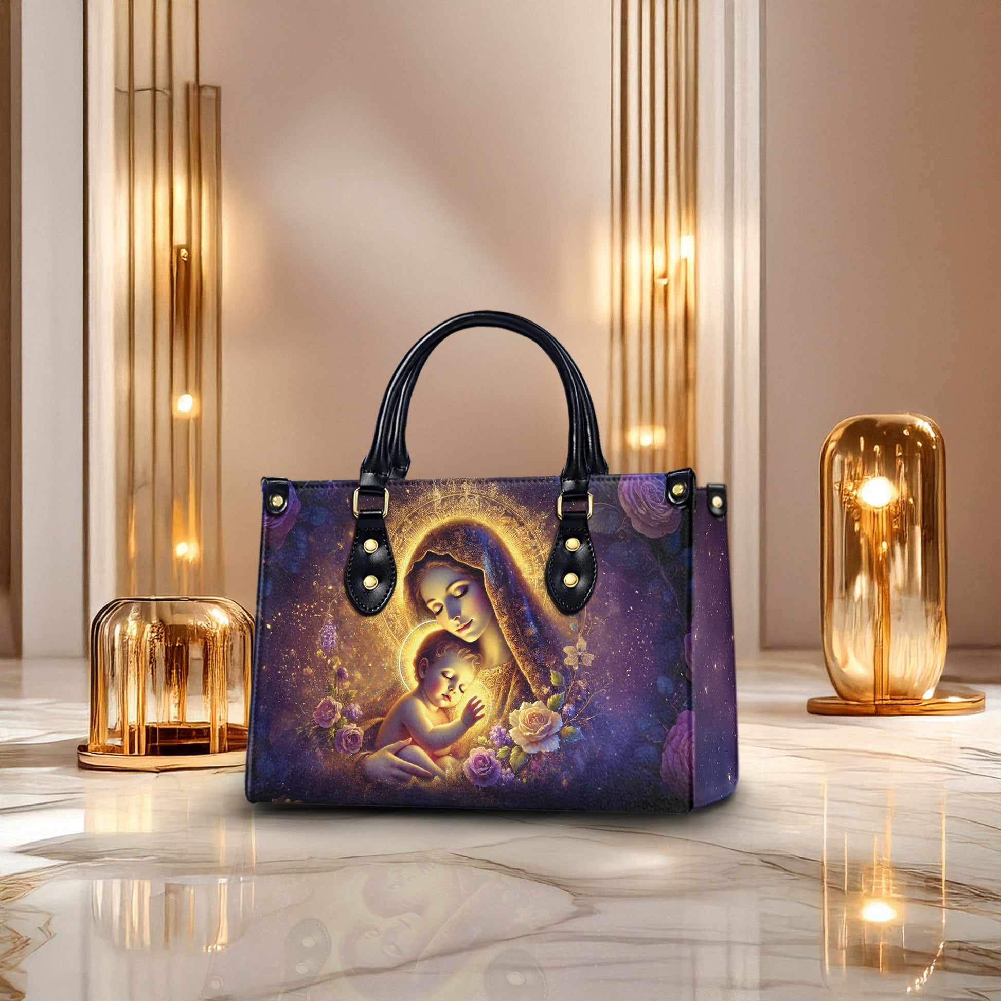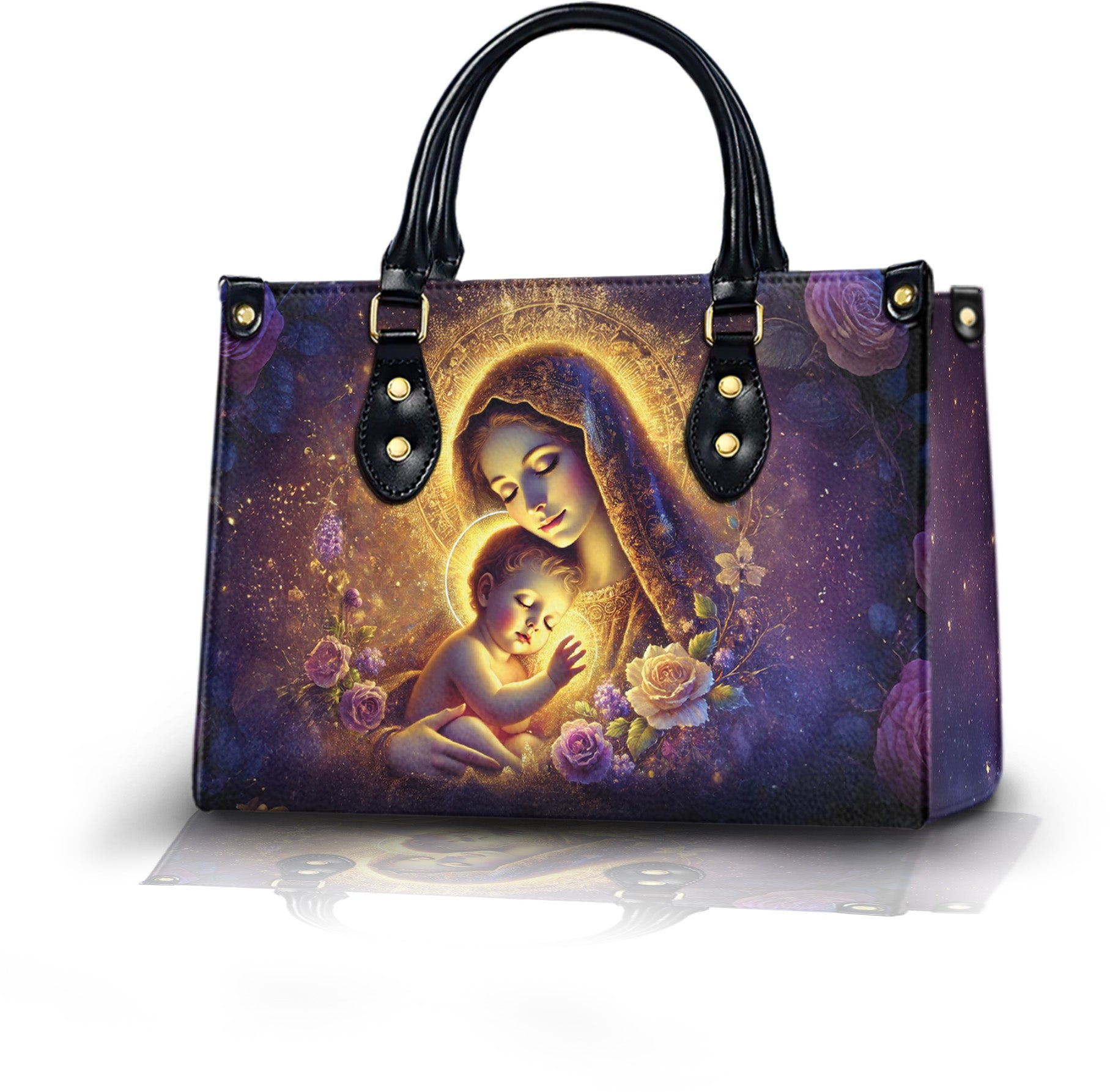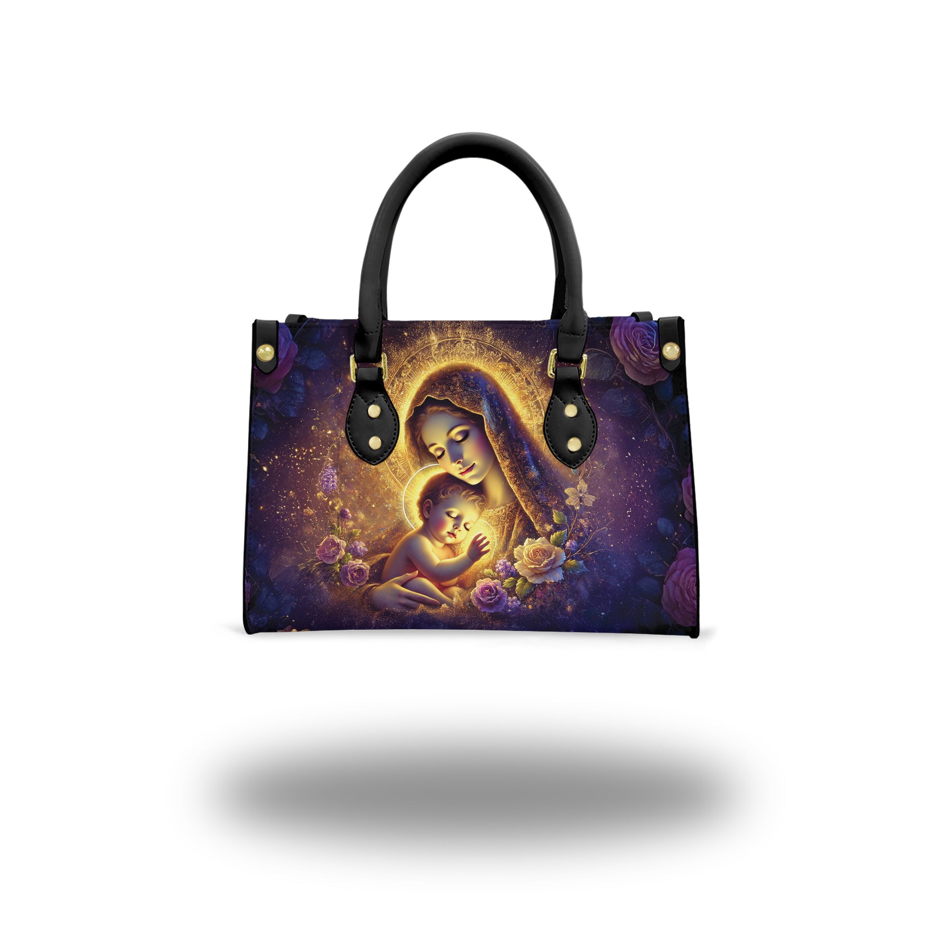 Celebrate the divine love of a mother and child with this beautifully designed handbag featuring the image of the Blessed Virgin Mary cradling baby Jesus. A stunning tribute to faith, motherhood, and spiritual grace, this bag makes a thoughtful gift for Christian women who carry their beliefs with pride.