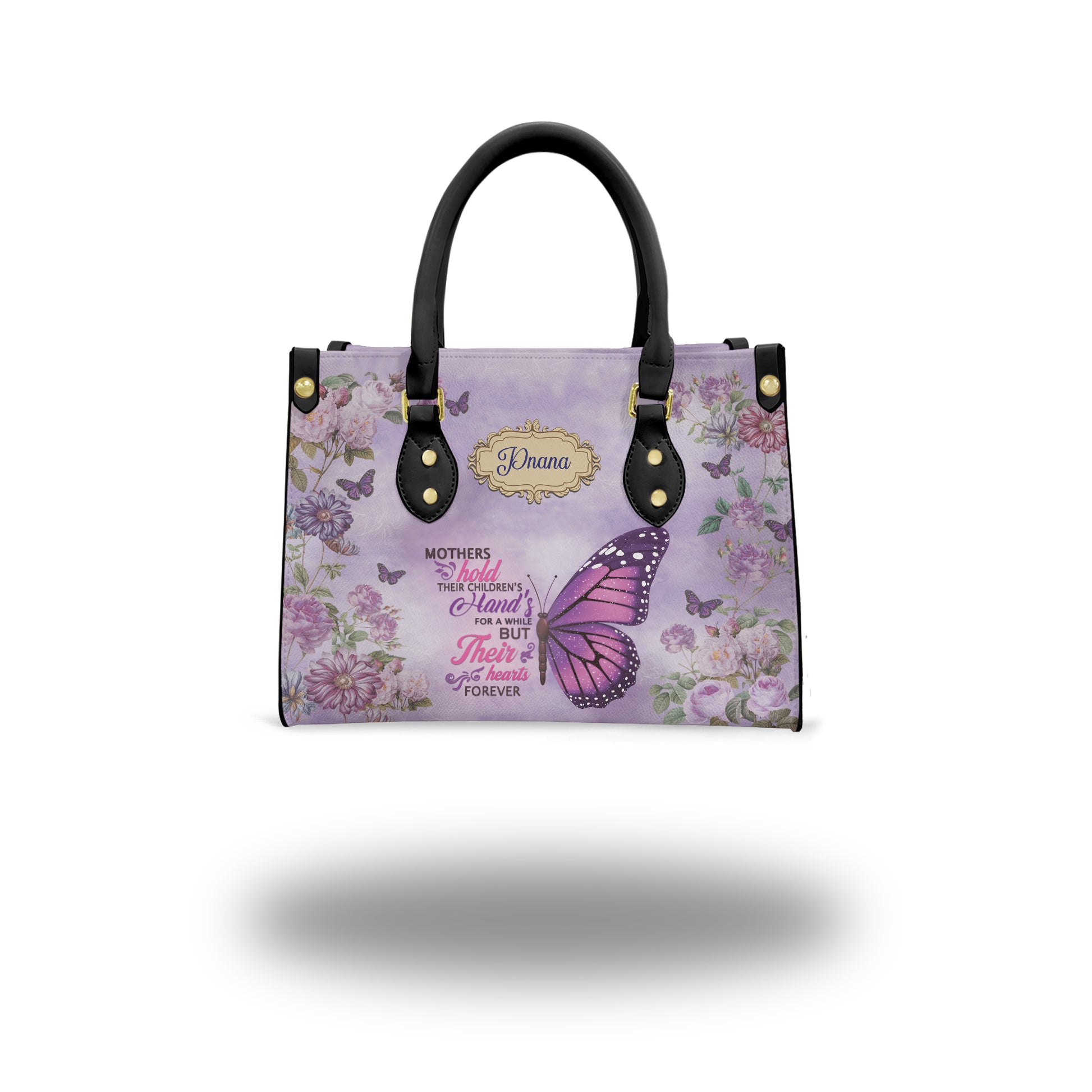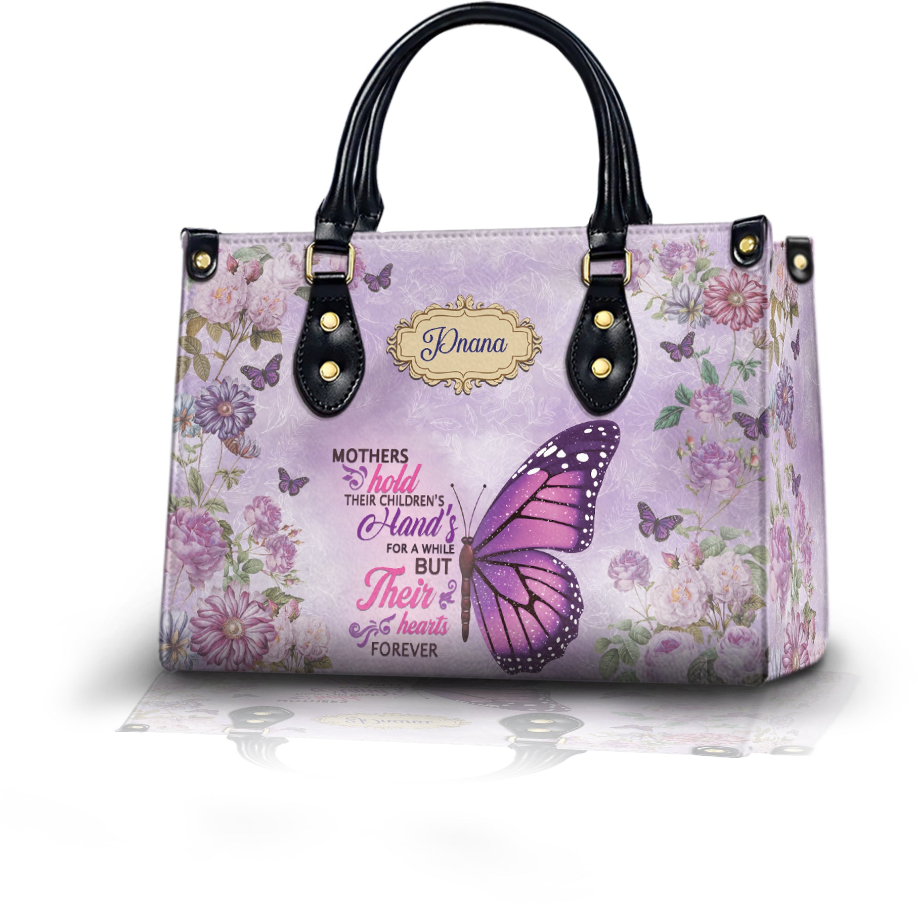 HB88 - Personalized Mom Butterfly Handbag – Mothers Hold Their Children's Hand But Heart Forever – Floral Christian Gift for Her