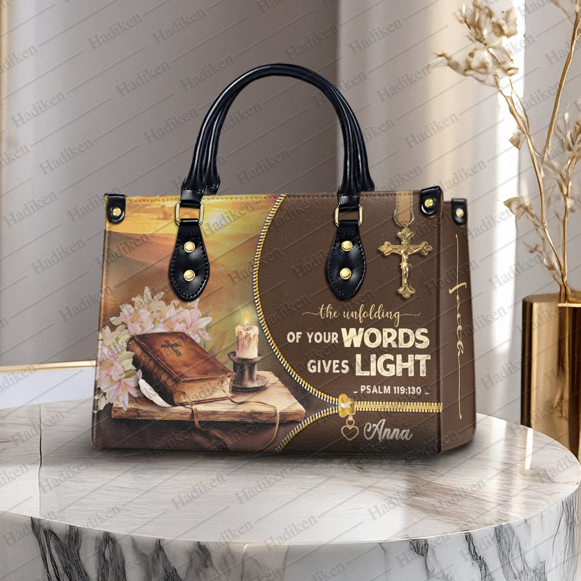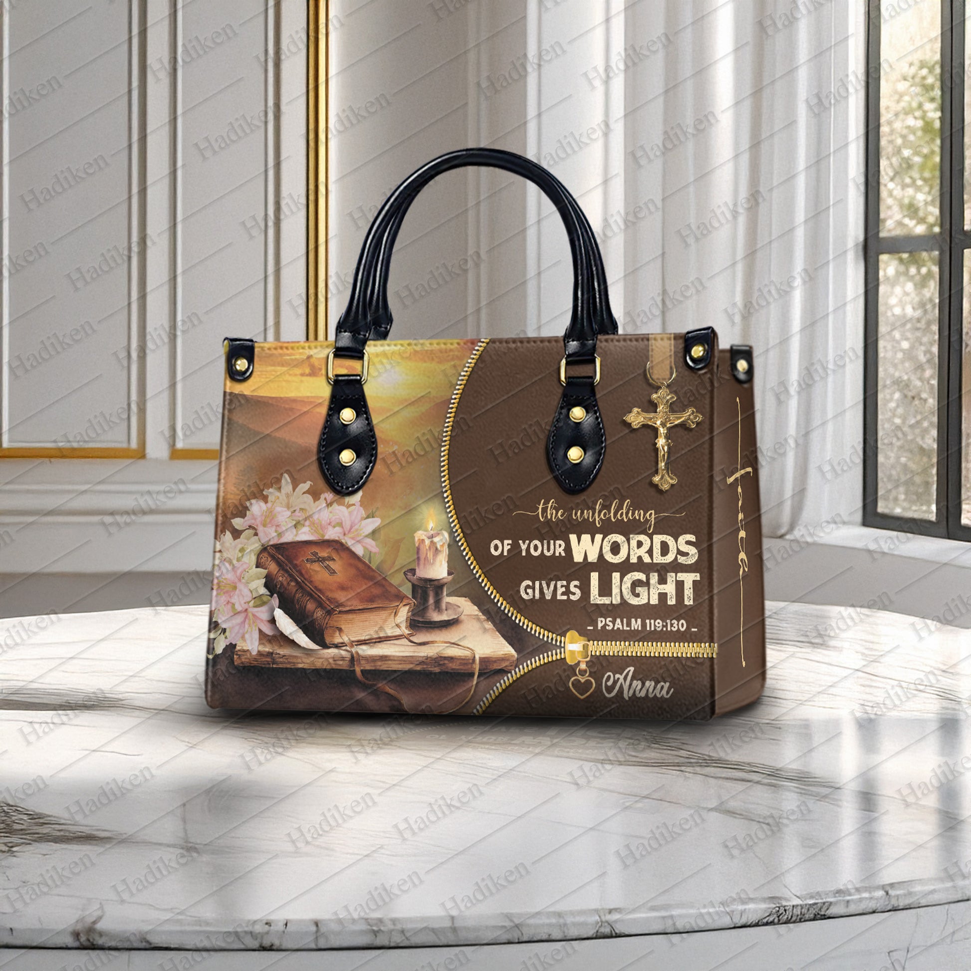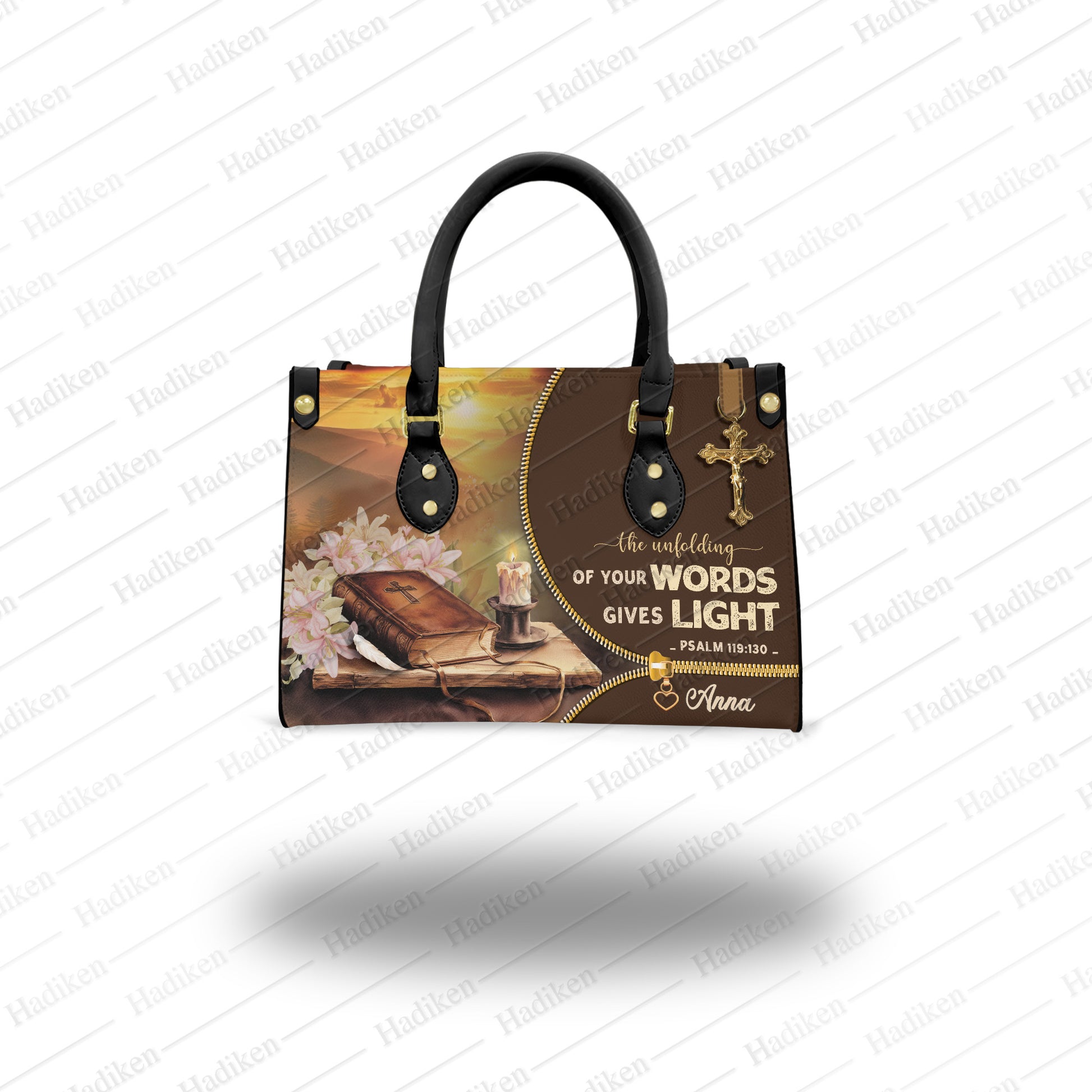 HB94 - Custom Christian Handbag – Psalm 119:130 Scripture Purse, Faith-Based Tote Bag, Personalized Religious Gift for Women