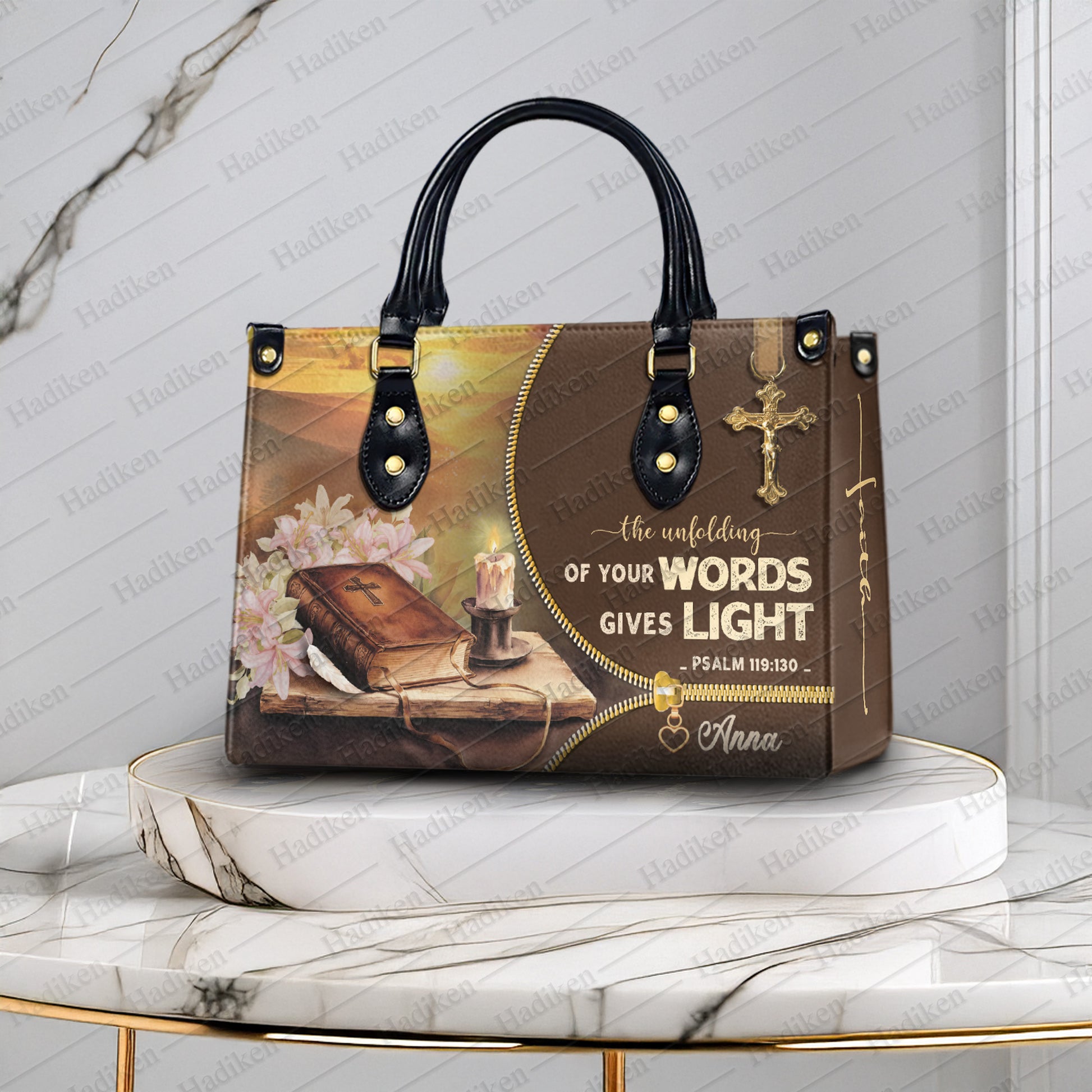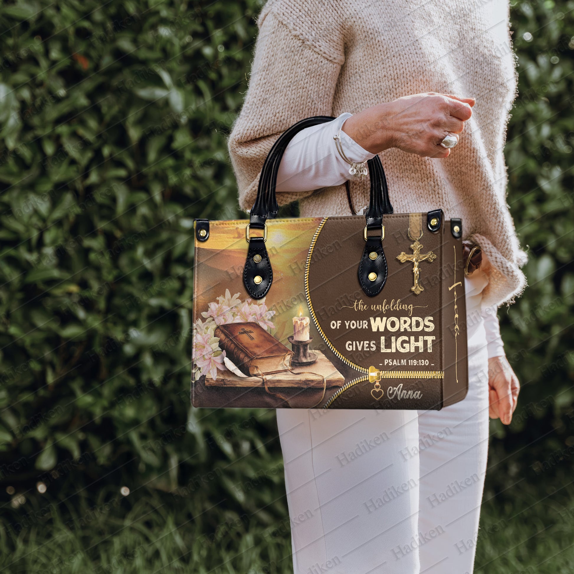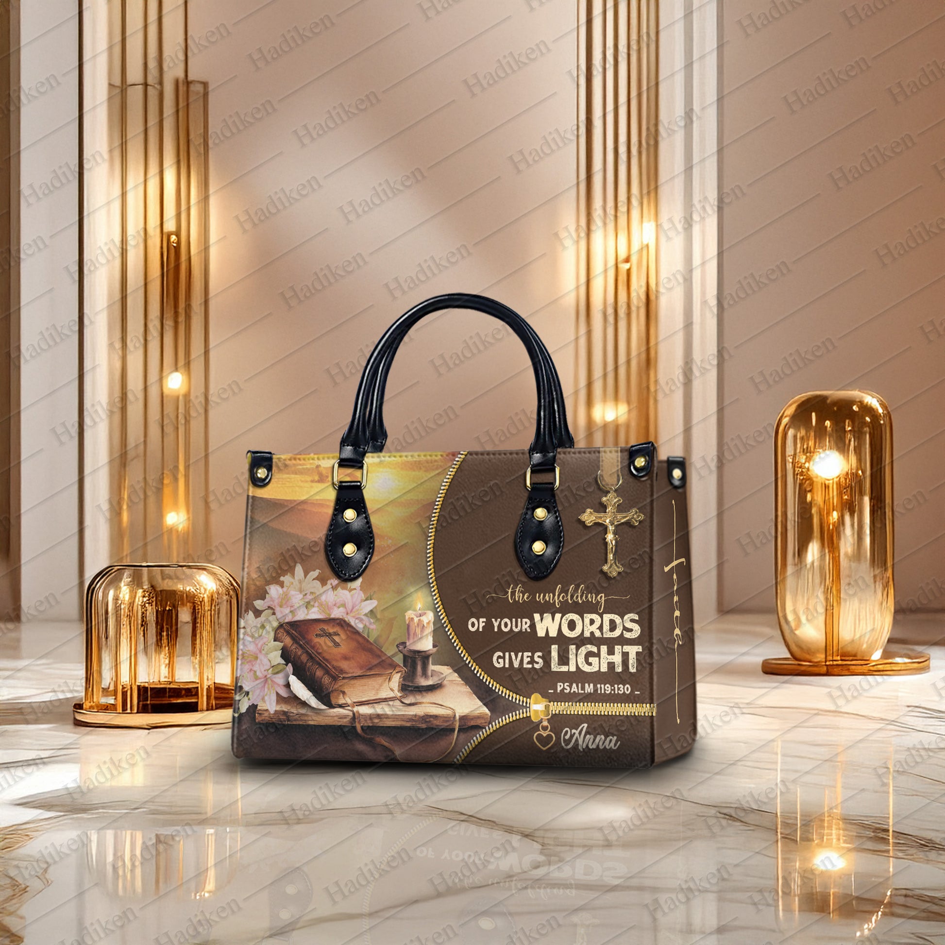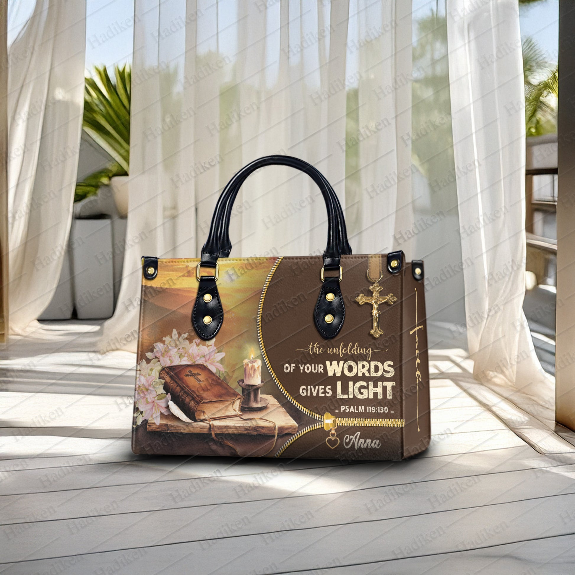 HB94 - Custom Christian Handbag – Psalm 119:130 Scripture Purse, Faith-Based Tote Bag, Personalized Religious Gift for Women