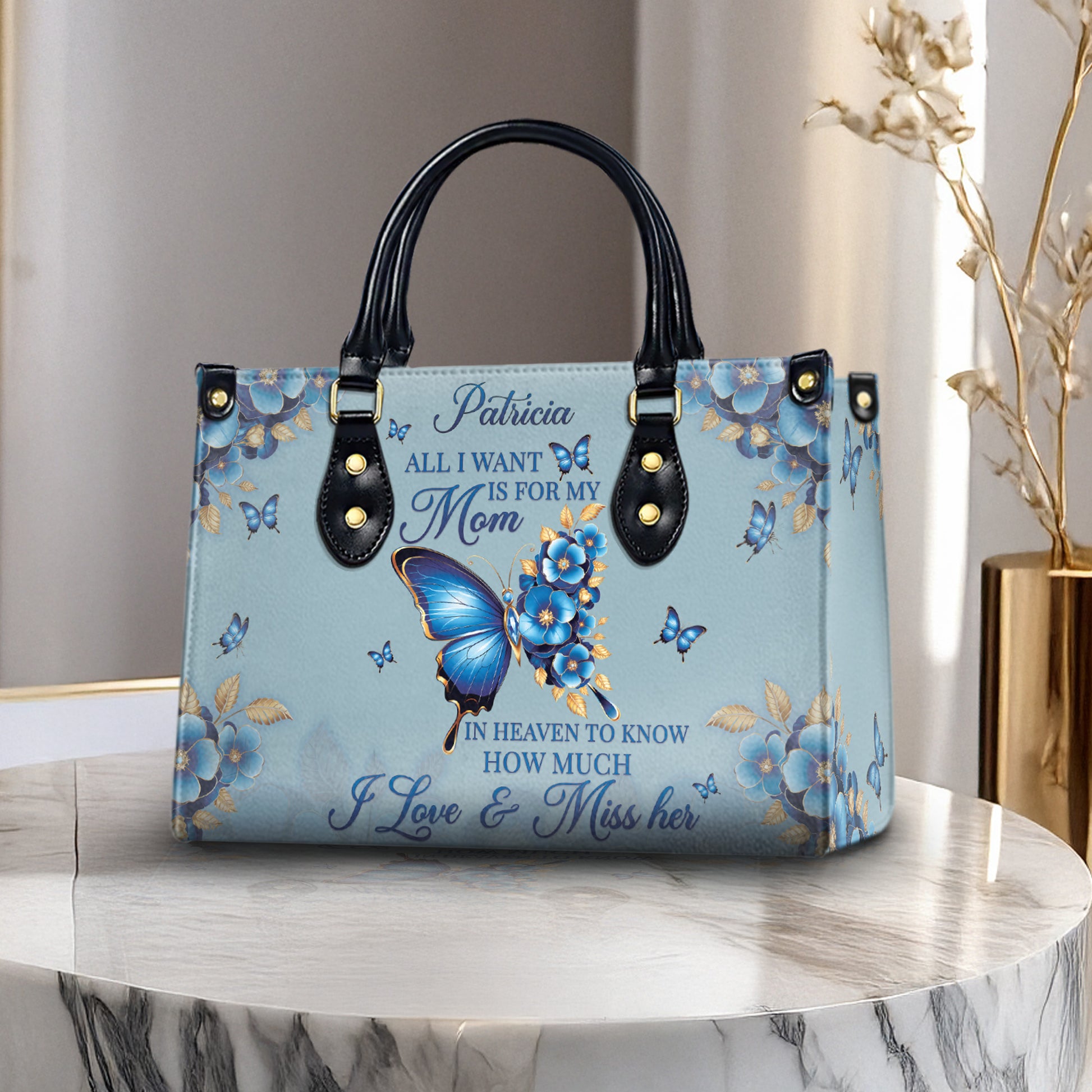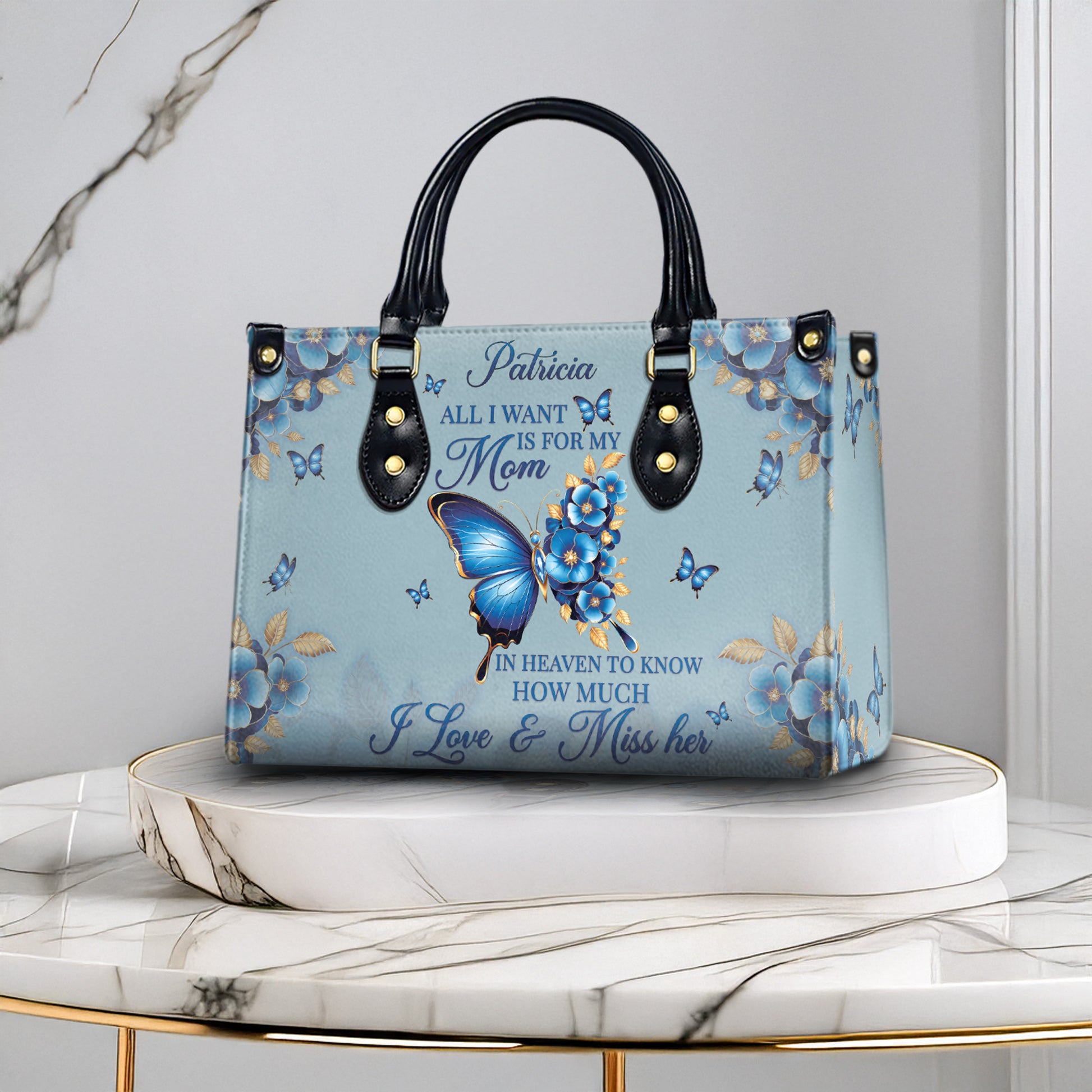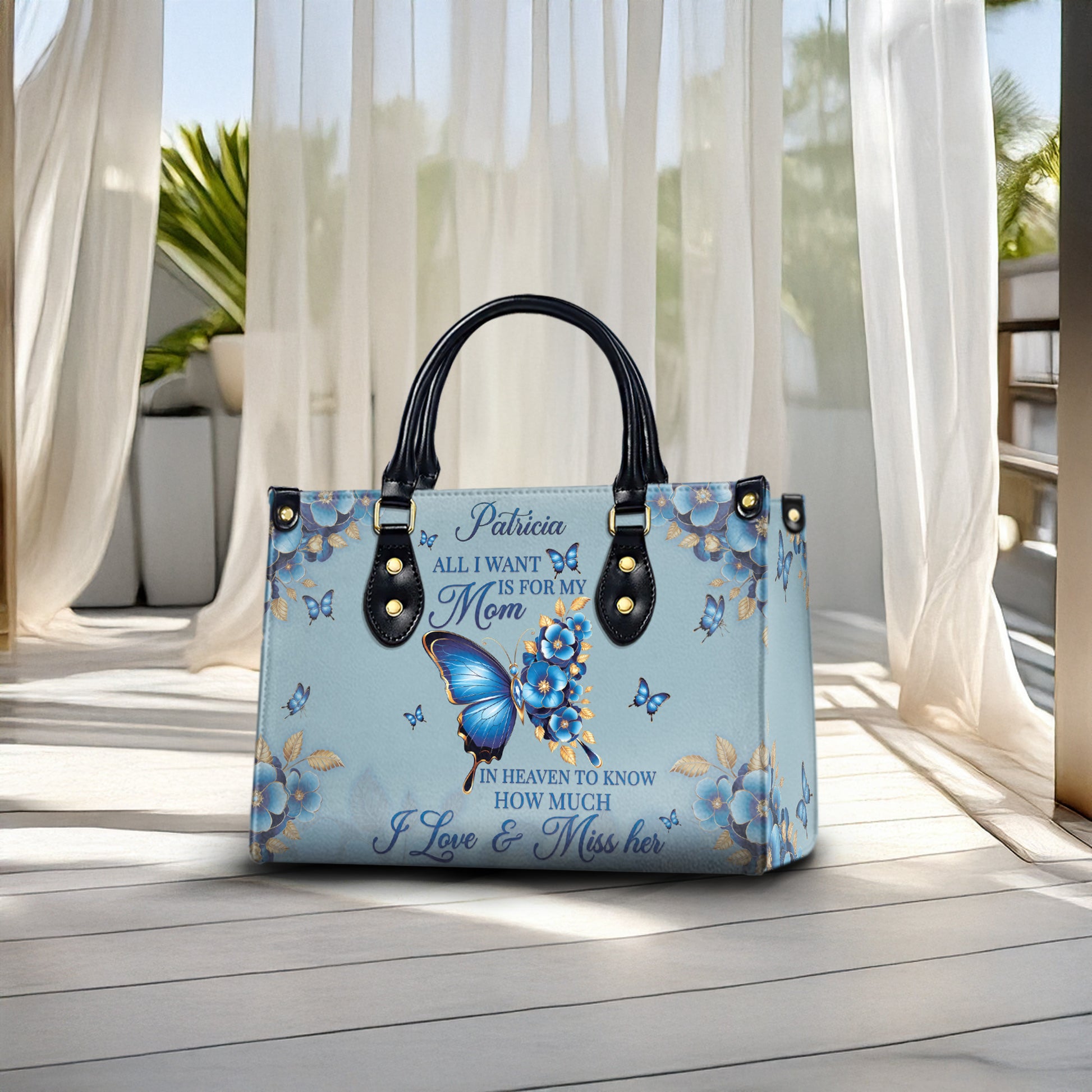 HB16-Custom Name Memorial Leather Handbag – "All I Want is for My Mom in Heaven" , Personalized Butterfly Handbag, Sympathy Gift for