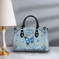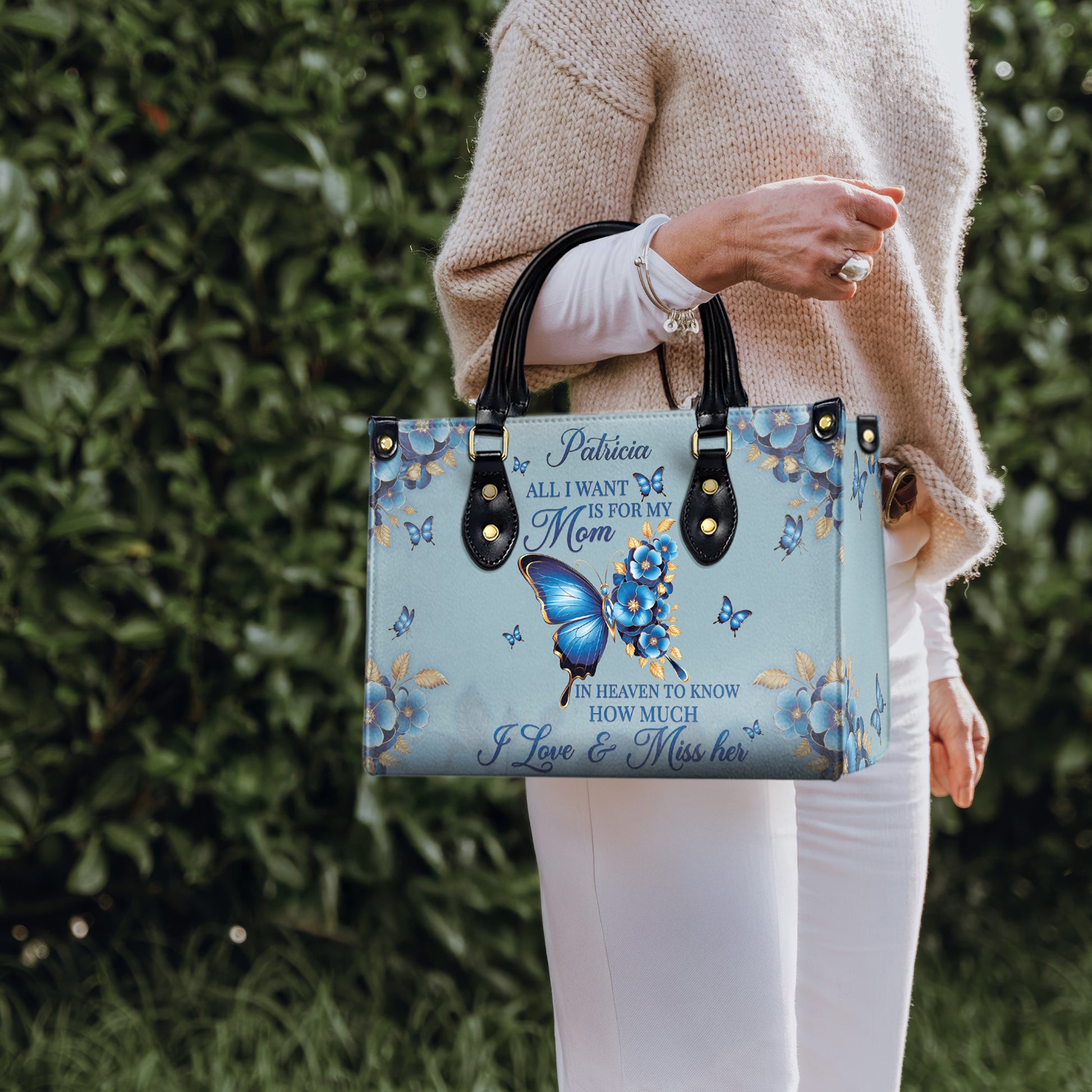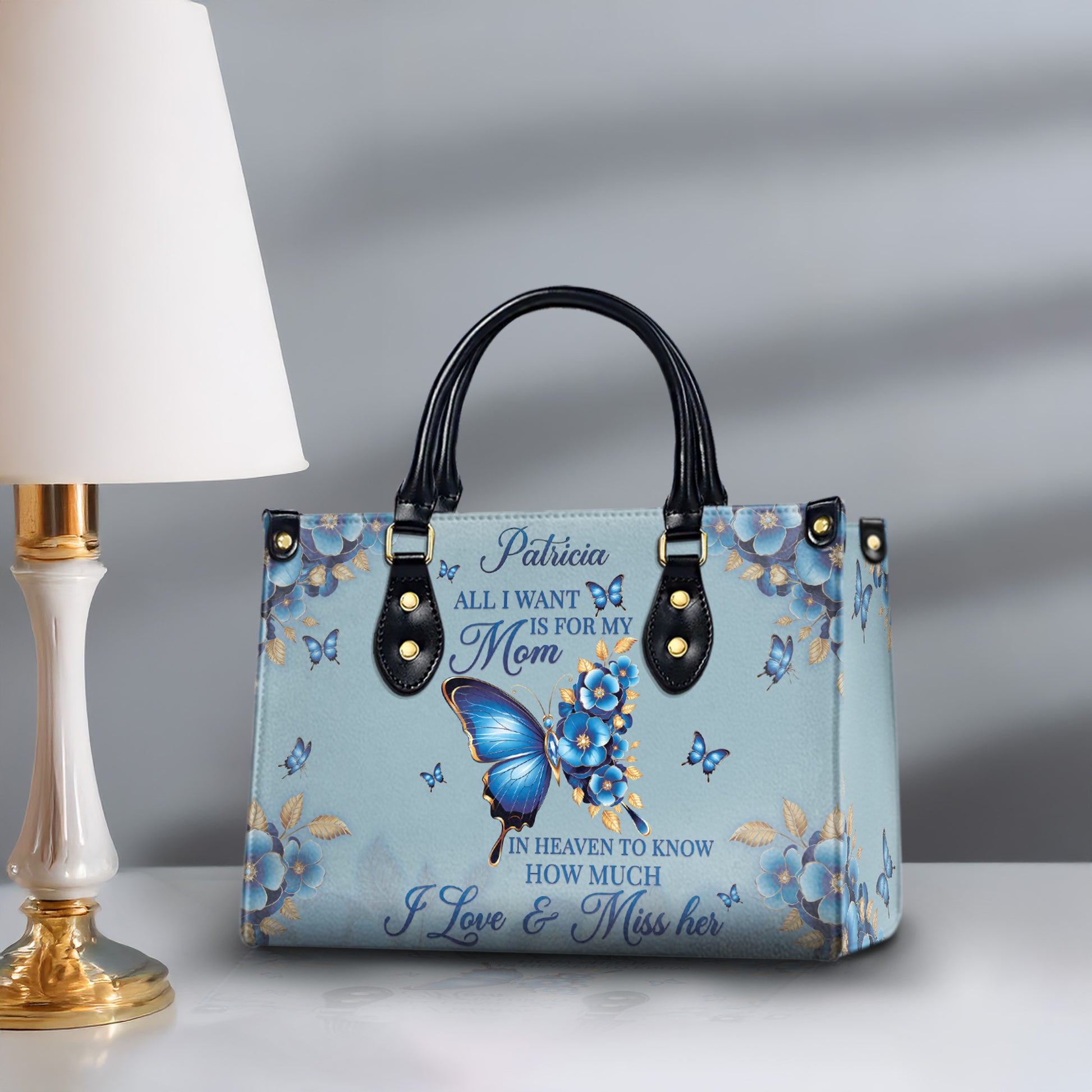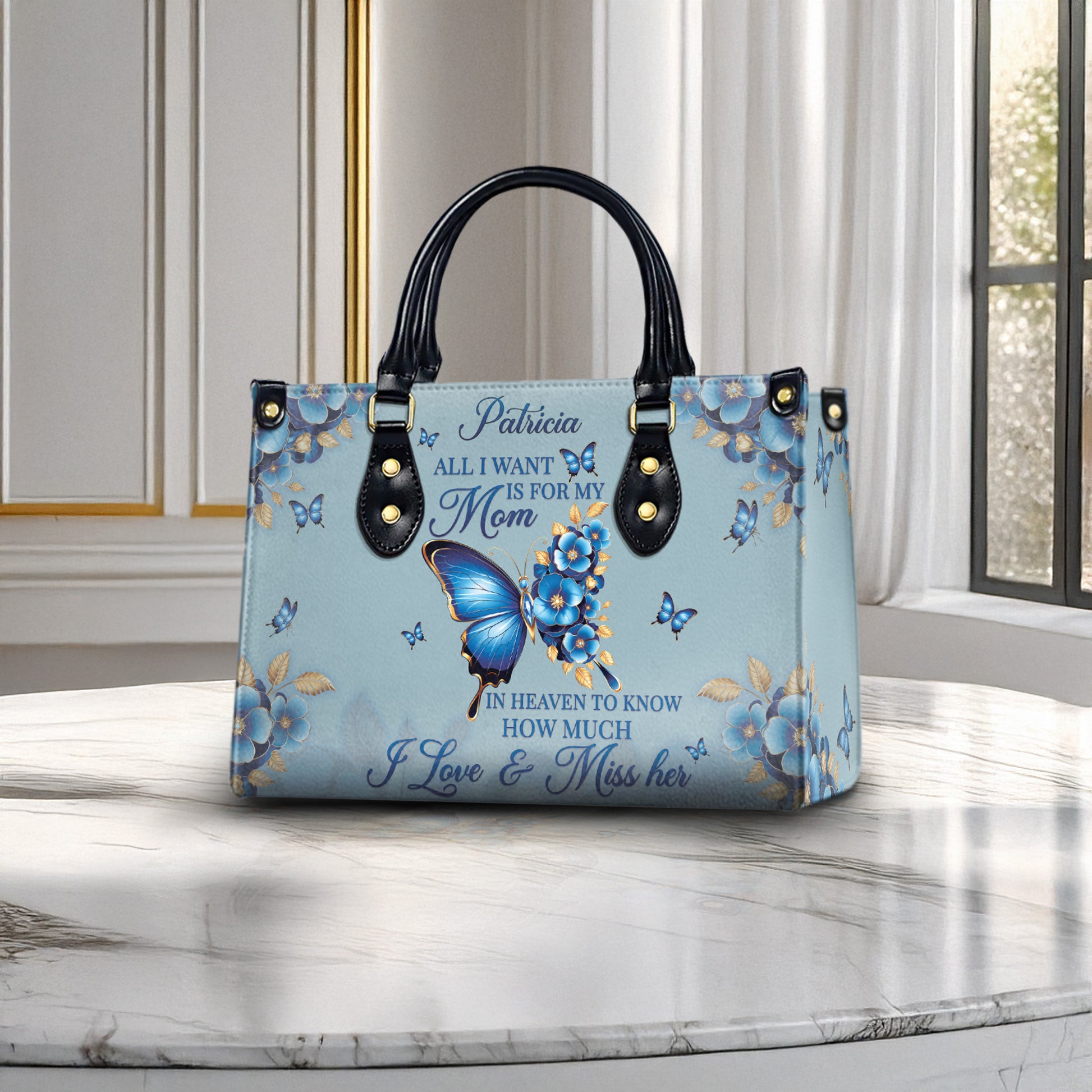 HB16-Custom Name Memorial Leather Handbag – "All I Want is for My Mom in Heaven" , Personalized Butterfly Handbag, Sympathy Gift for