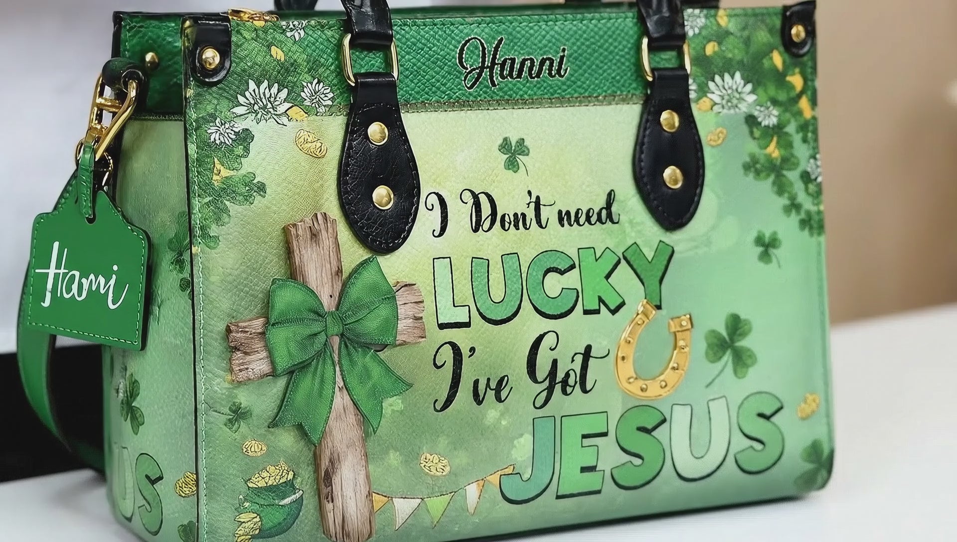Personalized 'I Don’t Need Lucky, I’ve Got Jesus' Handbag – Custom Name, Inspirational Christian Gift with Shamrock and Horseshoe Design|HB77