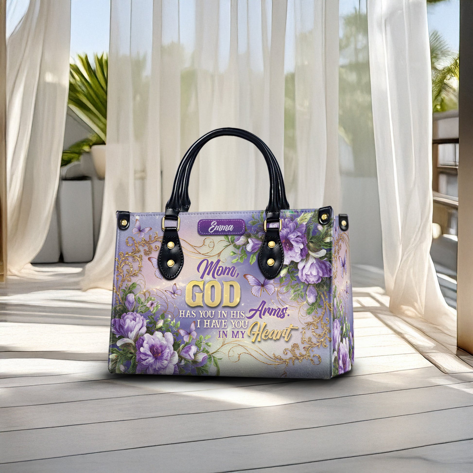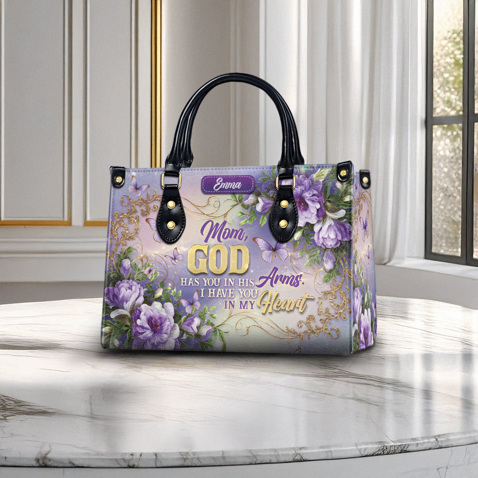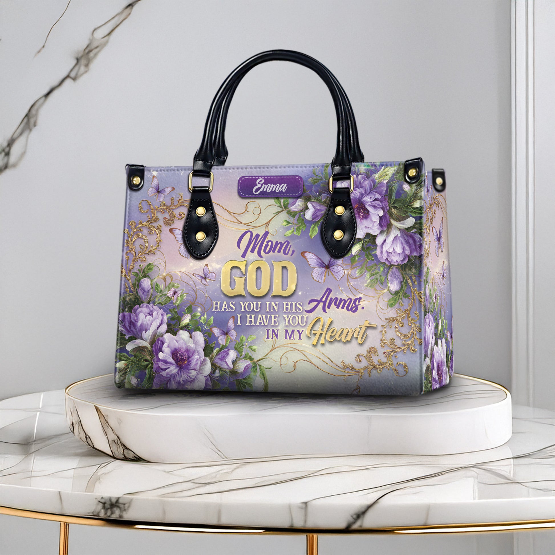 HB87 - Custom Name Christian Handbag – Mom God Has You In His Arms, Floral Faith Leather Purse, Religious Gift for Women