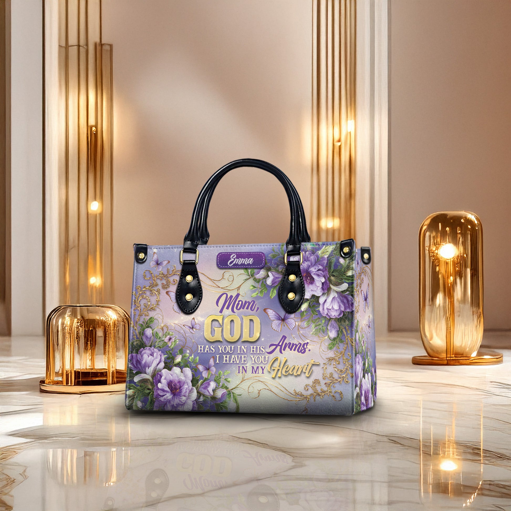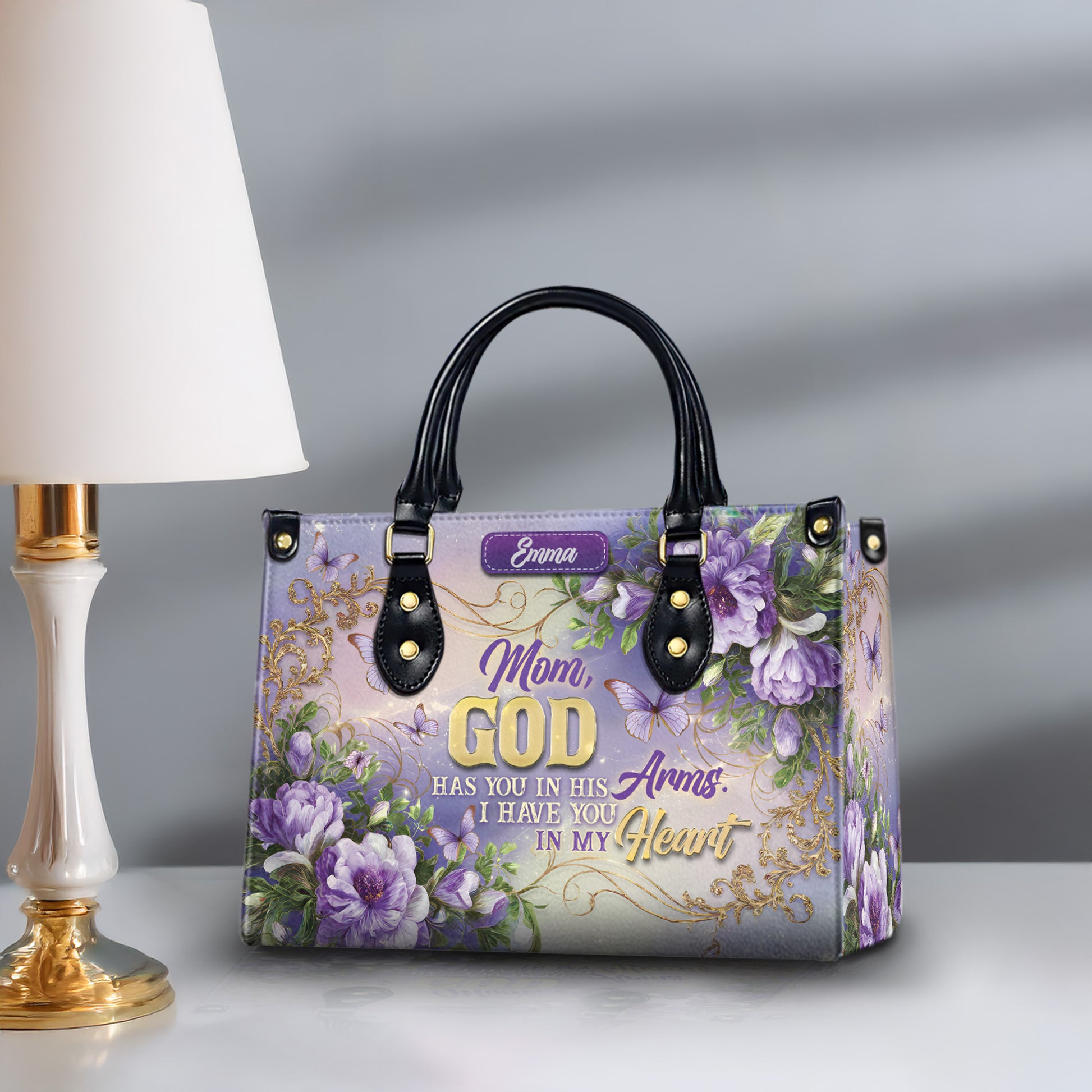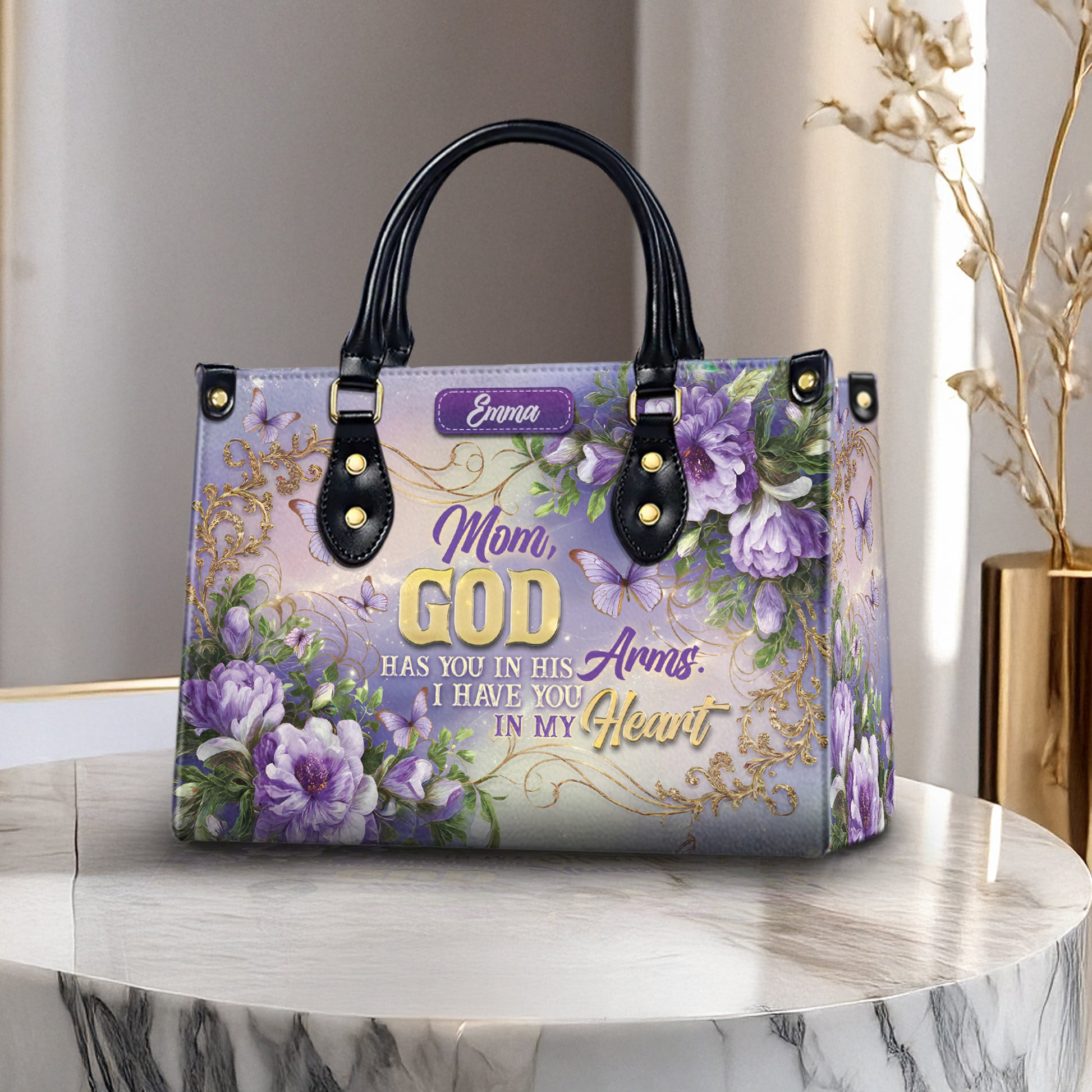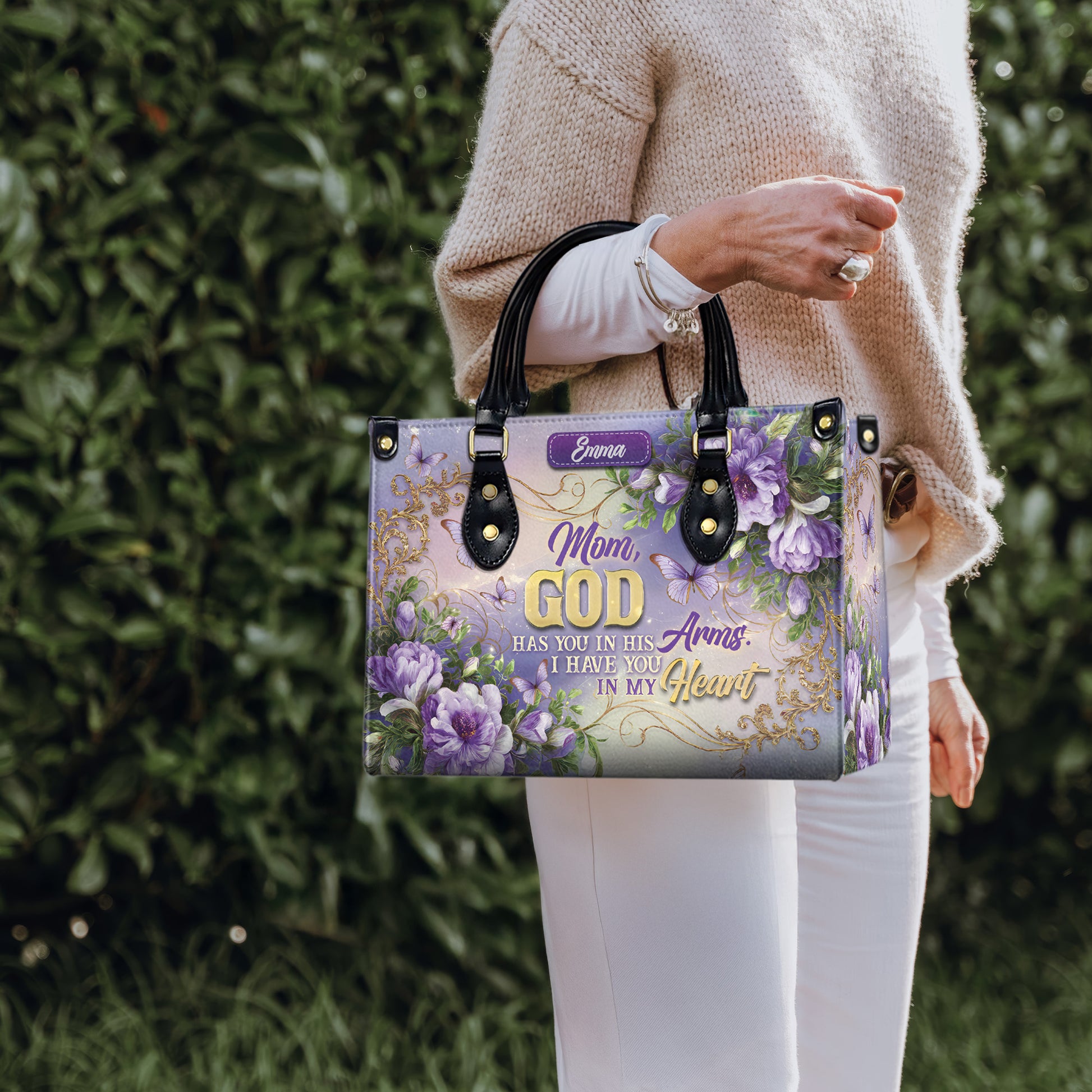 HB87 - Custom Name Christian Handbag – Mom God Has You In His Arms, Floral Faith Leather Purse, Religious Gift for Women