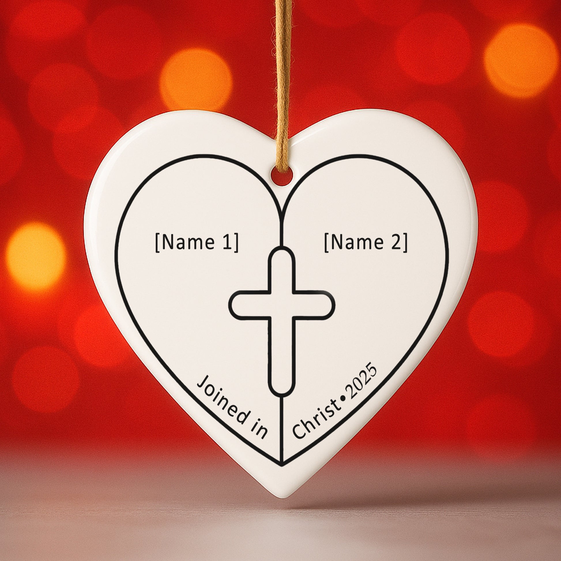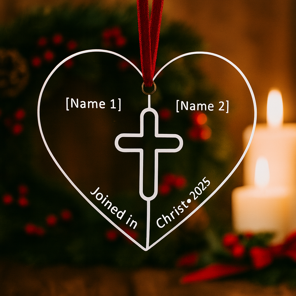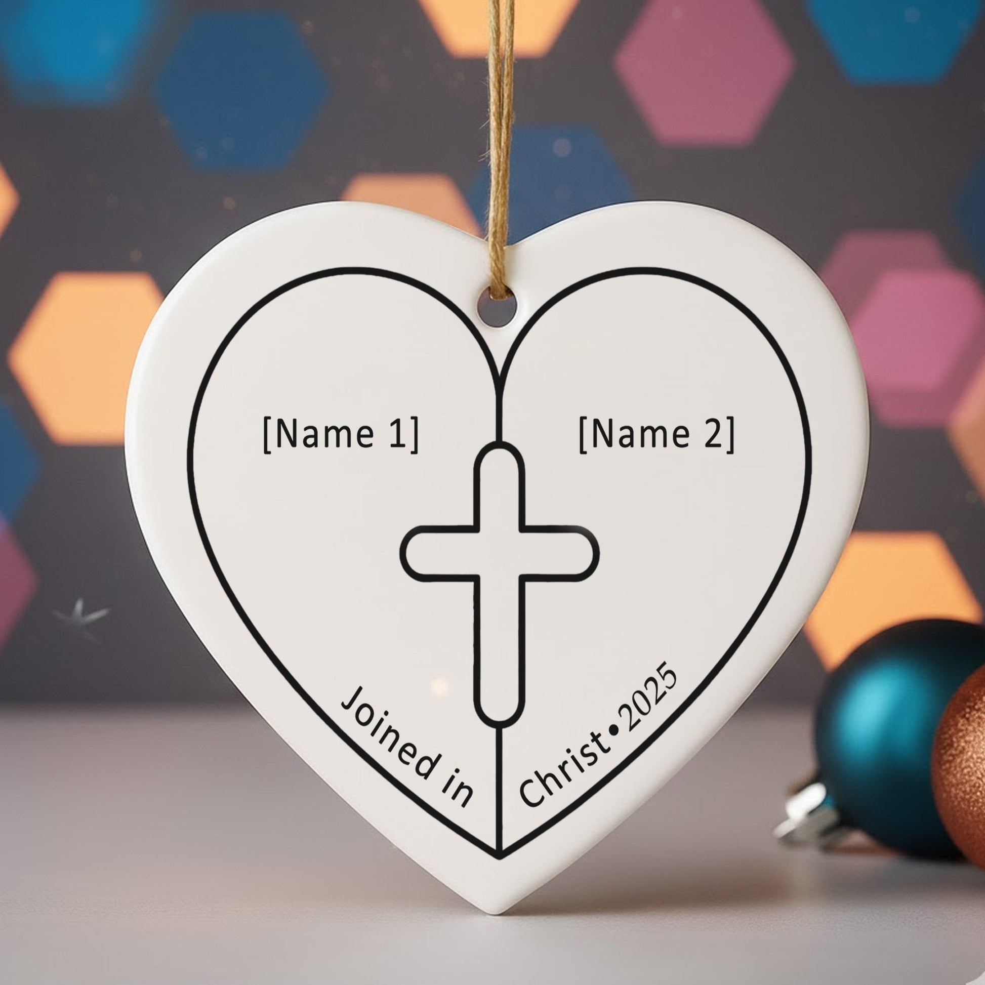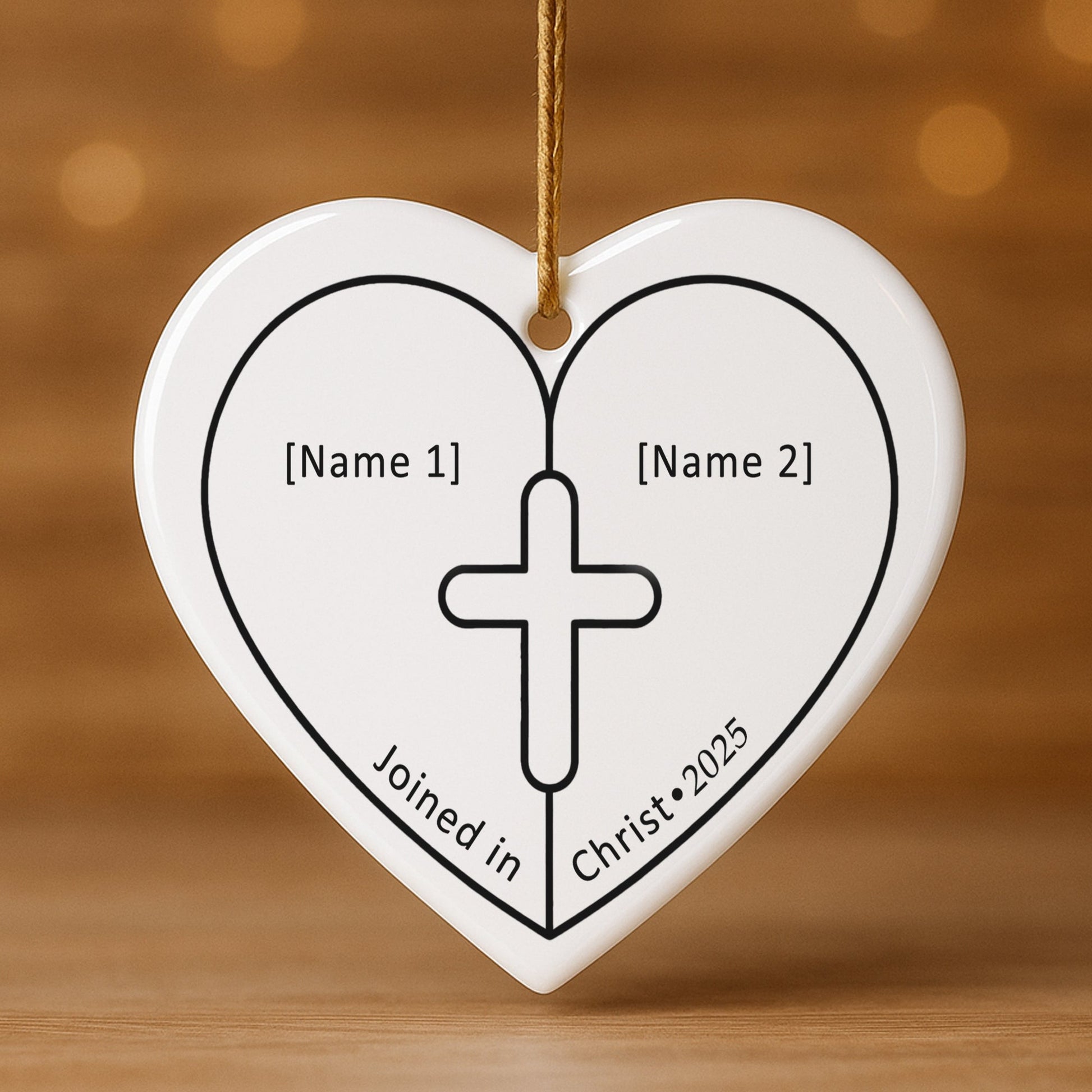 This personalized heart ornament beautifully symbolizes two hearts joined through faith — featuring your names and the phrase “Joined in Christ 2025.”