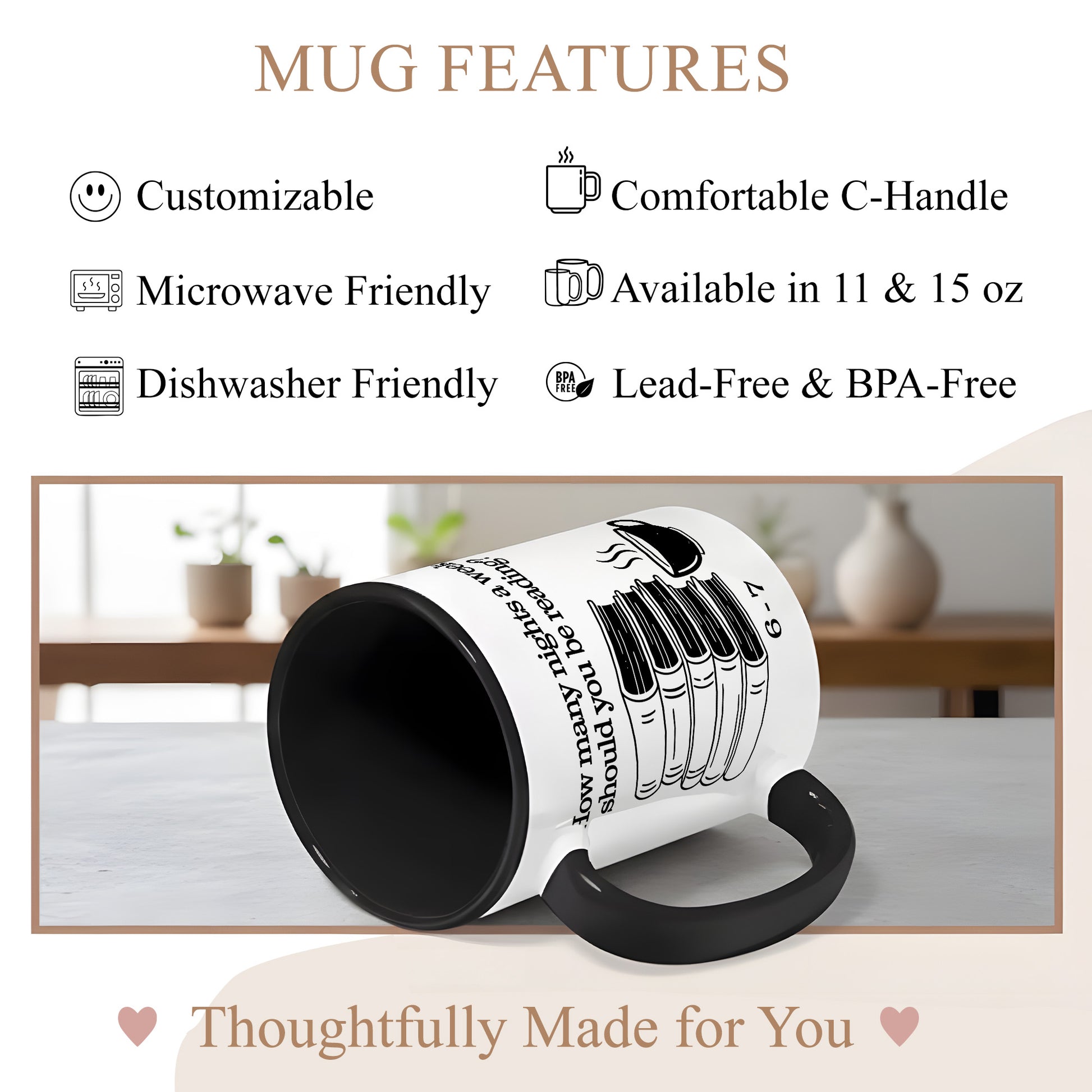 Design: Bold white print on a black mug featuring a stack of books and a cup