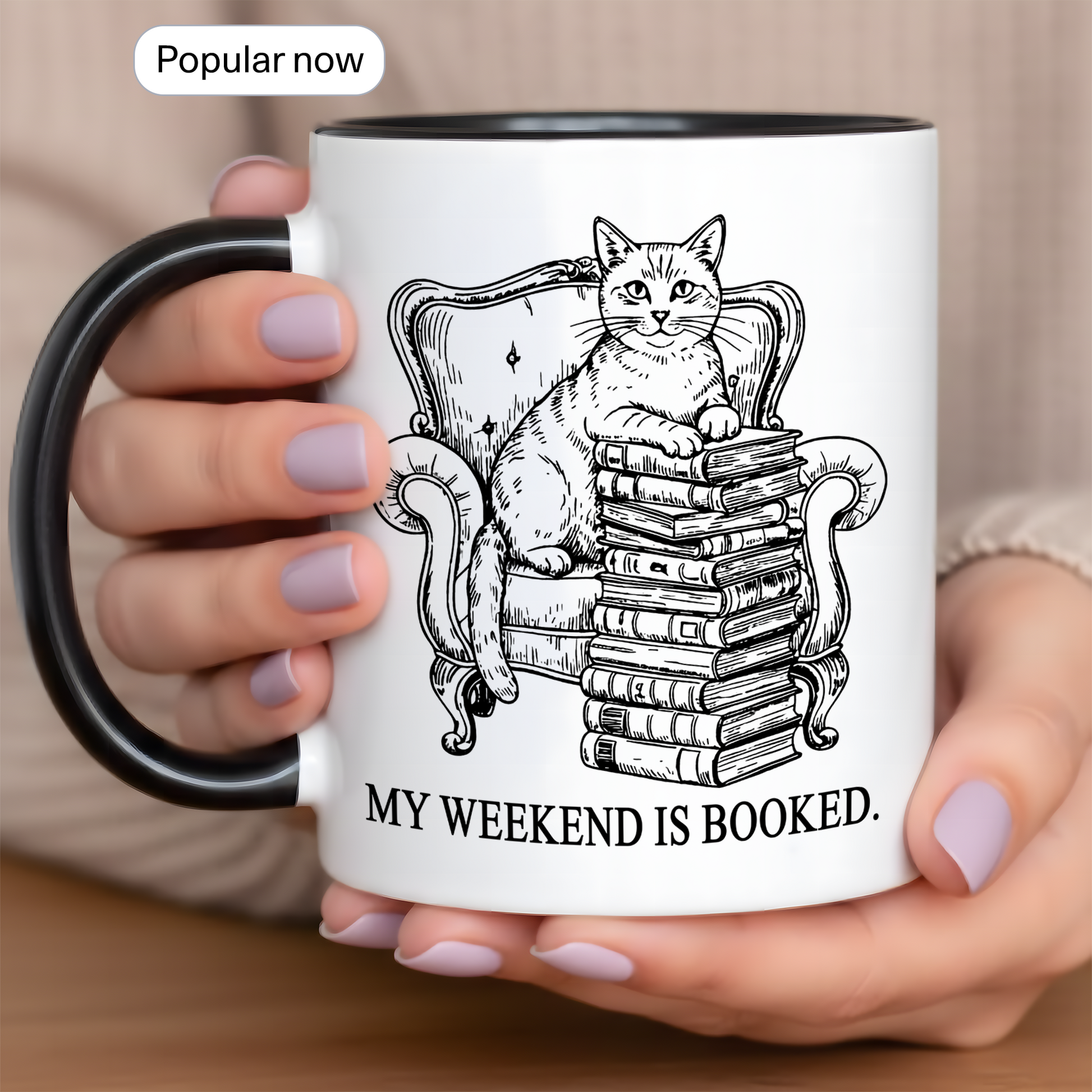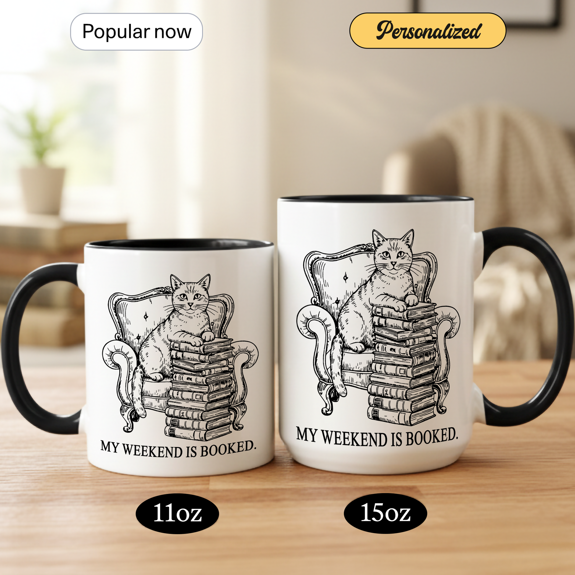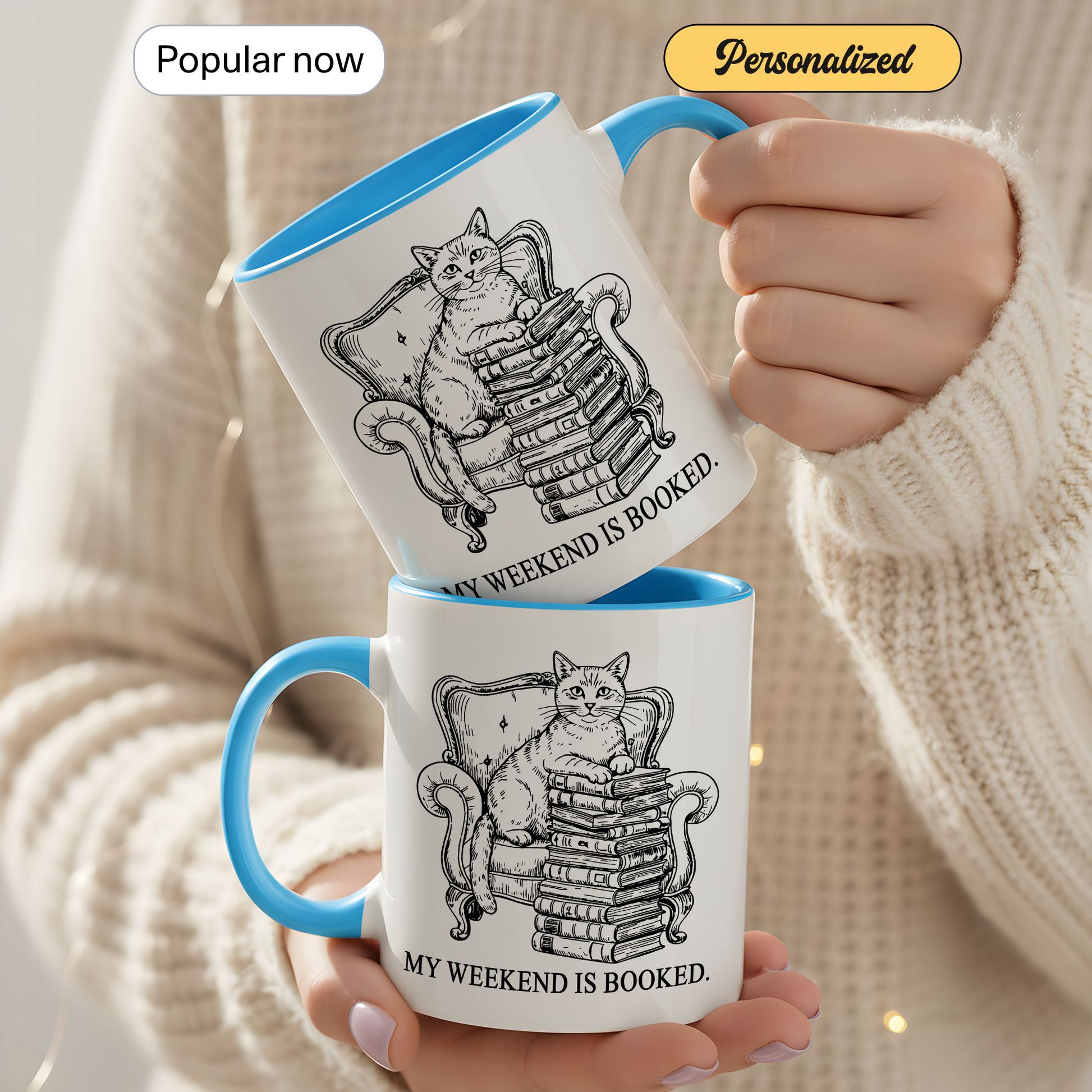 Funny Cat Reading Mug – “My Weekend Is Booked” Coffee Cup | Cute Book Lover Gift for Readers, Bookworms & Cat Owners| Mug 135