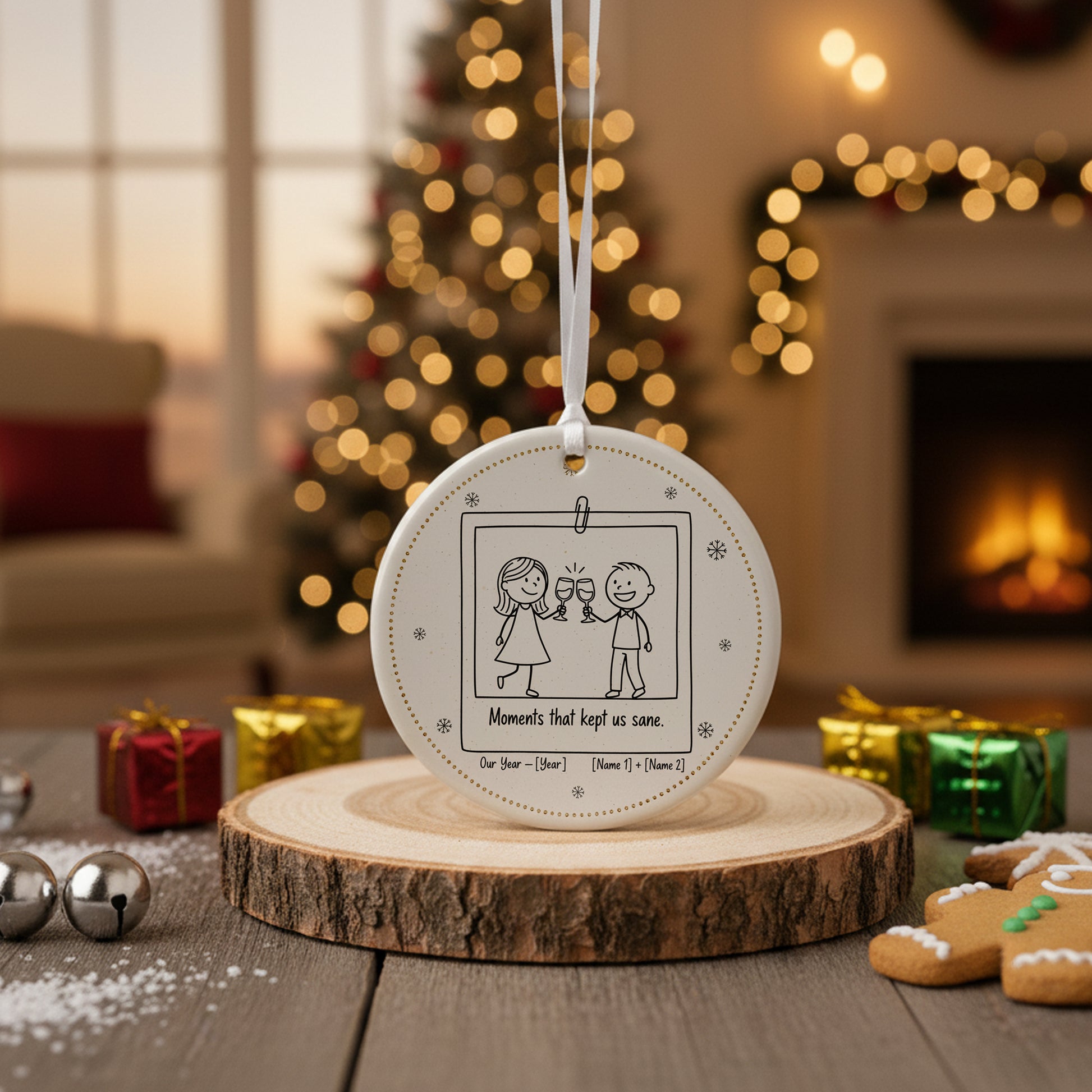Celebrate the laughter, love, and friendship that got you through the year with this Personalized “Moments That Kept Us Sane” Ceramic Ornament. Perfect for best friends, couples, or coworkers, this ornament captures the humor and warmth of your most cherished memories together.