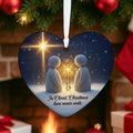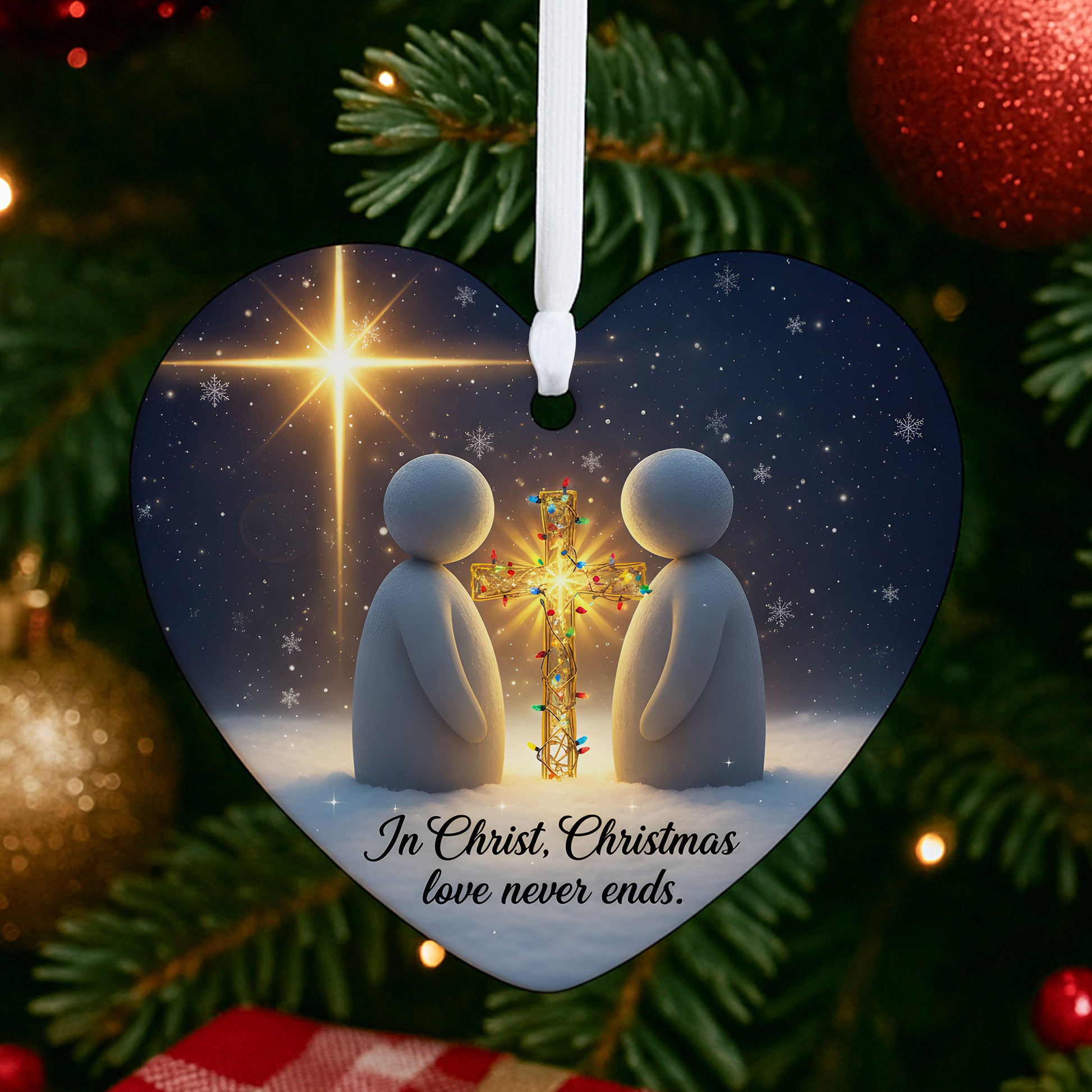 Celebrate the true meaning of Christmas with this In Christ, Christmas Love Never Ends Heart Ornament — a beautiful reminder that faith and love never fade. This elegant ceramic ornament features two figures kneeling by a glowing cross beneath a starry night sky, symbolizing eternal love, peace, and devotion to Christ.