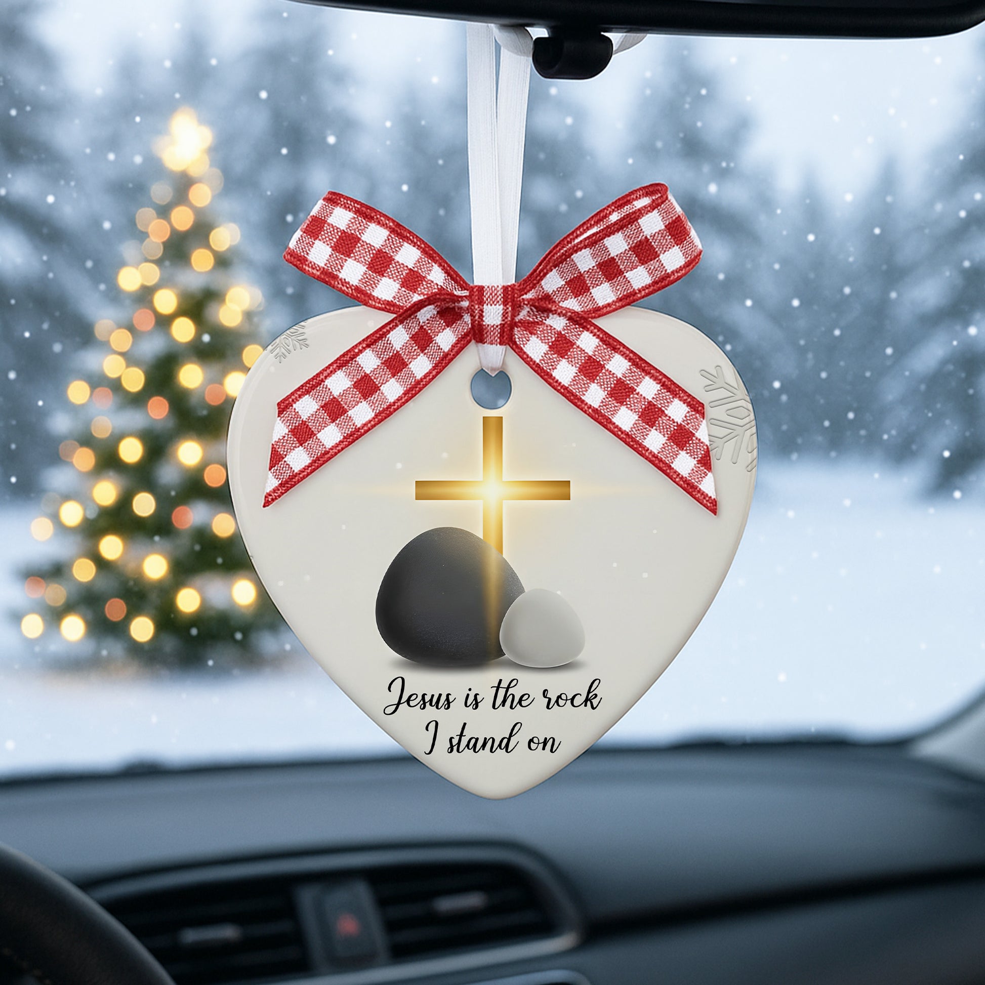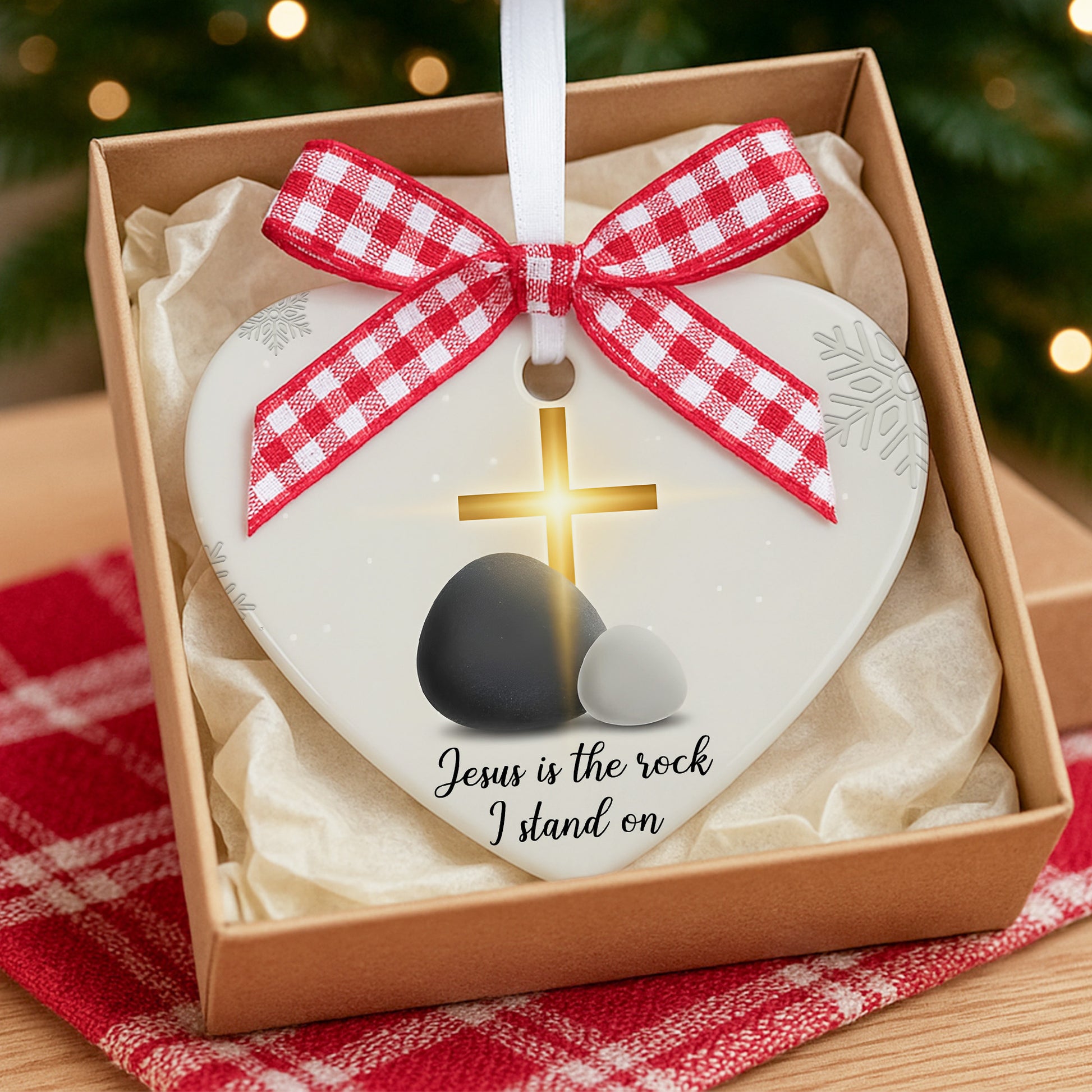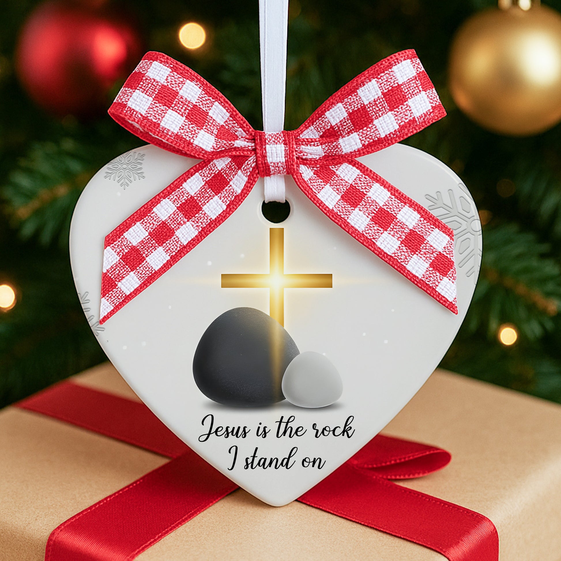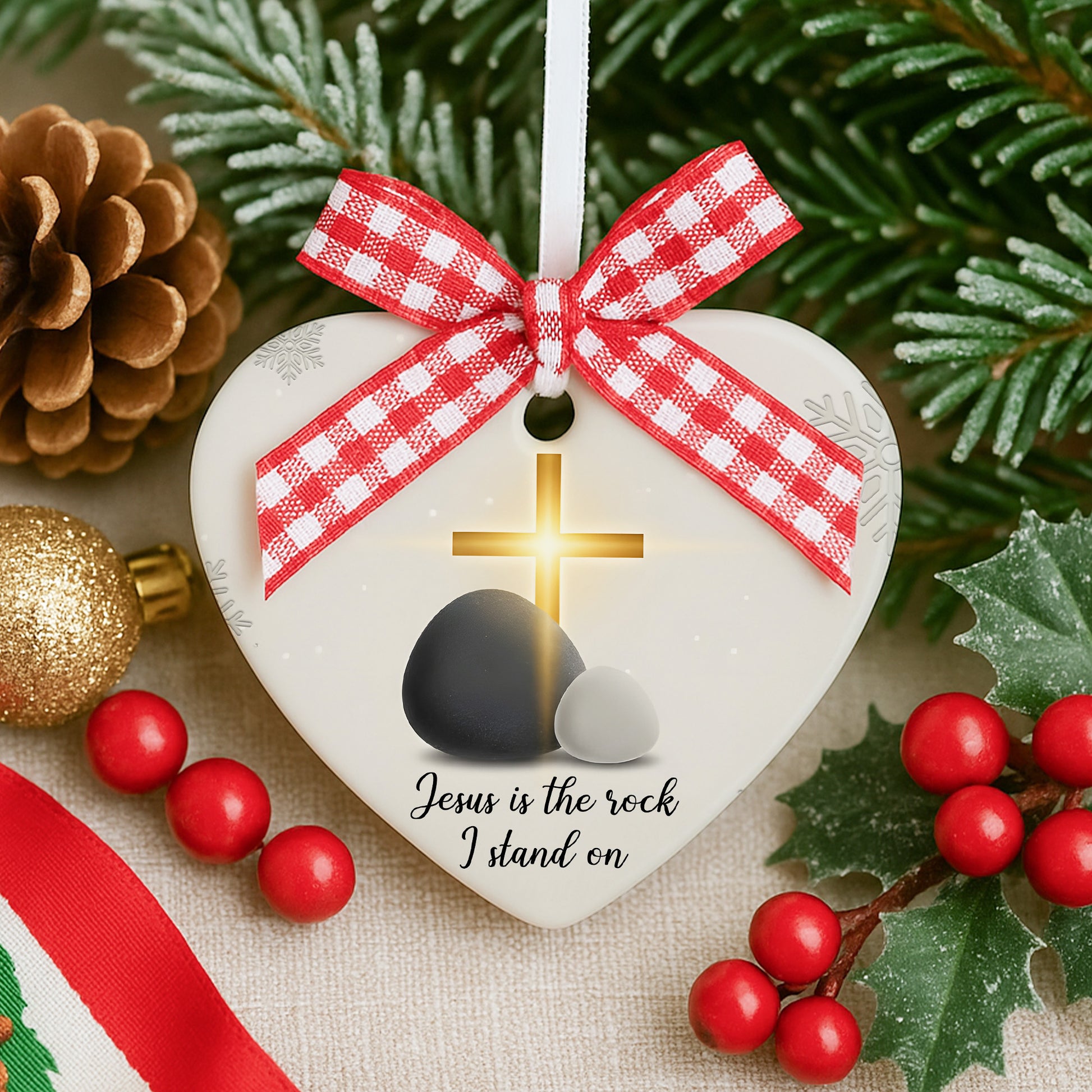 Jesus Is the Rock I Stand On Heart Ornament – Christian Ceramic Decoration, Religious Christmas Gift for Believers|ONM05