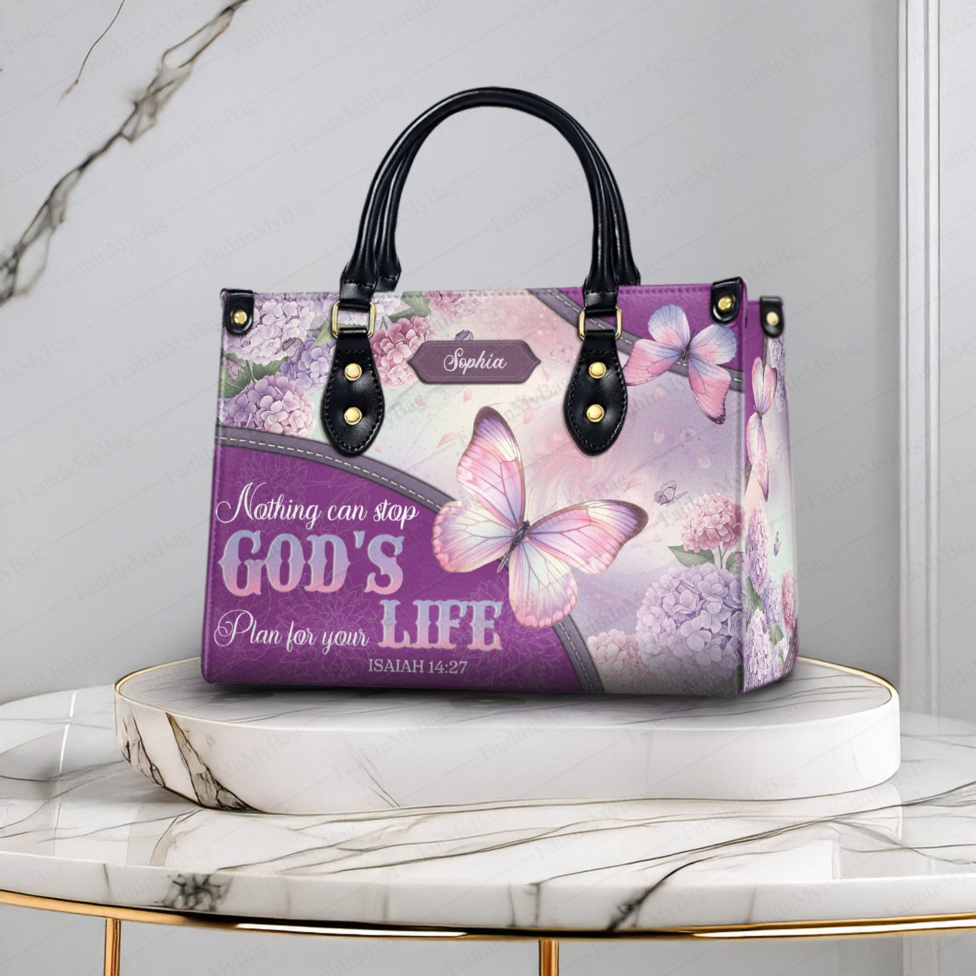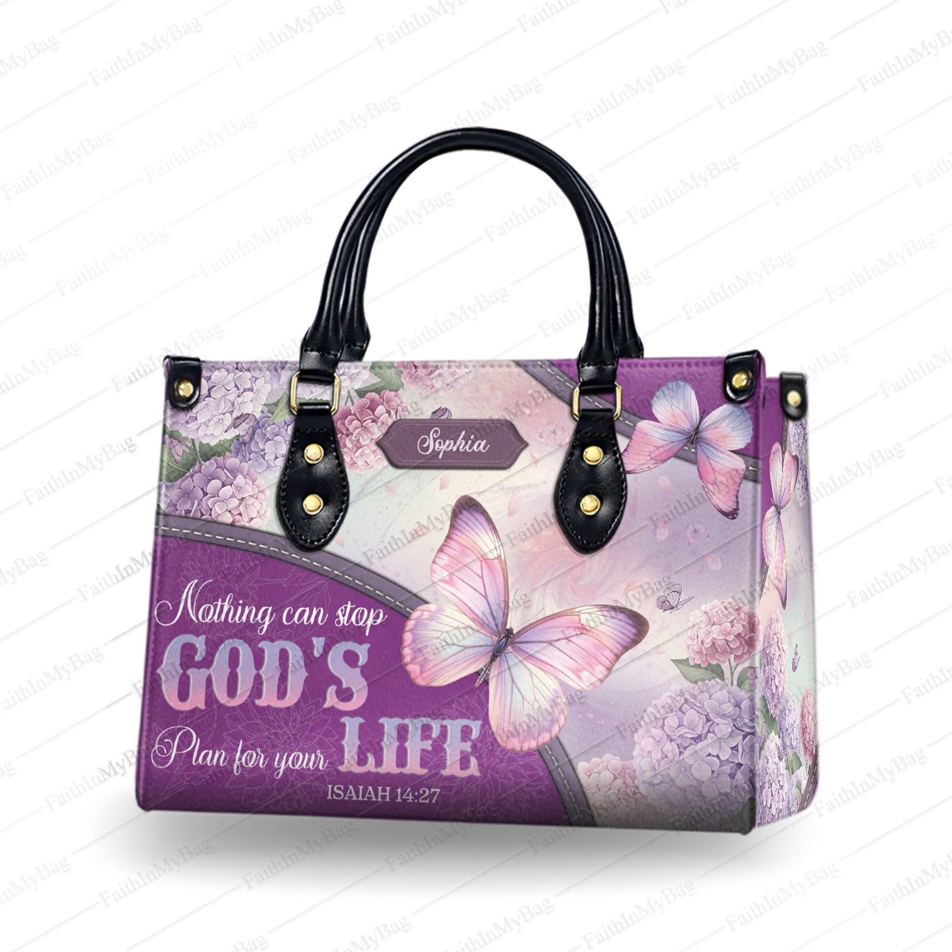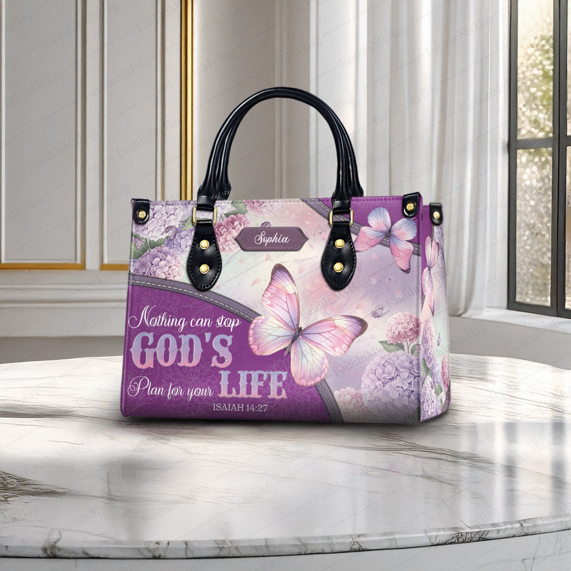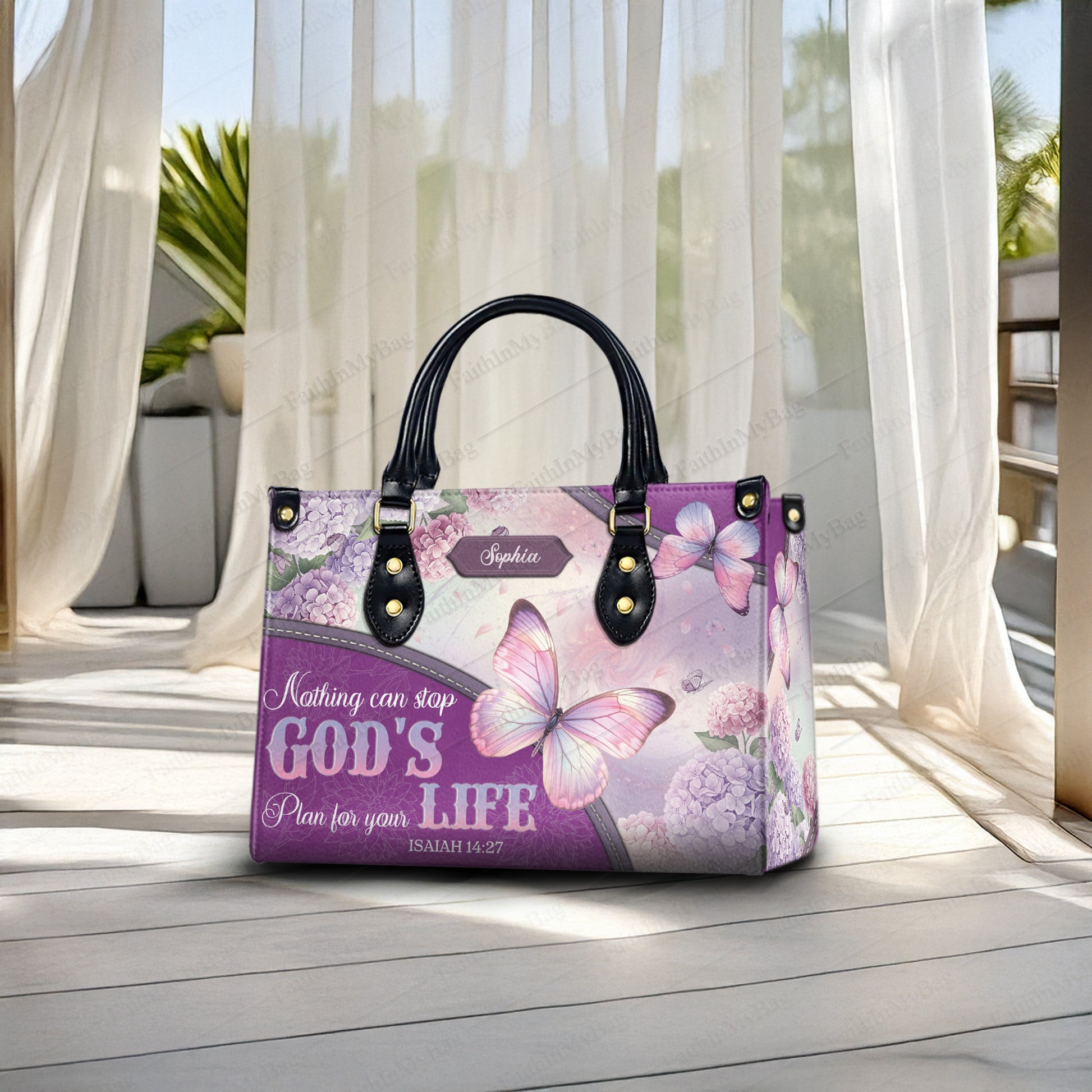 HB122 - Custom Name Christian Handbag – Butterfly Bible Verse Purse “God’s Plan” – Isaiah 14:27 Faith Gift for Women