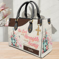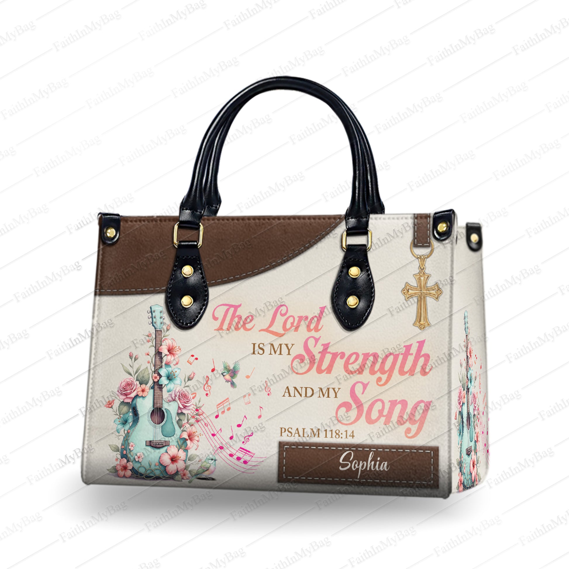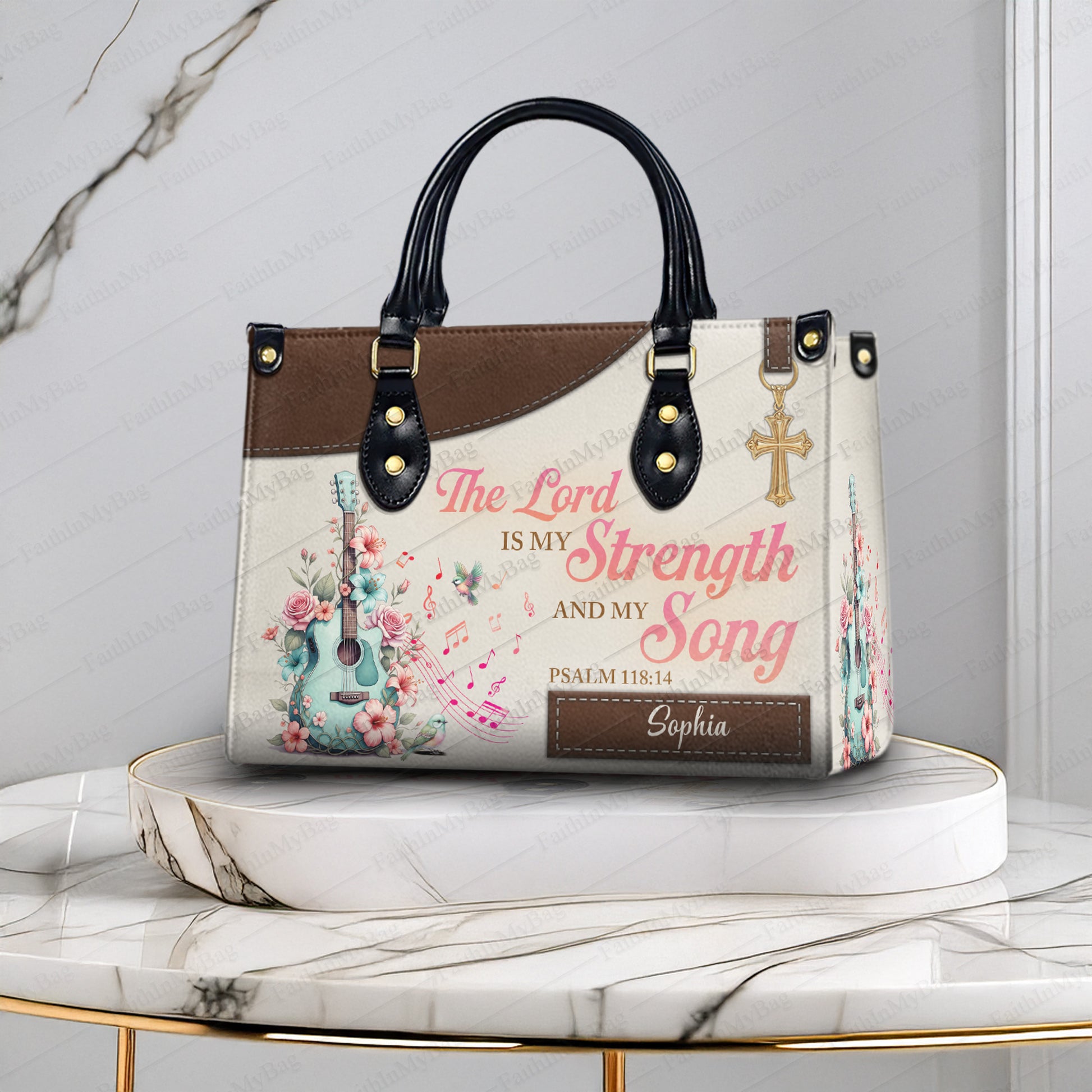 HB112 Christian Handbag with Psalm 118:14, Custom Name Purse, The Lord Is My Strength and Song, Faith Inspired Leather Bag Gift