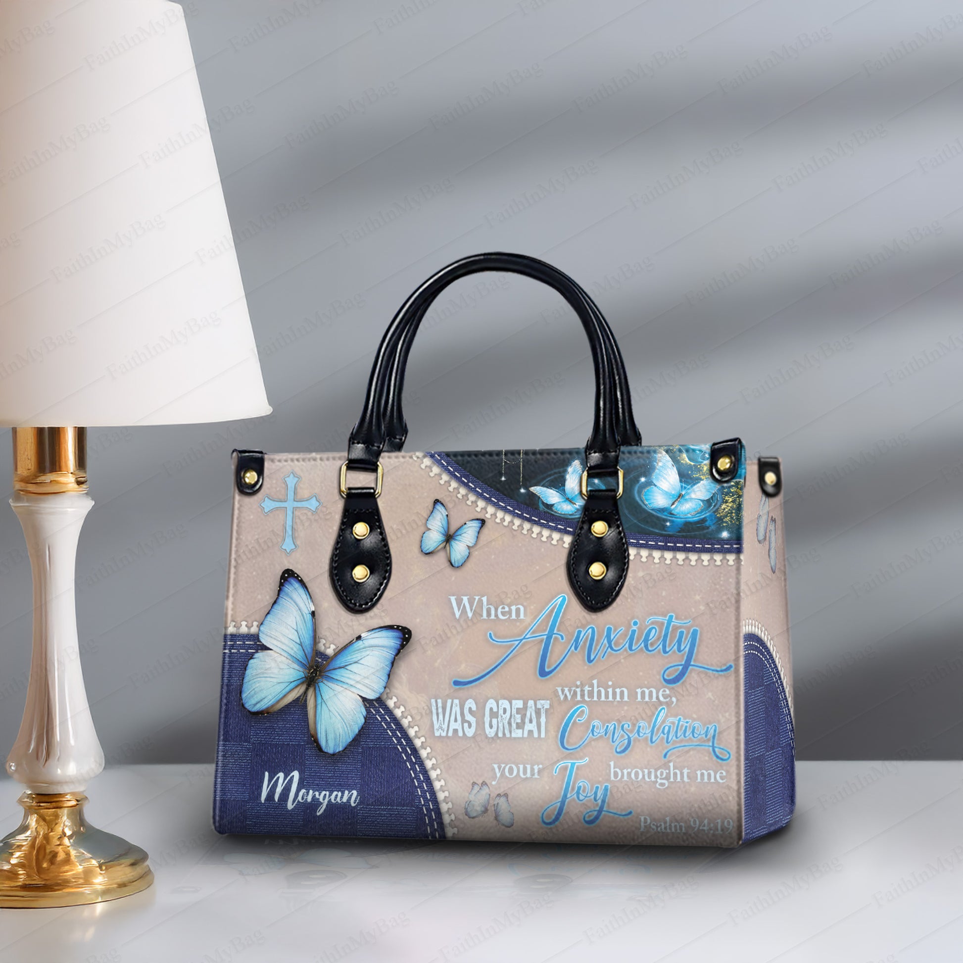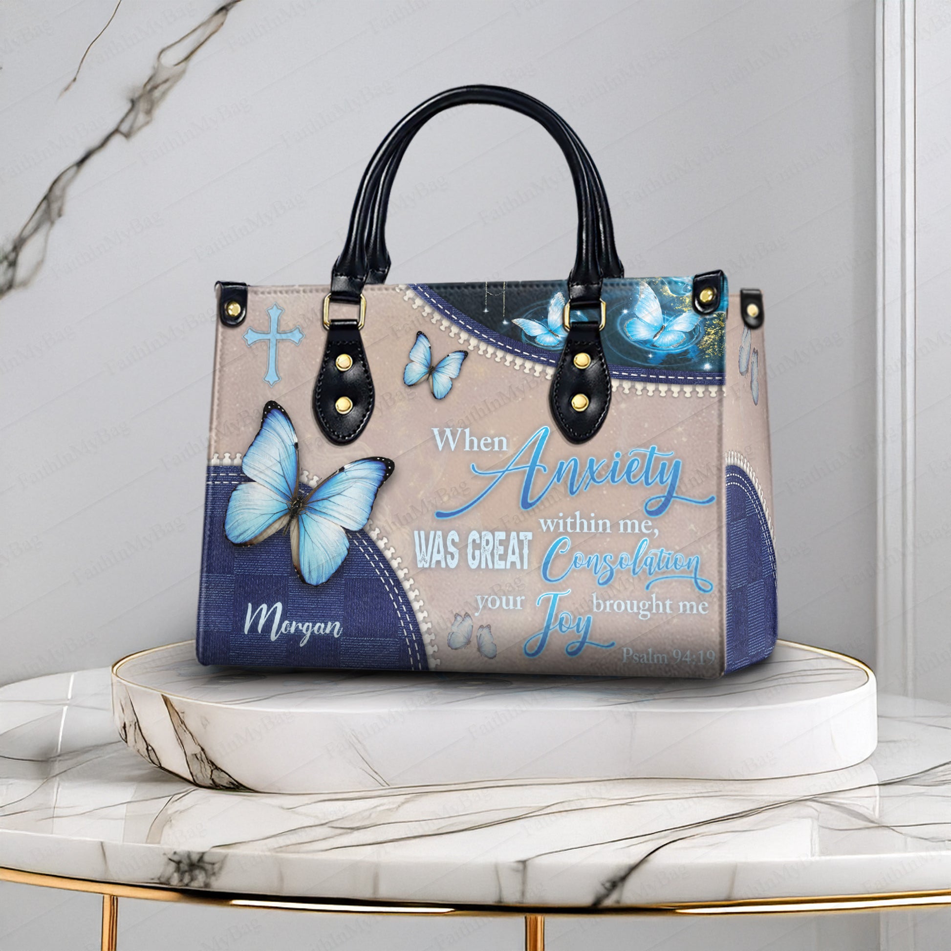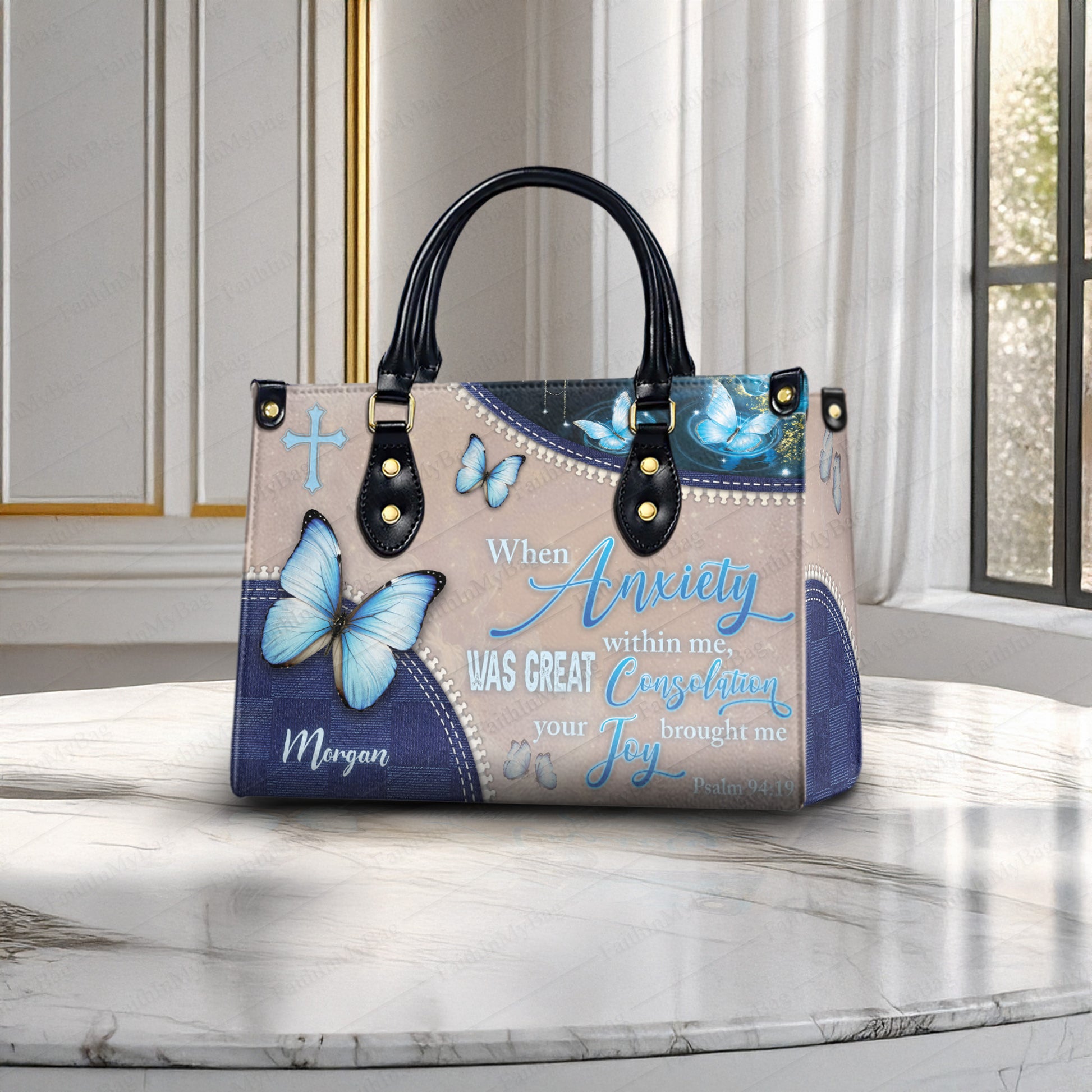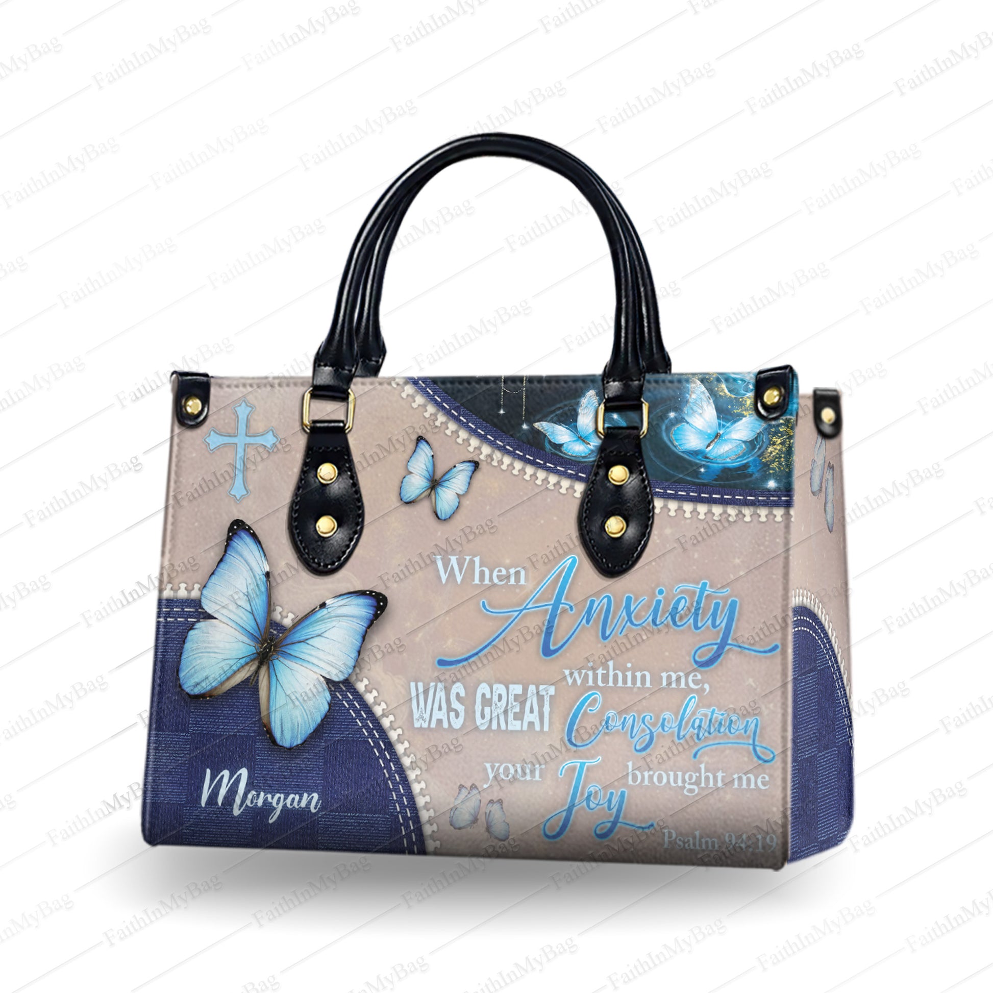 HB128 - Personalized Christian Handbag – Psalm 94:19 Bible Verse Butterfly Purse, Custom Name Faith Bag for Women, Scripture Gift Idea