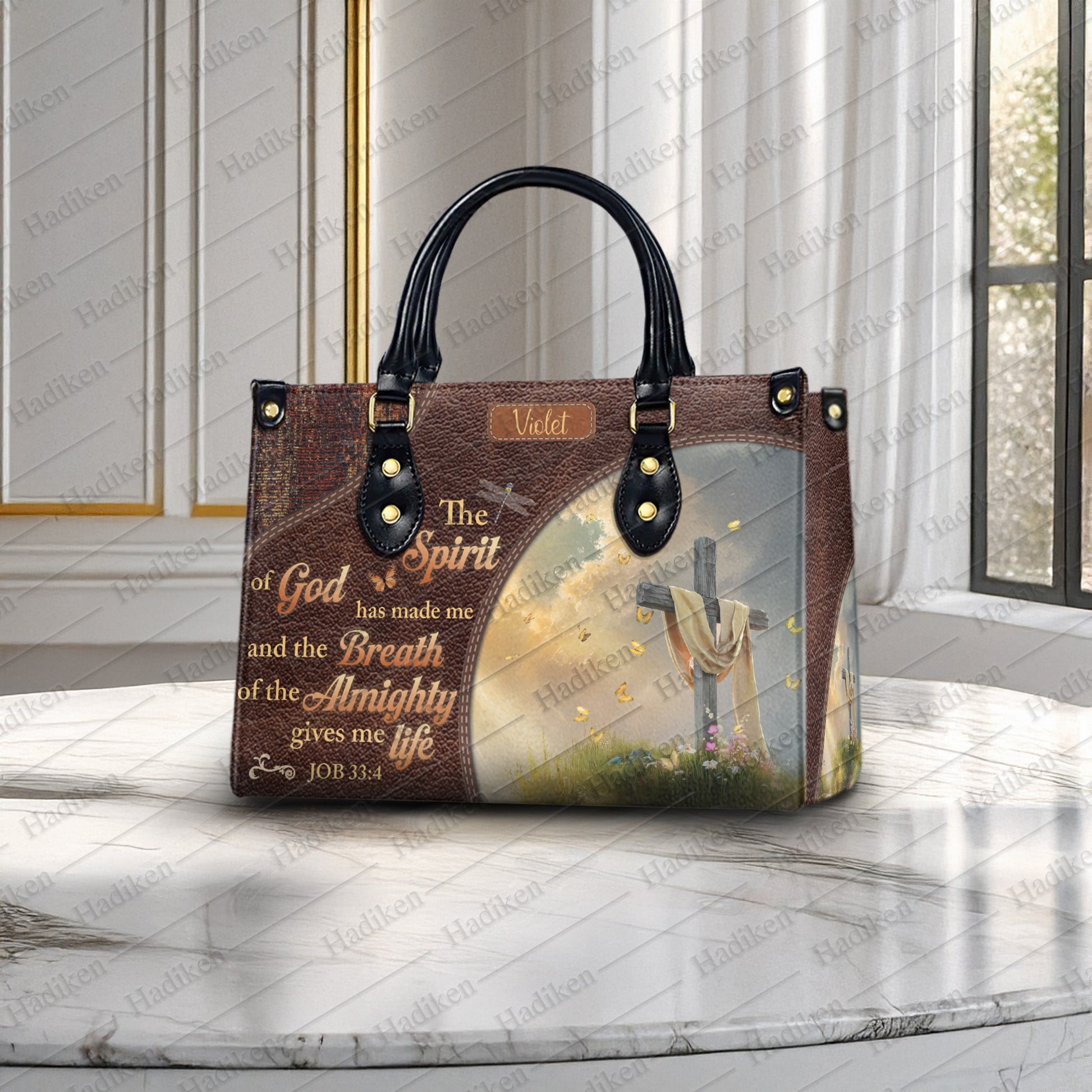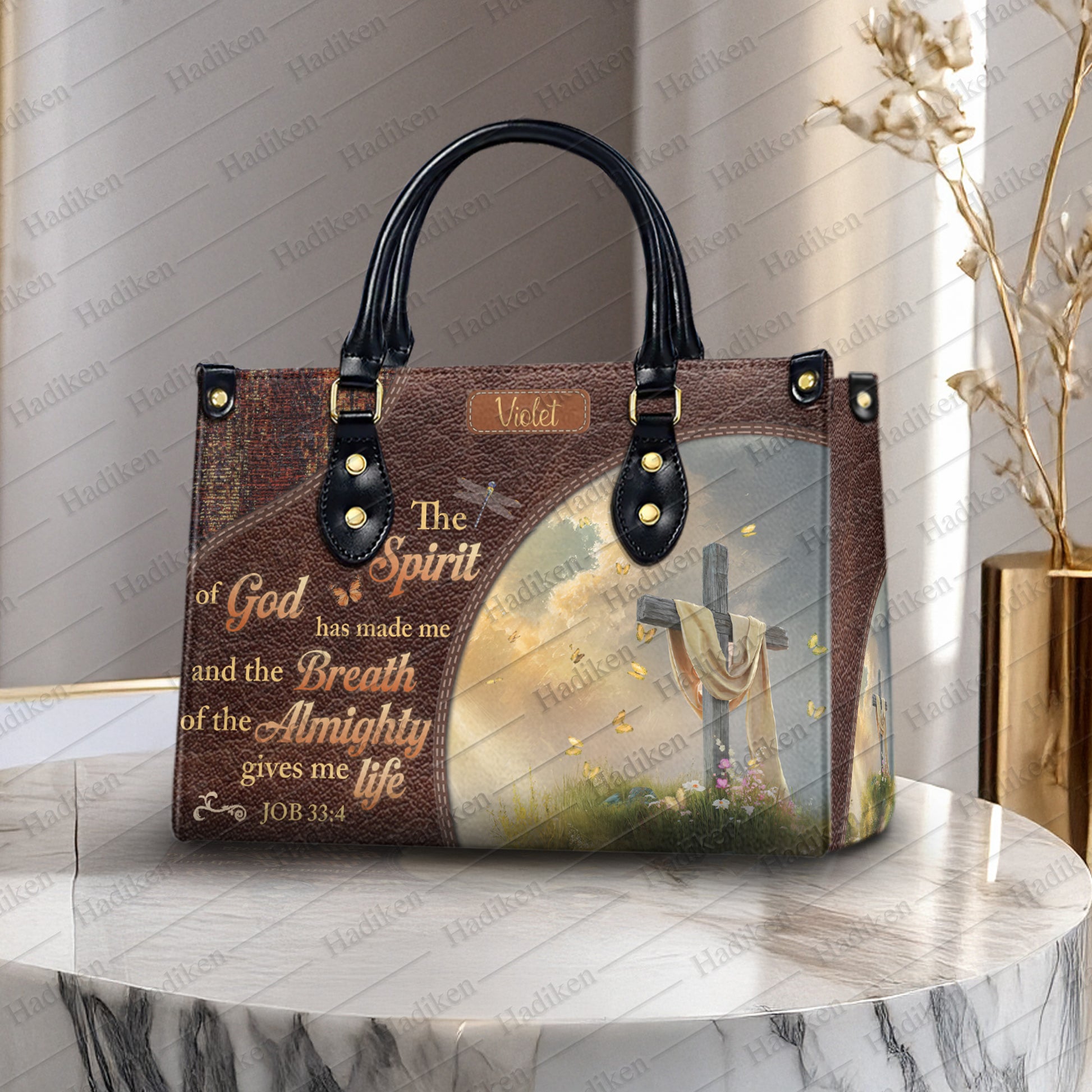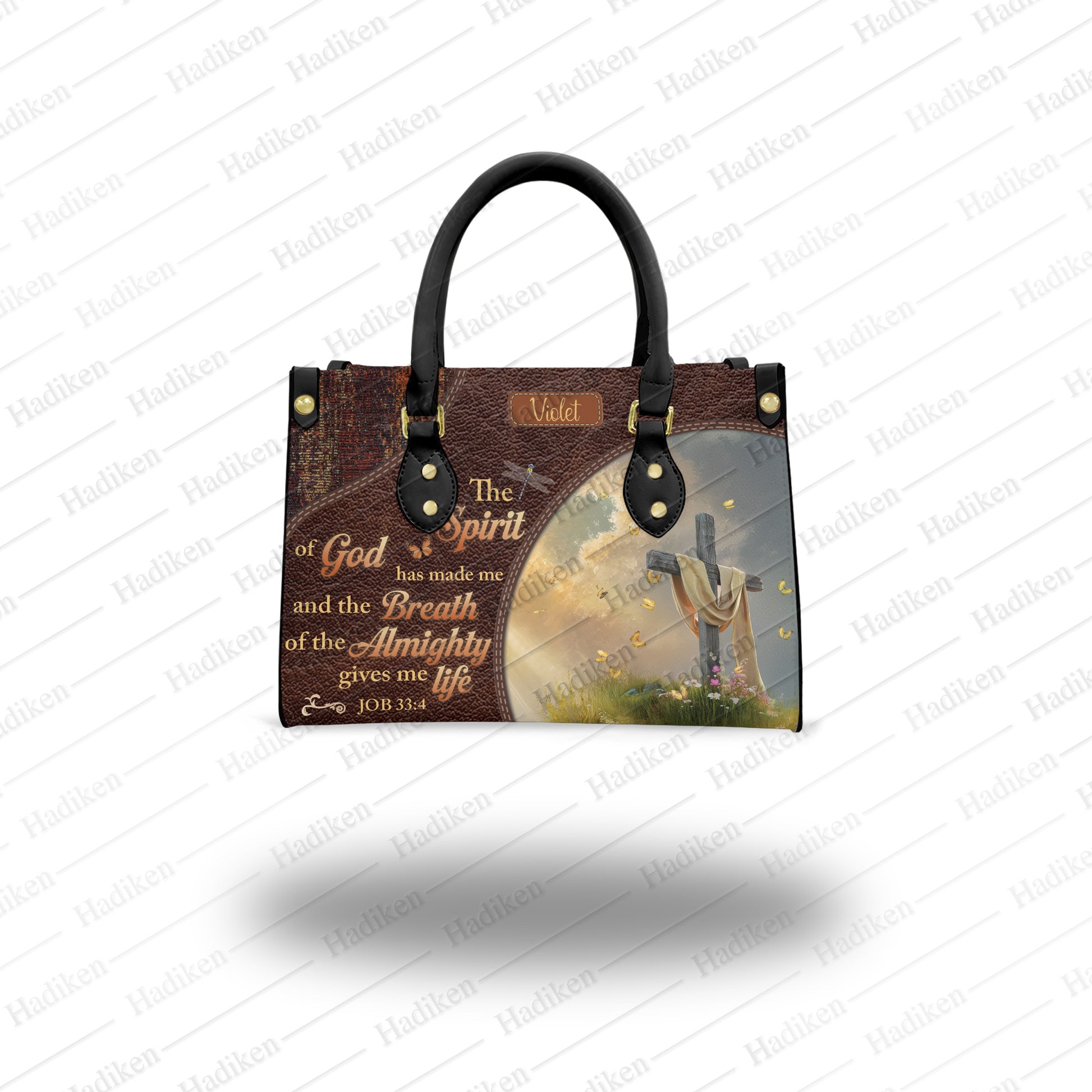 HB99 - Custom Name Christian Handbag – Job 33:4 Scripture Purse – Faith-Based Leather Tote with Cross and Quote Design