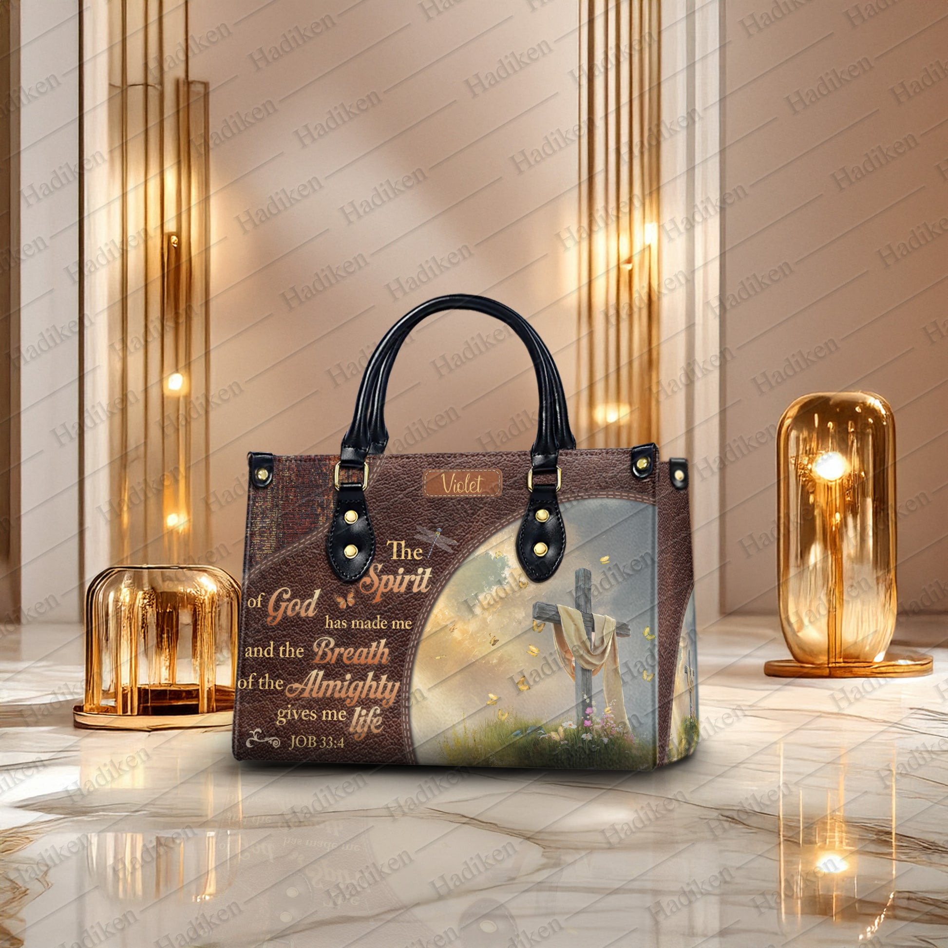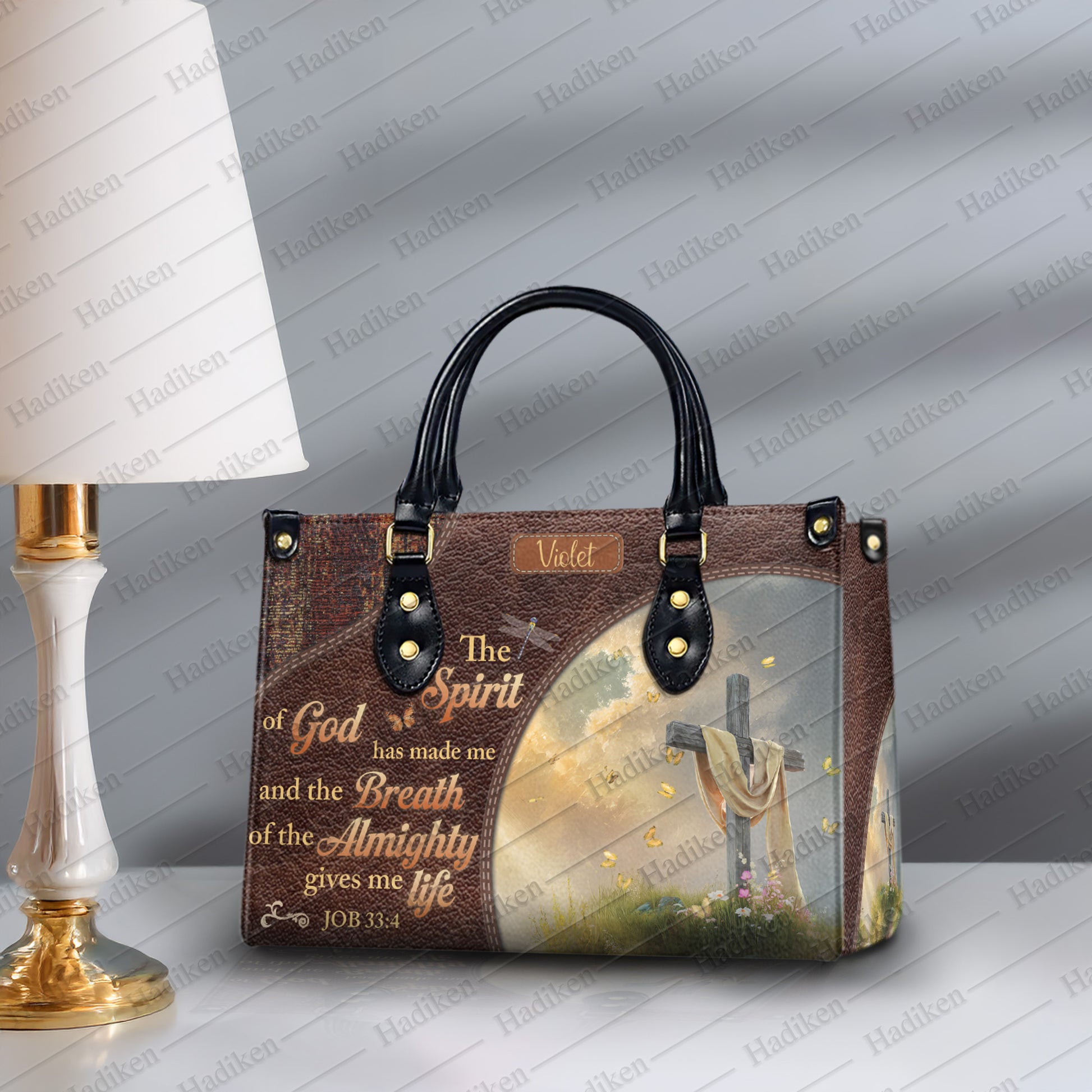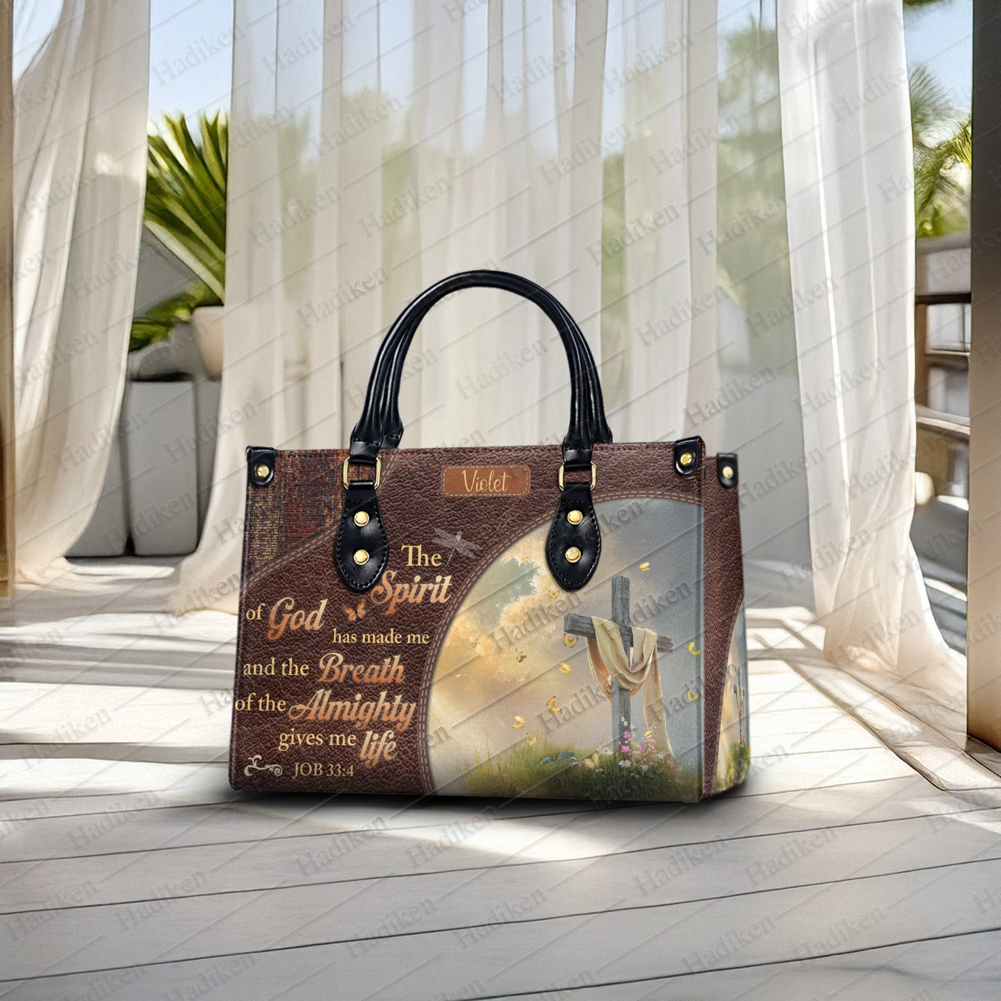 HB99 - Custom Name Christian Handbag – Job 33:4 Scripture Purse – Faith-Based Leather Tote with Cross and Quote Design