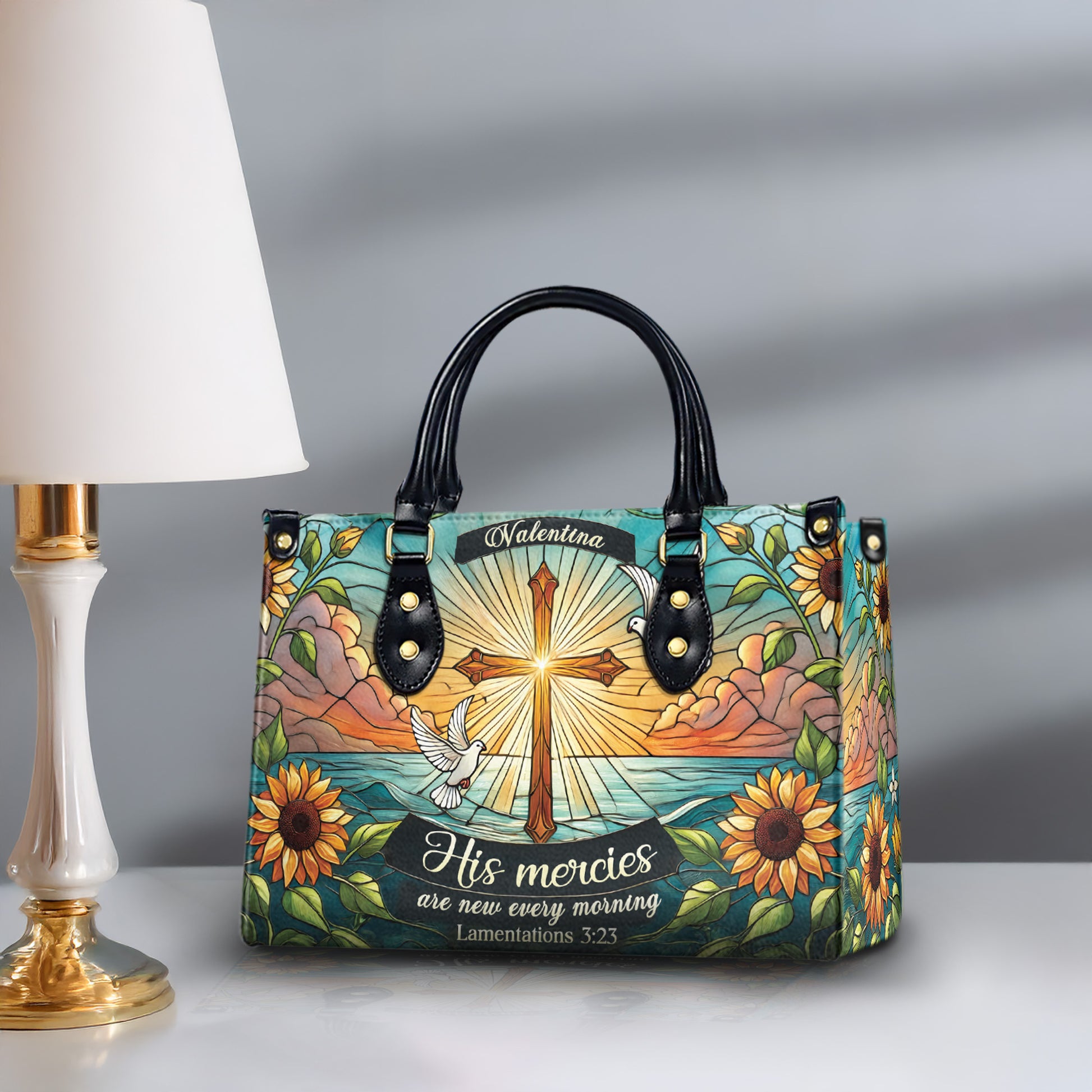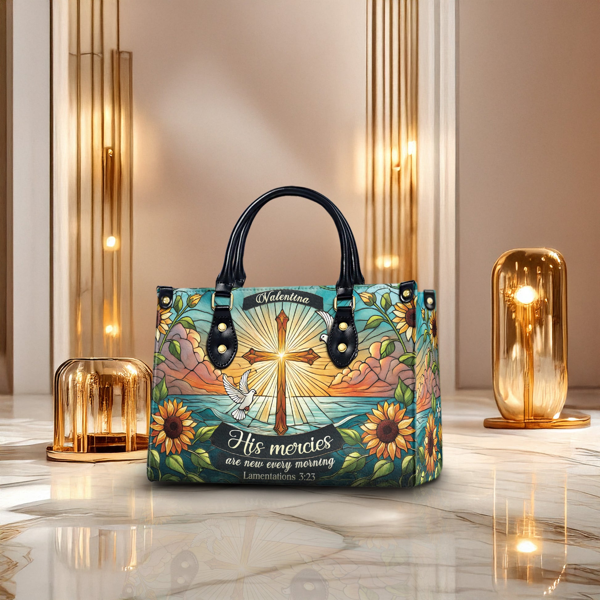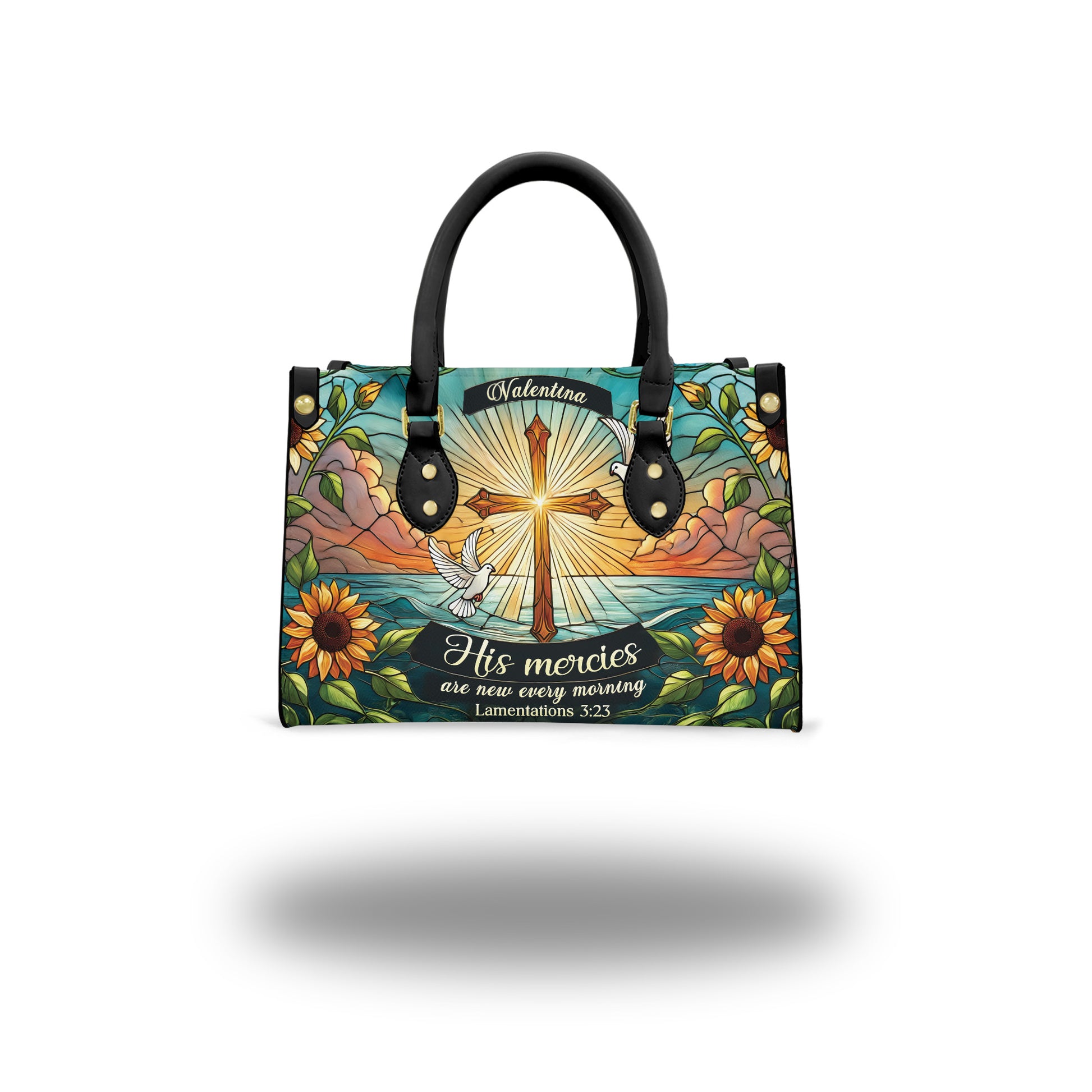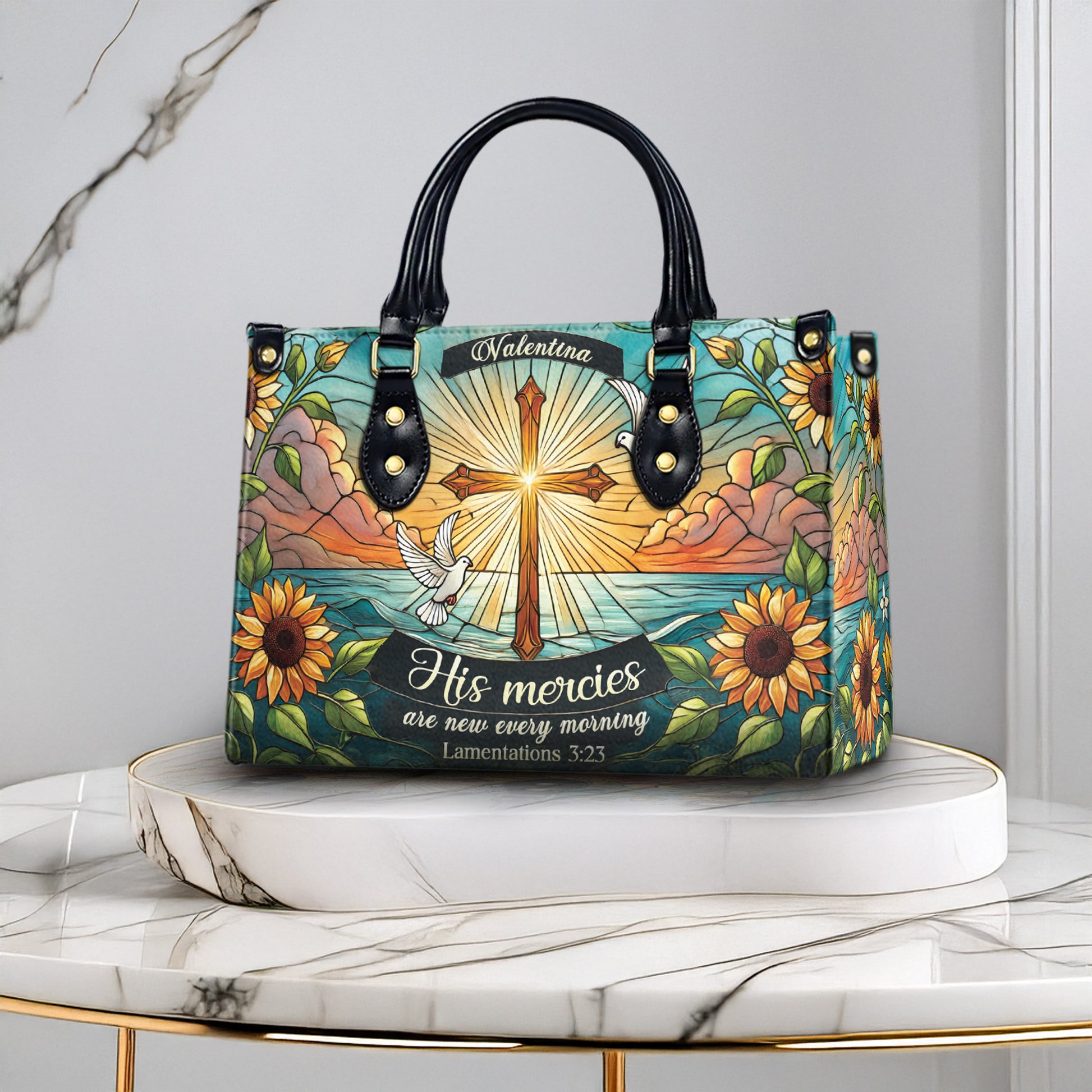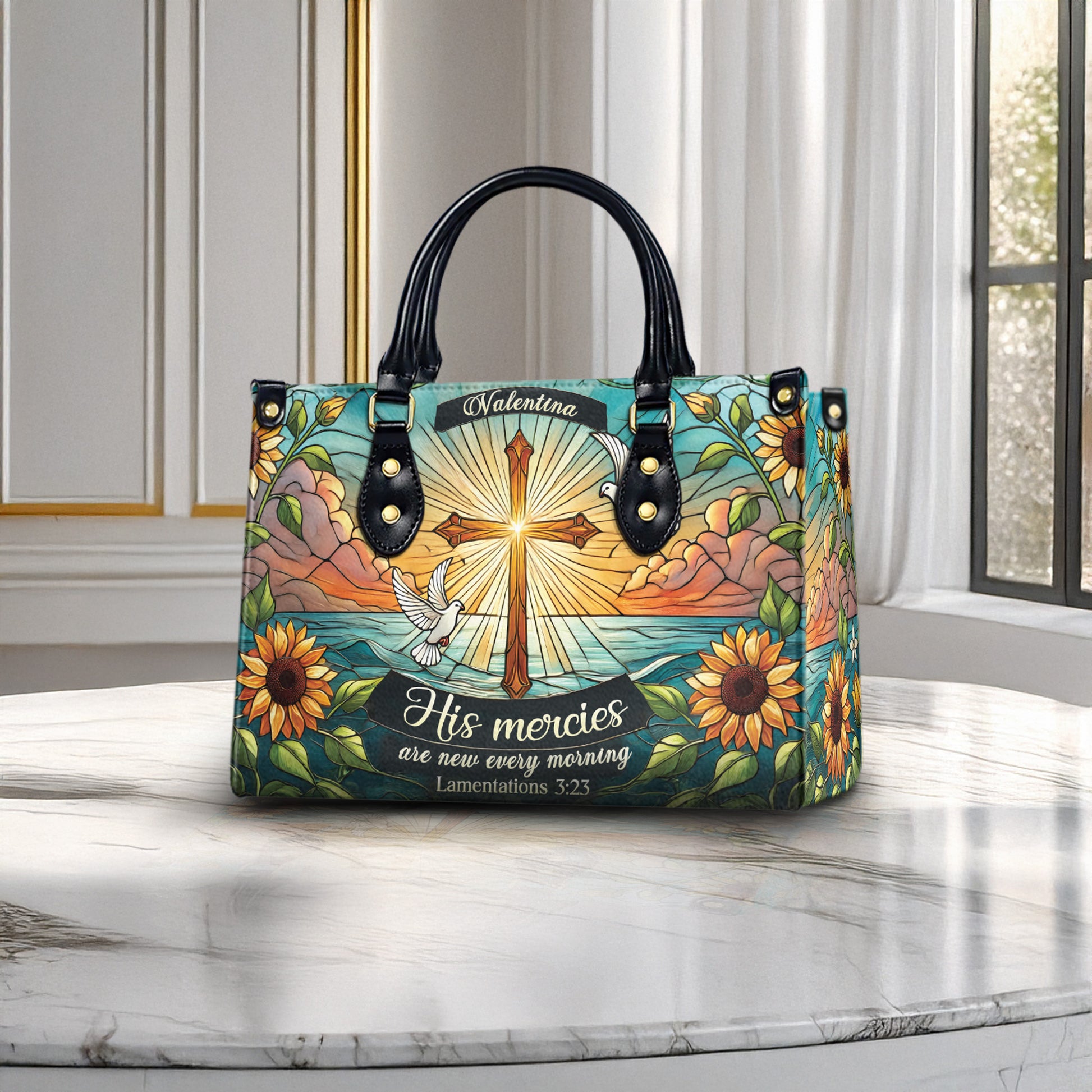 HB05-Personalized Christian Leather Handbag – His Mercies Are New Every Morning, Cross & Dove PU Leather Purse, Faith-Based Gift for Women