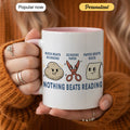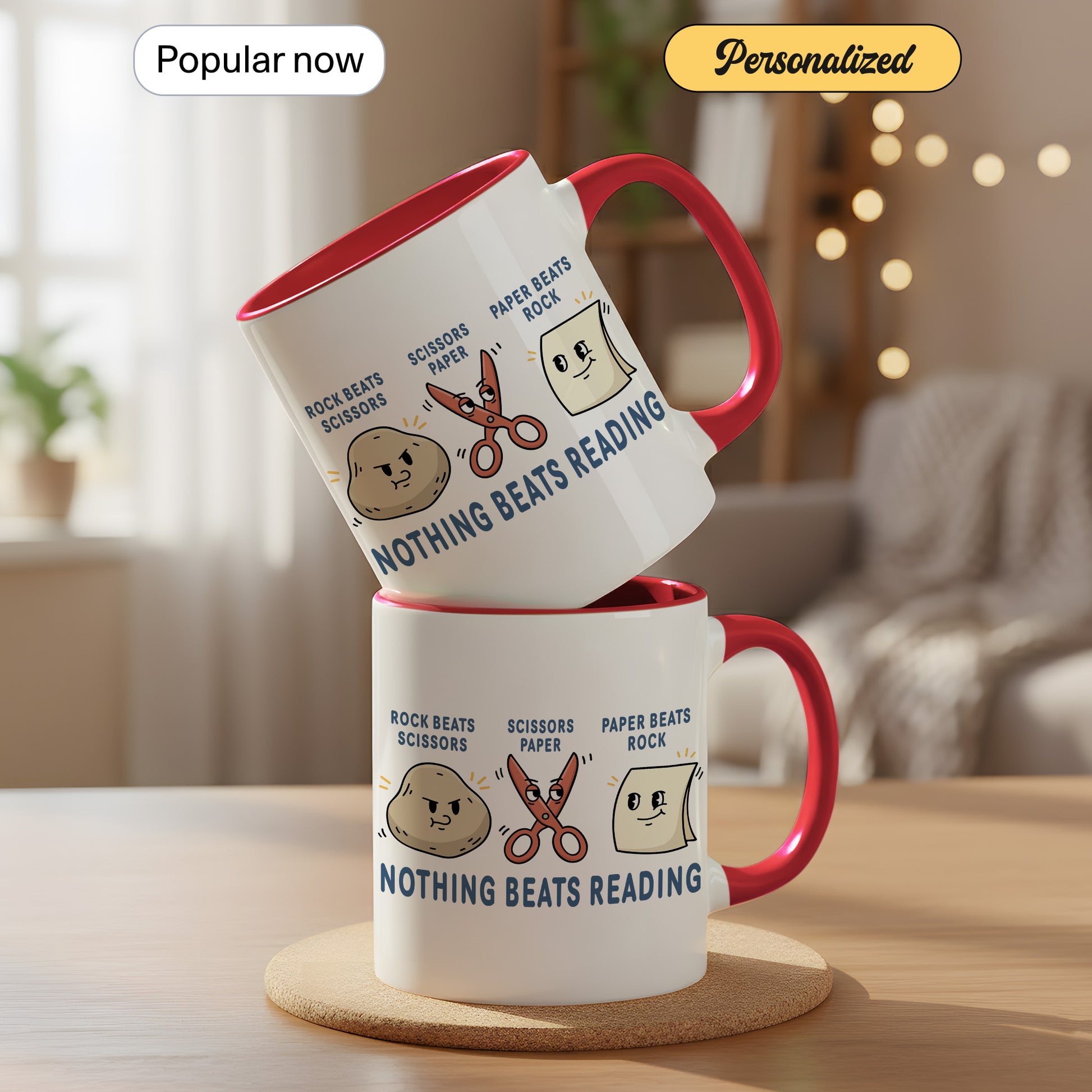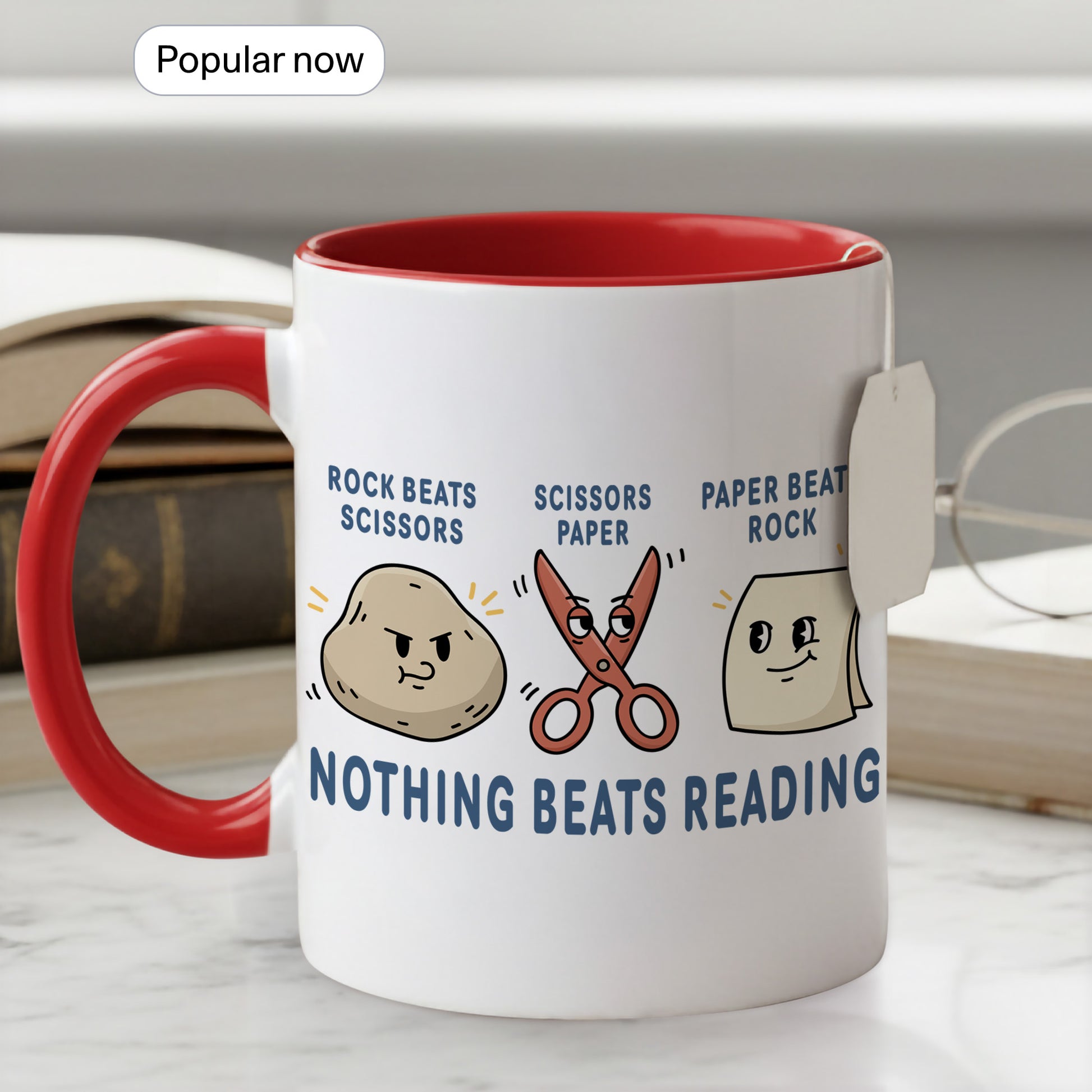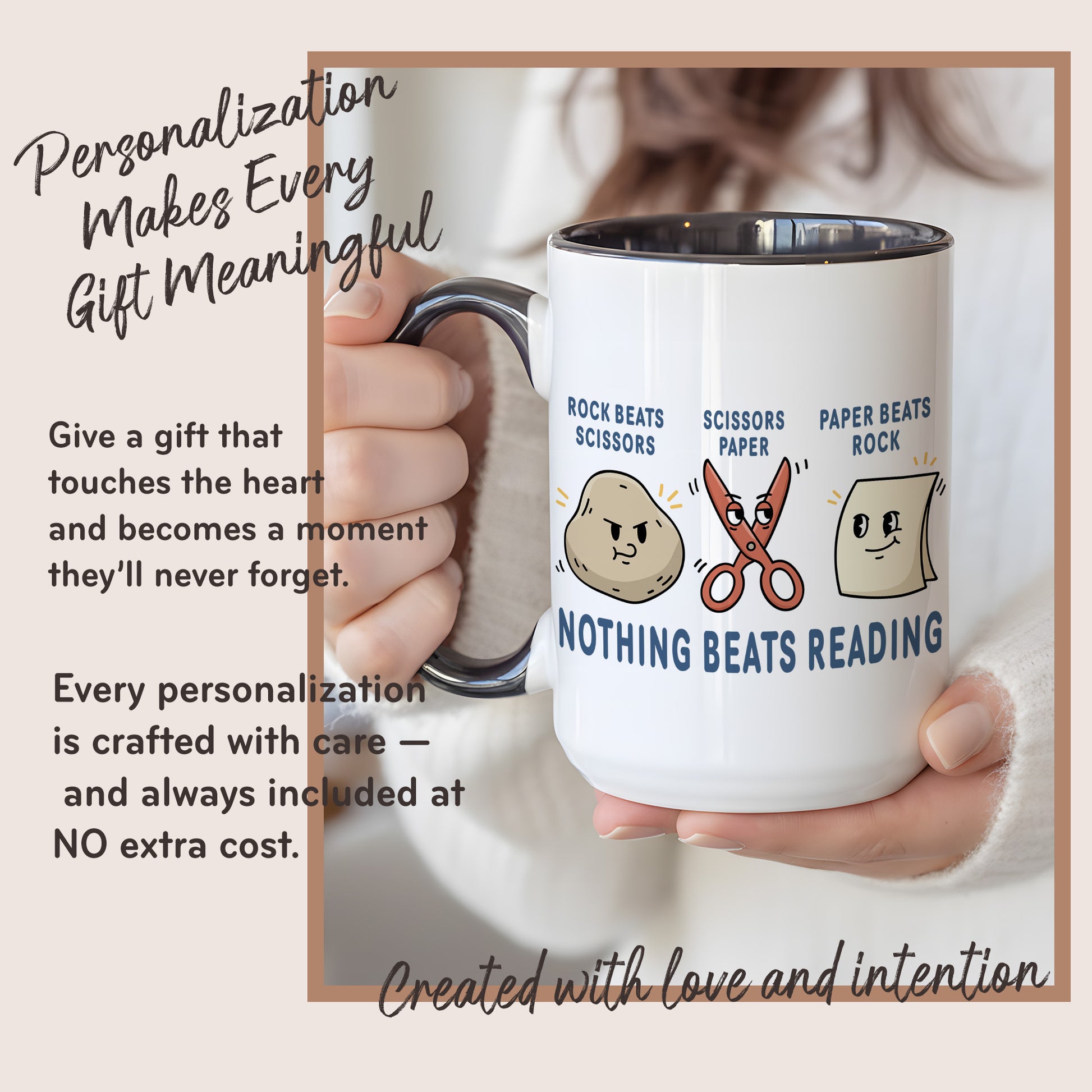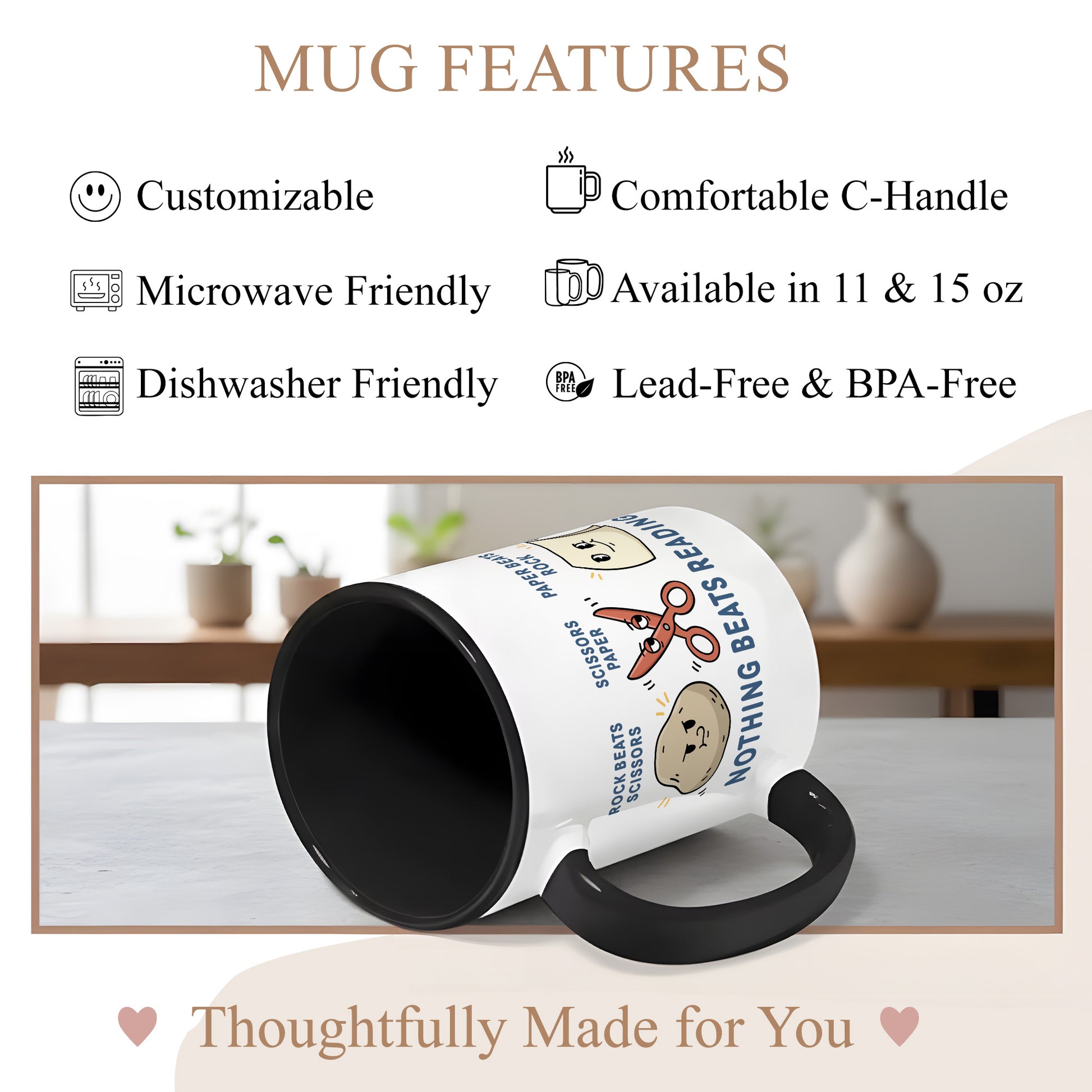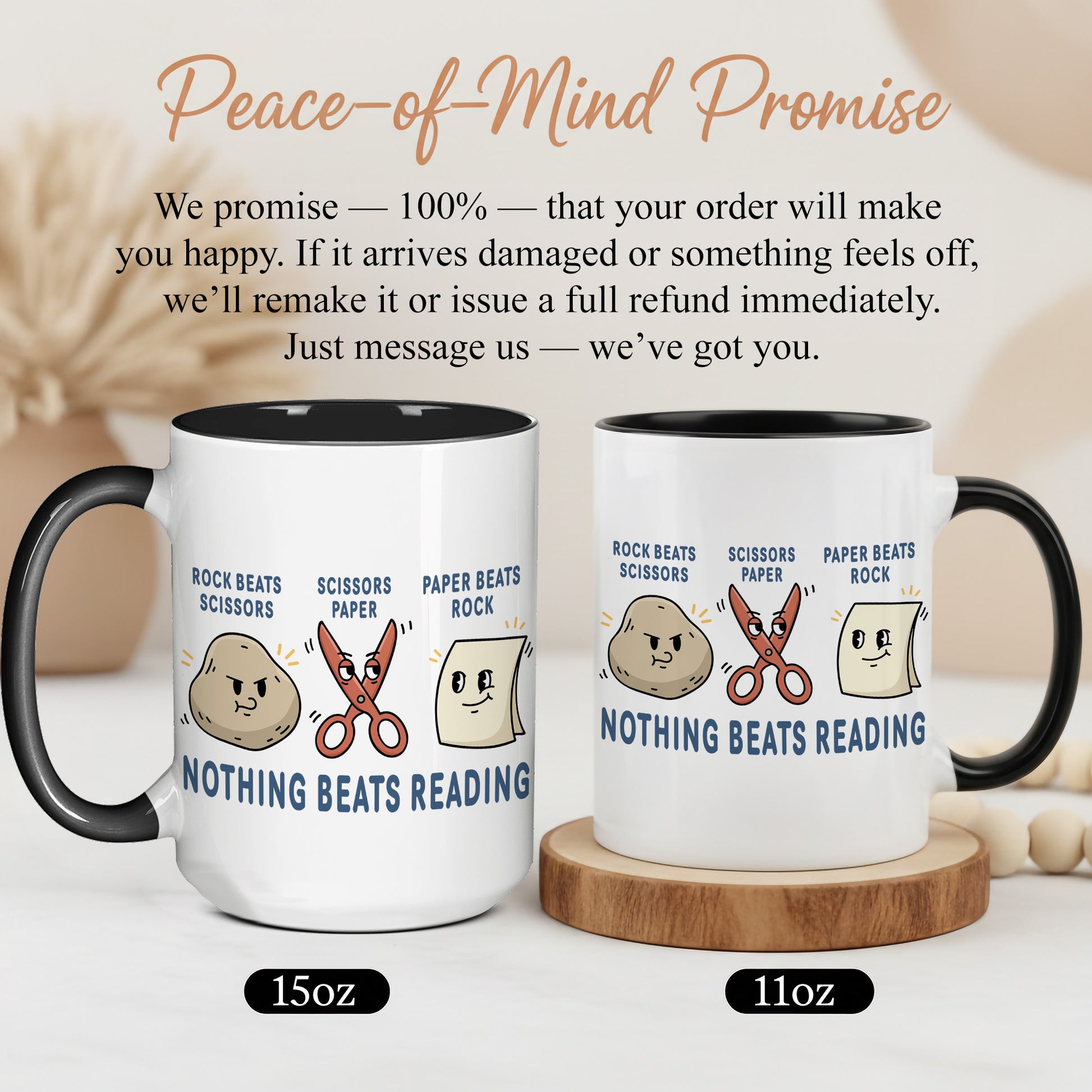 Nothing Beats Reading Coffee Mug | Cute Rock Paper Scissors Characters | Fun Book Lover Gift for Readers & Bookworms| Mug 5