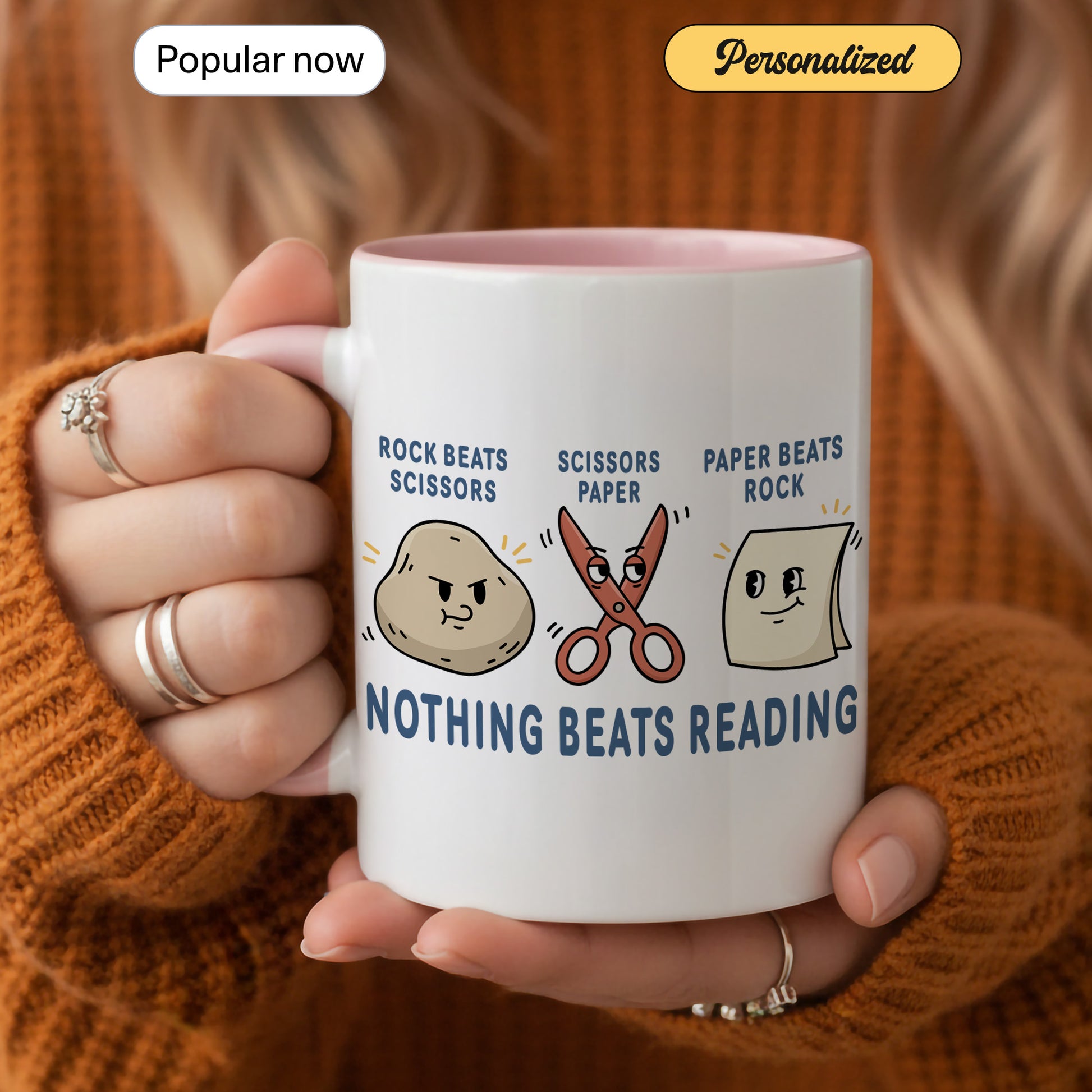 Add humor and bookish charm to your day with this “Nothing Beats Reading” Funny Mug. Featuring a playful twist on the classic Rock–Paper–Scissors game, this design celebrates what every book lover knows: reading always wins.