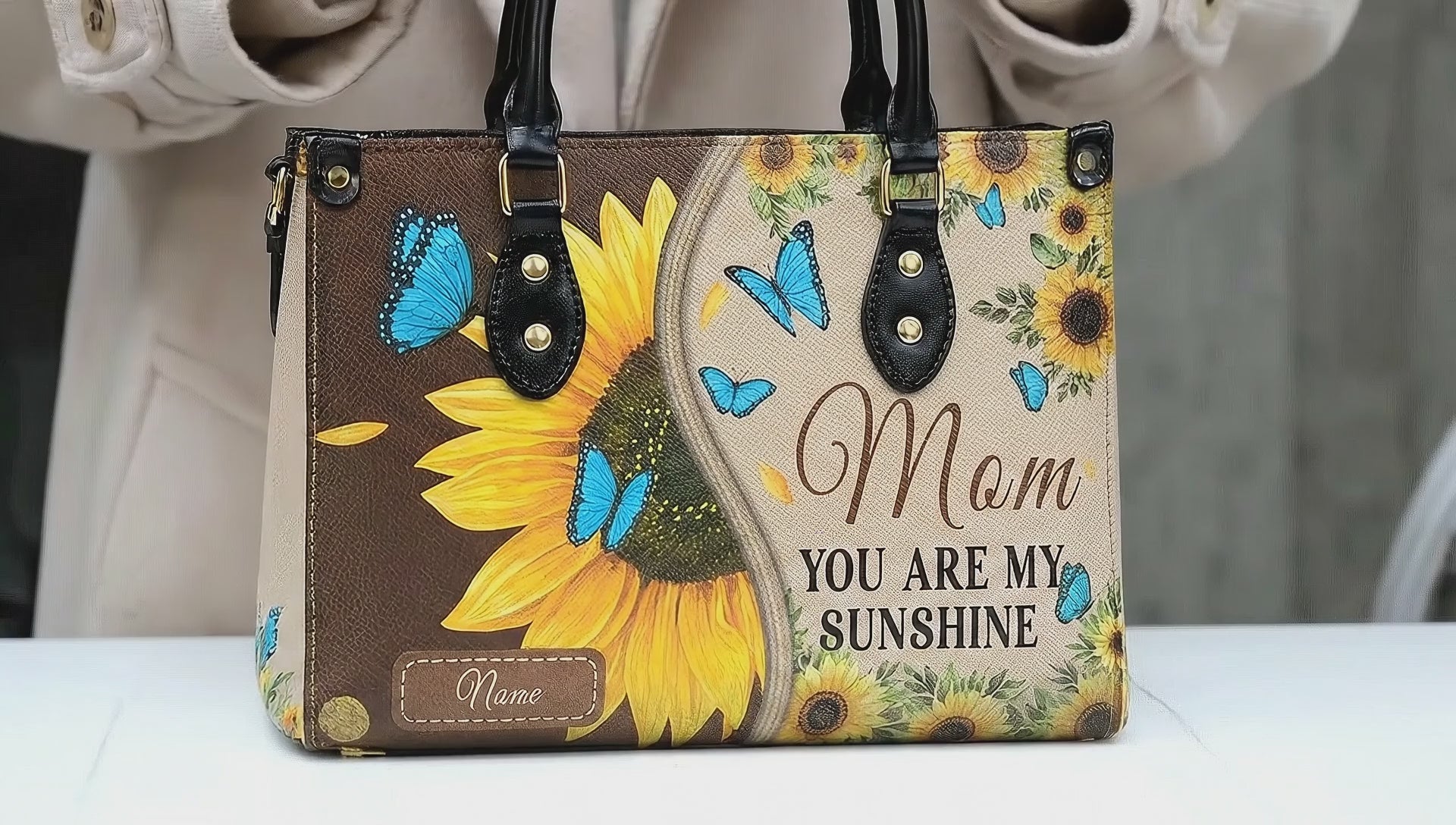 Personalized 'Mom, You Are My Sunshine' Handbag – Custom Name, Inspirational Gift with Sunflower and Butterfly Design|HB86