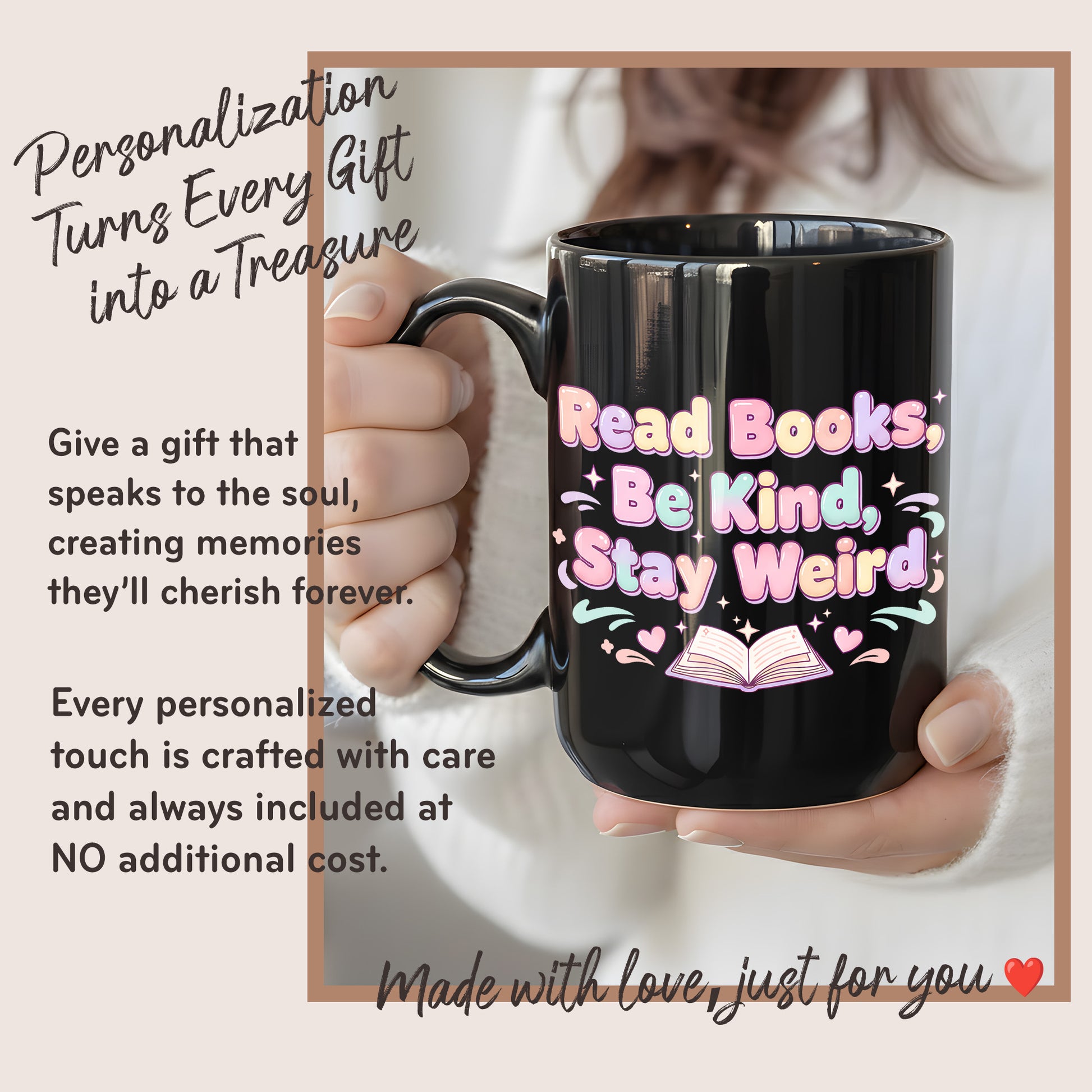 The "Read Books Be Kind Stay Weird" mug is a fun and inspirational addition to your daily routine. Featuring a colorful design with an open book and a motivational message, it’s perfect for book lovers, creatives, and those who embrace kindness and individuality 💖.