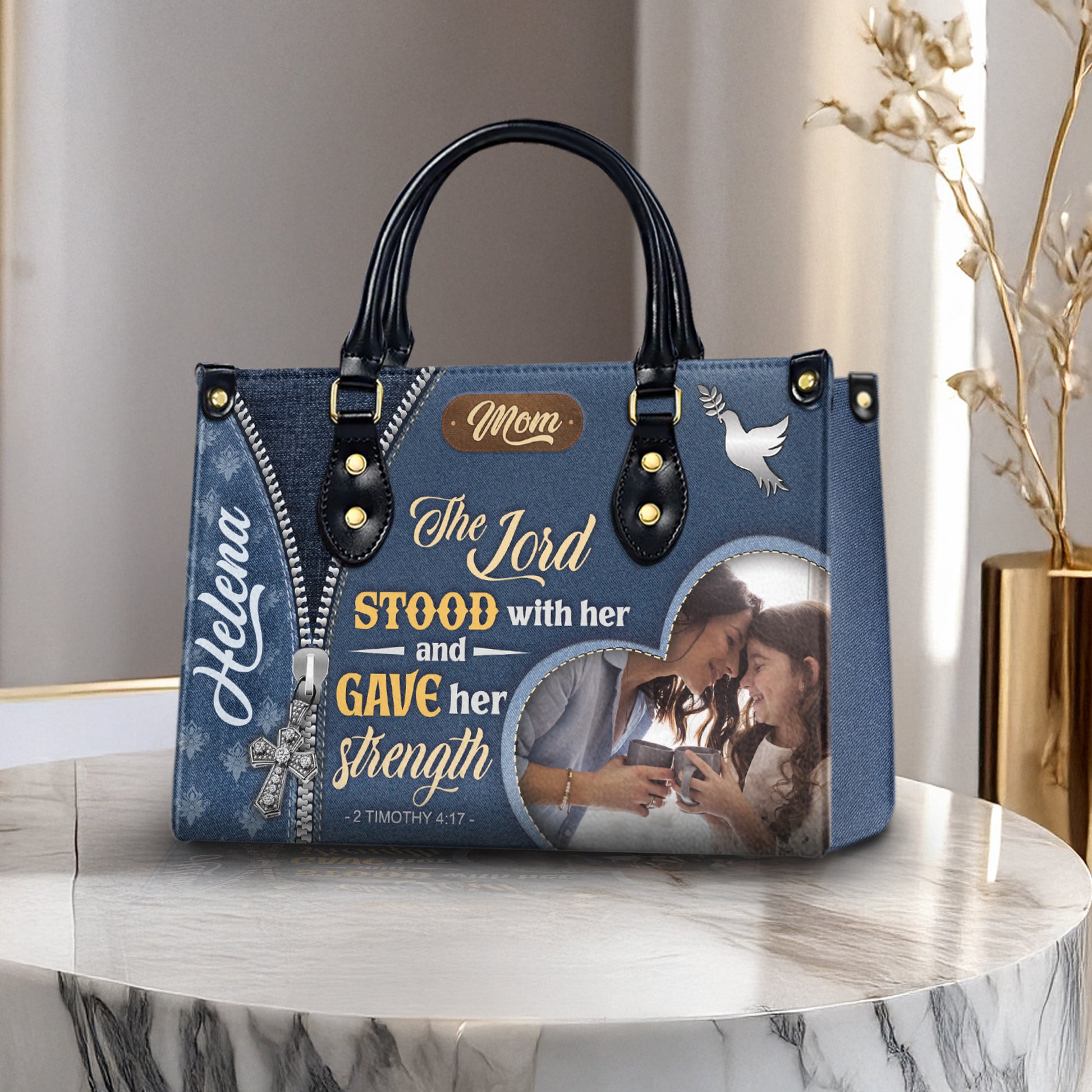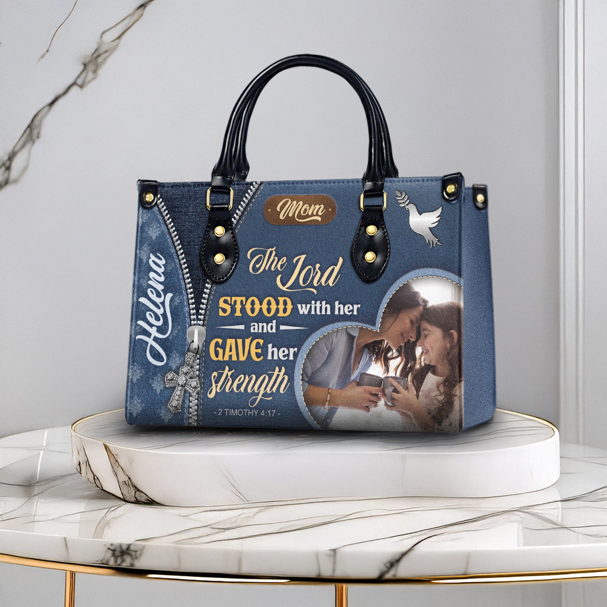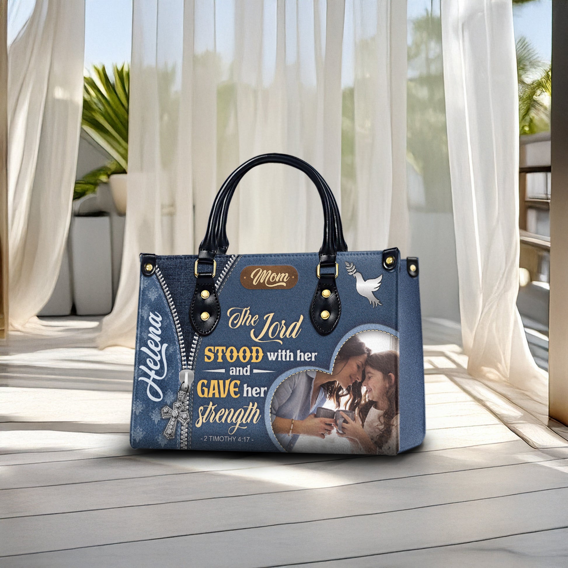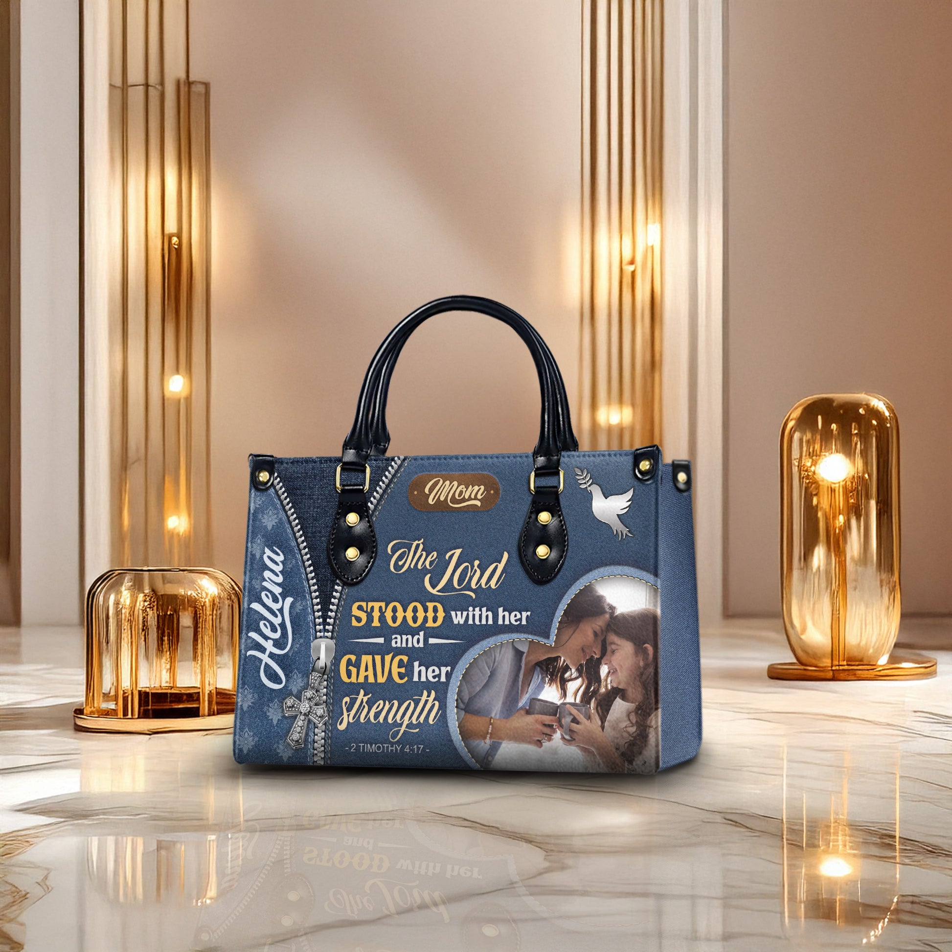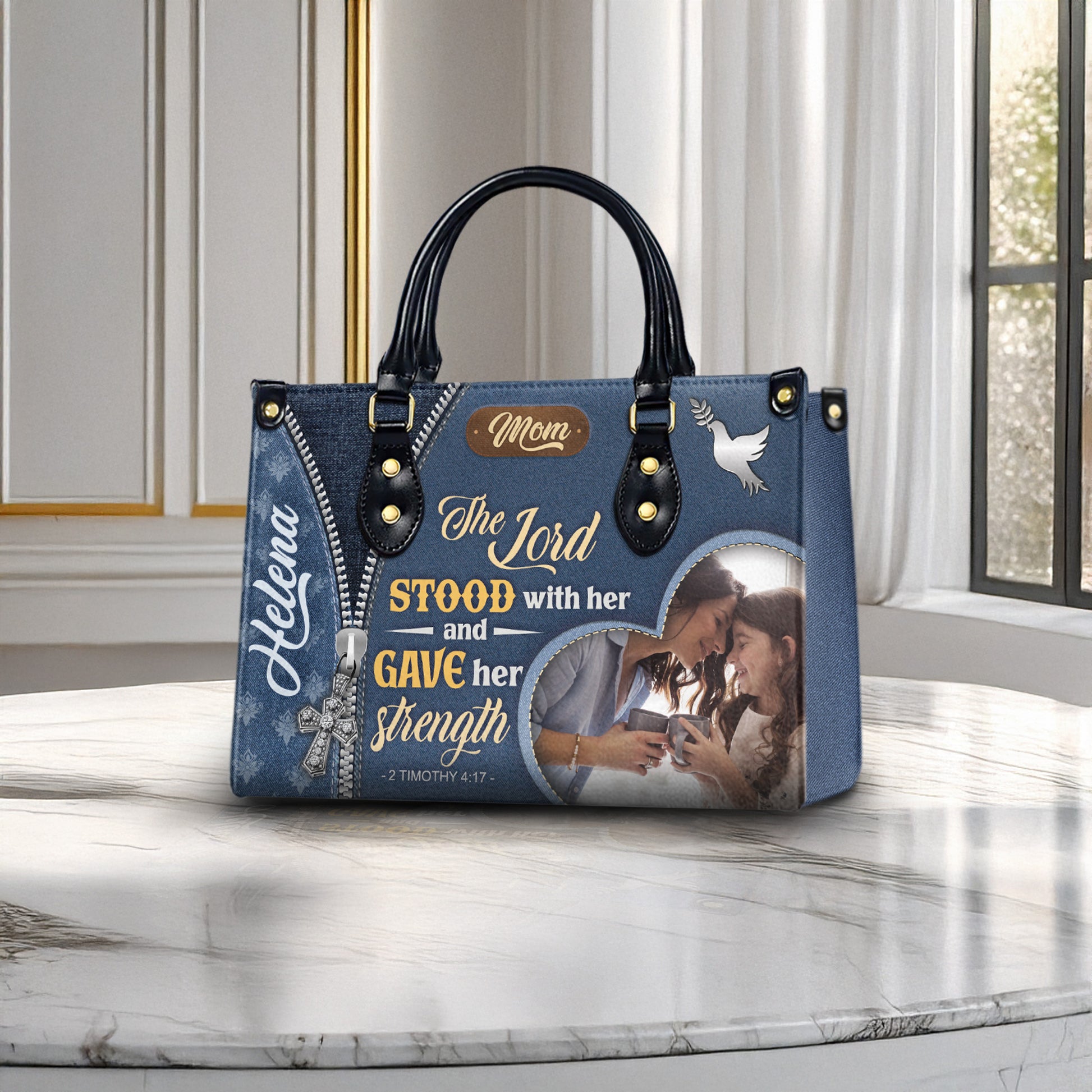 Celebrate a mother’s strength and faith with this heartfelt custom Christian handbag, featuring the powerful Bible verse 2 Timothy 4:17: “The Lord stood with her and gave her strength.” With personalized touches like her name and a cherished photo, this faith-filled purse is more than just an accessory—it’s a daily reminder of God’s love and her unwavering spirit.