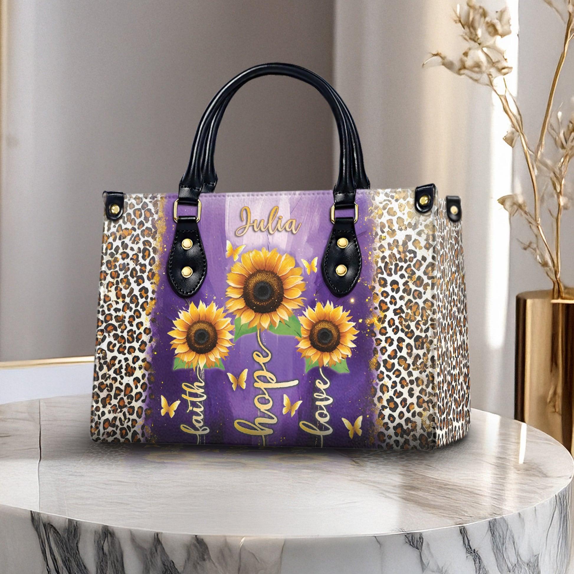 Express your style and your faith with this Personalized Christian Handbag, featuring stunning sunflower artwork, elegant leopard print accents, and the timeless message: Faith – Hope – Love. Add your name to make it truly yours — or gift it to someone special!