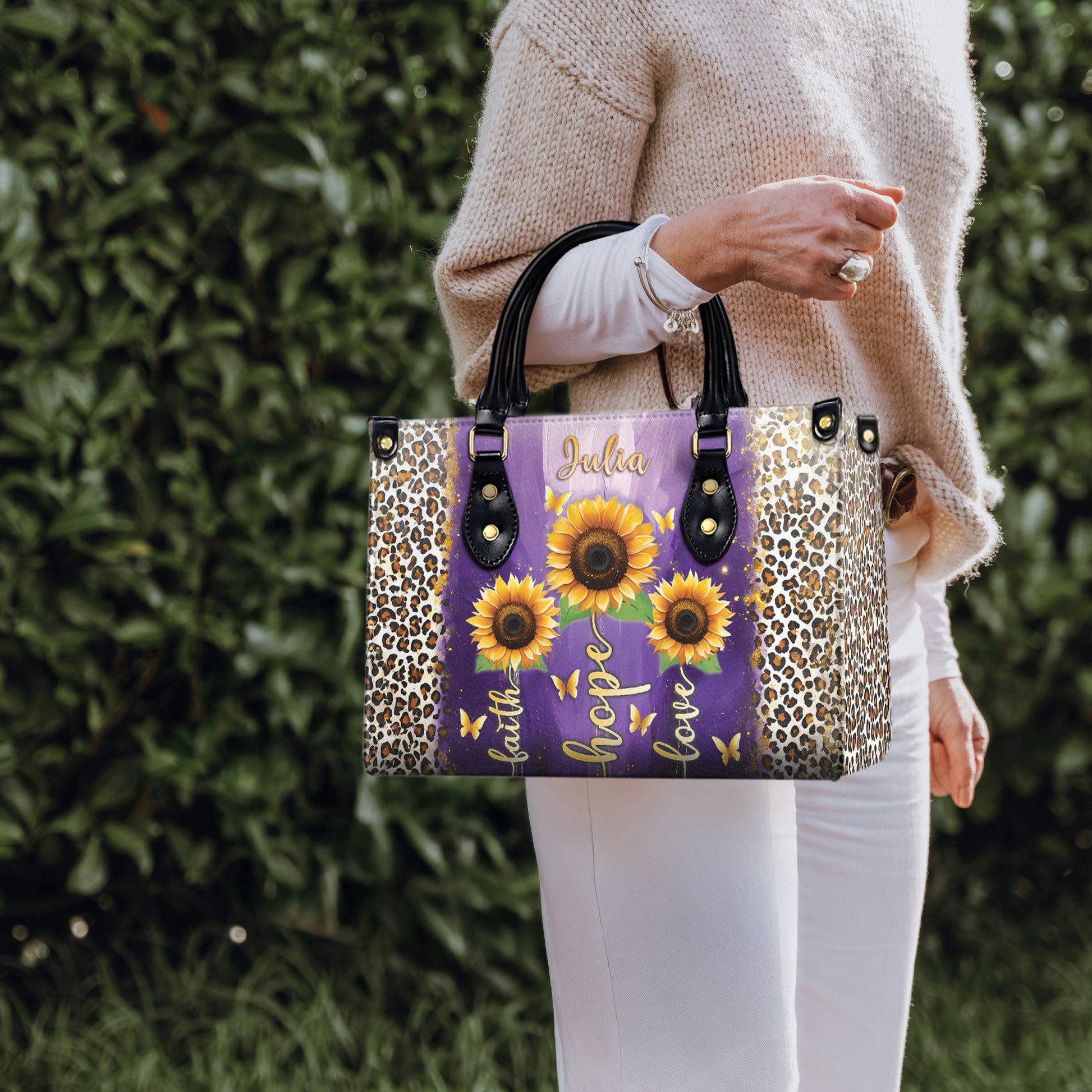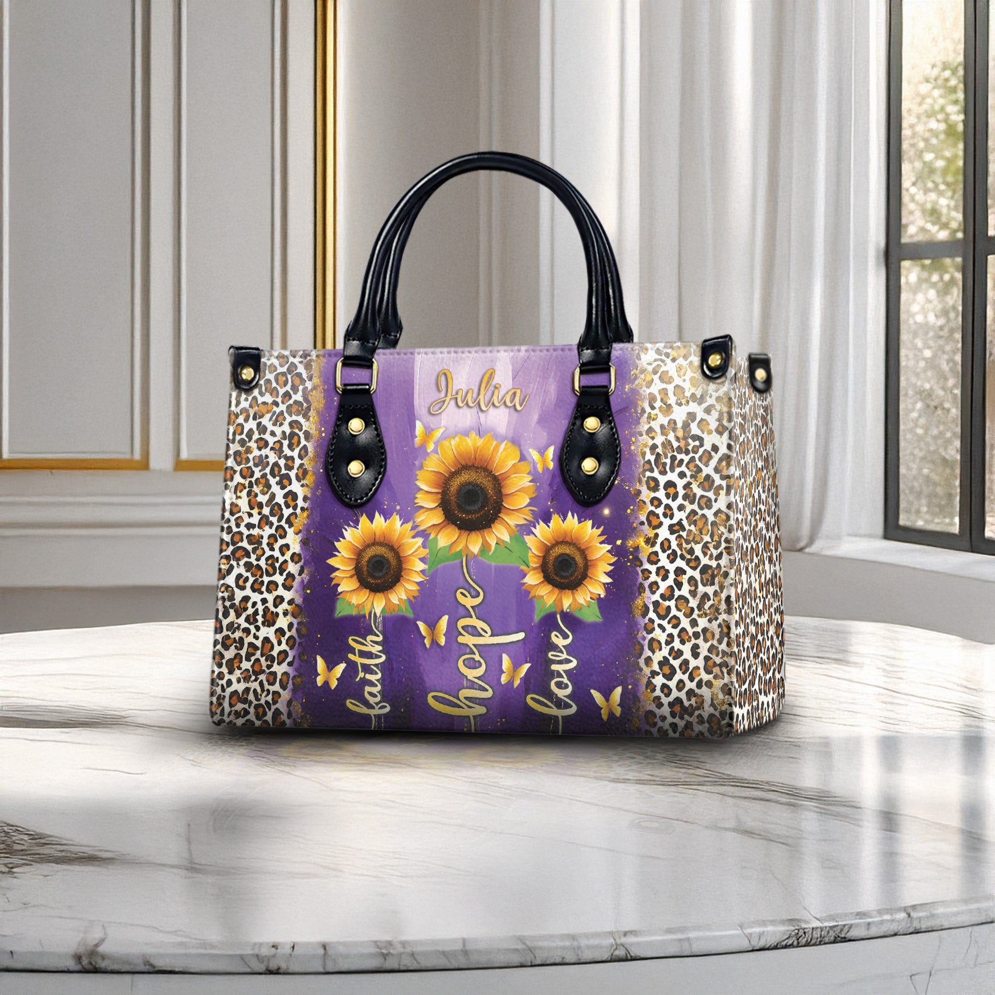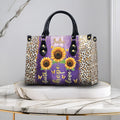 HB19-Personalized Christian Handbag – Faith Hope Love Tote – Purple Sunflower Leopard Purse – Inspirational Gift for Women