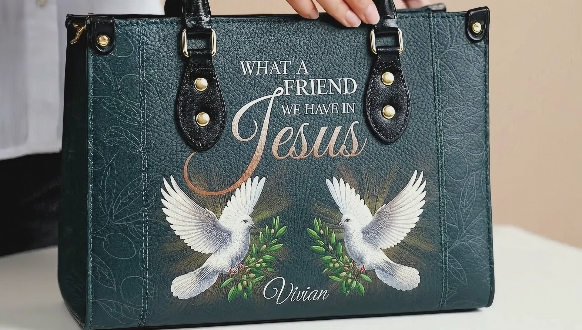 This Personalized Christian Handbag is more than just an accessory — it's a daily reminder of God's presence. Featuring elegant dove artwork and the uplifting verse “What a Friend We Have in Jesus”, this handbag is designed for faithful women who carry both grace and strength.