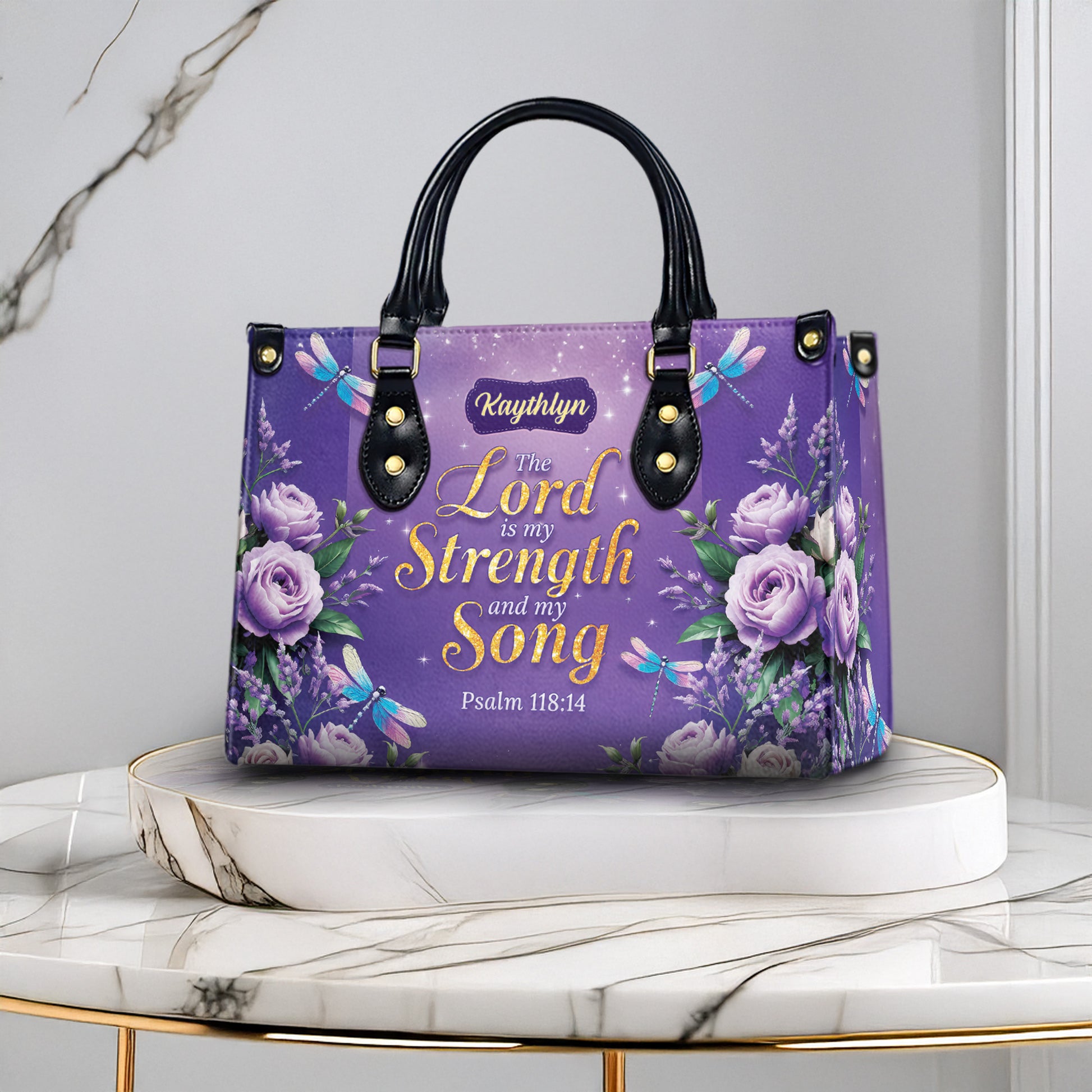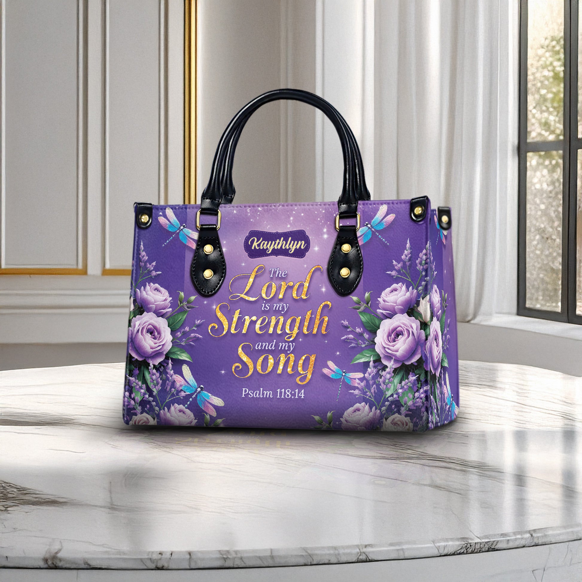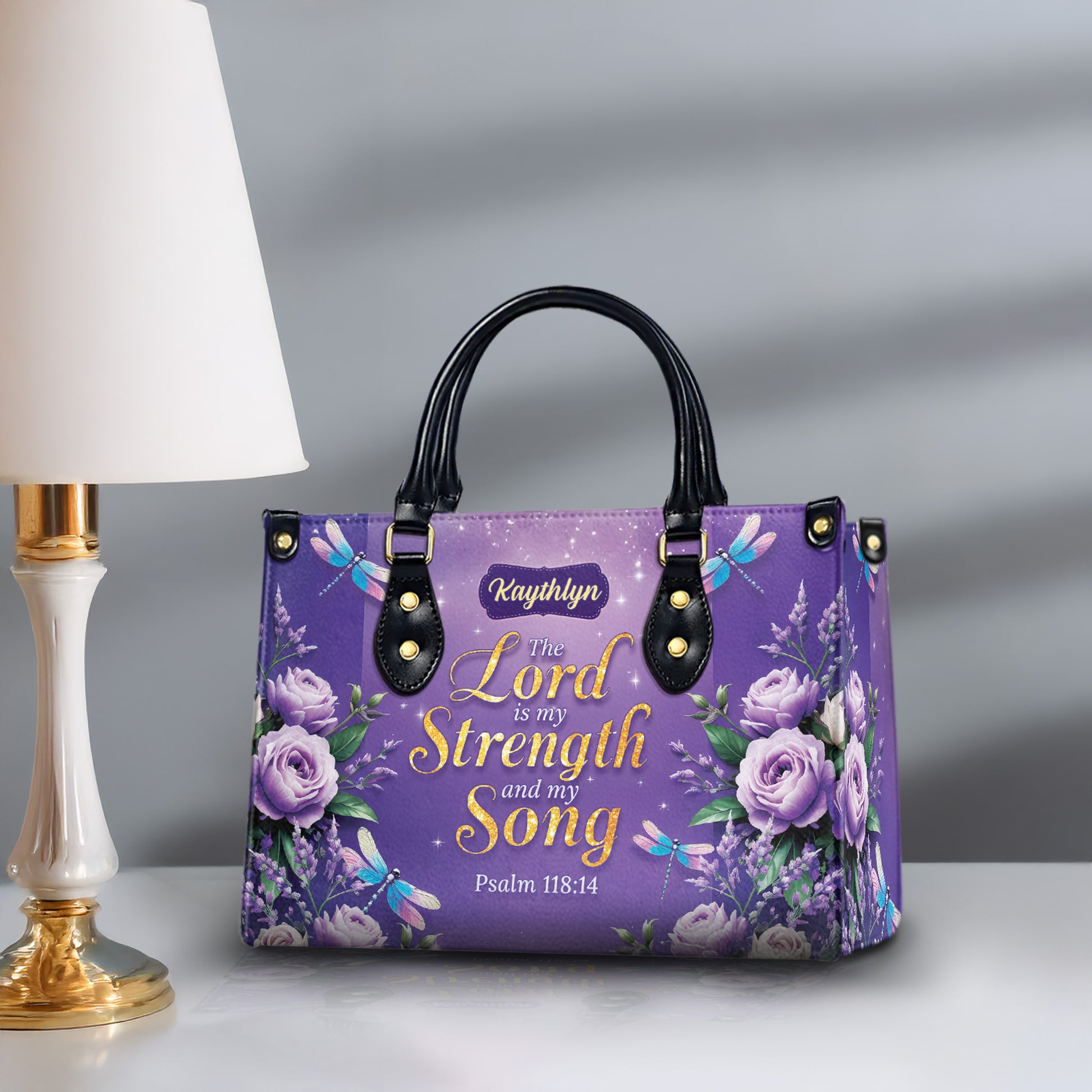 Carry your faith with beauty and purpose with this personalized Christian handbag featuring Psalm 118:14: “The Lord is my Strength and my Song.” Adorned with soft lavender roses, graceful dragonflies, and a shimmering purple background, this elegant handbag is a meaningful symbol of God's strength and grace in your life. A perfect faith-inspired accessory for women who find strength in Scripture.