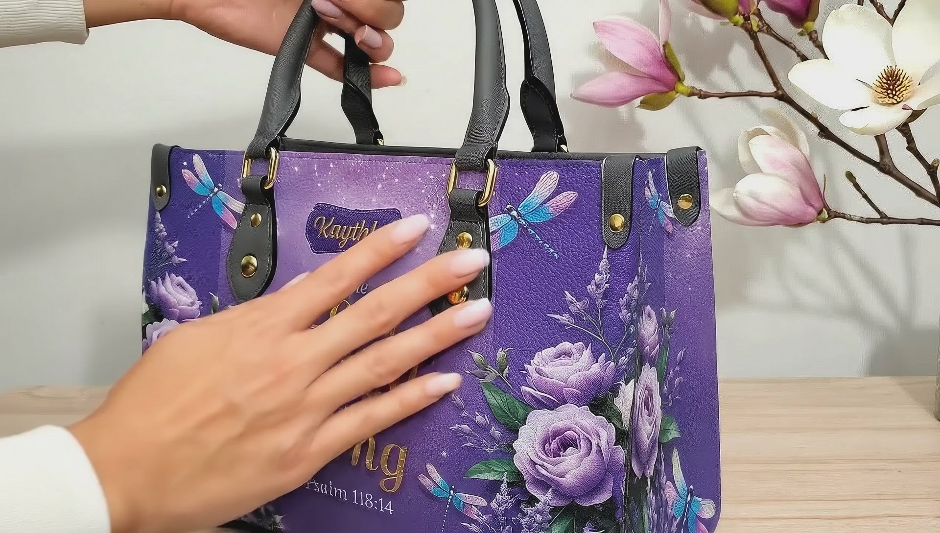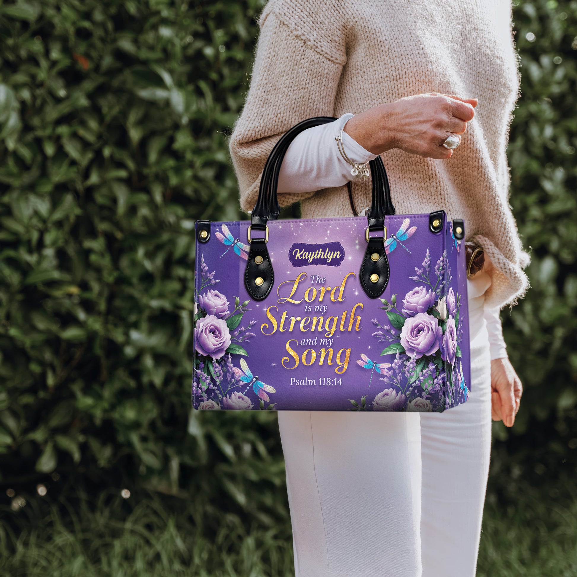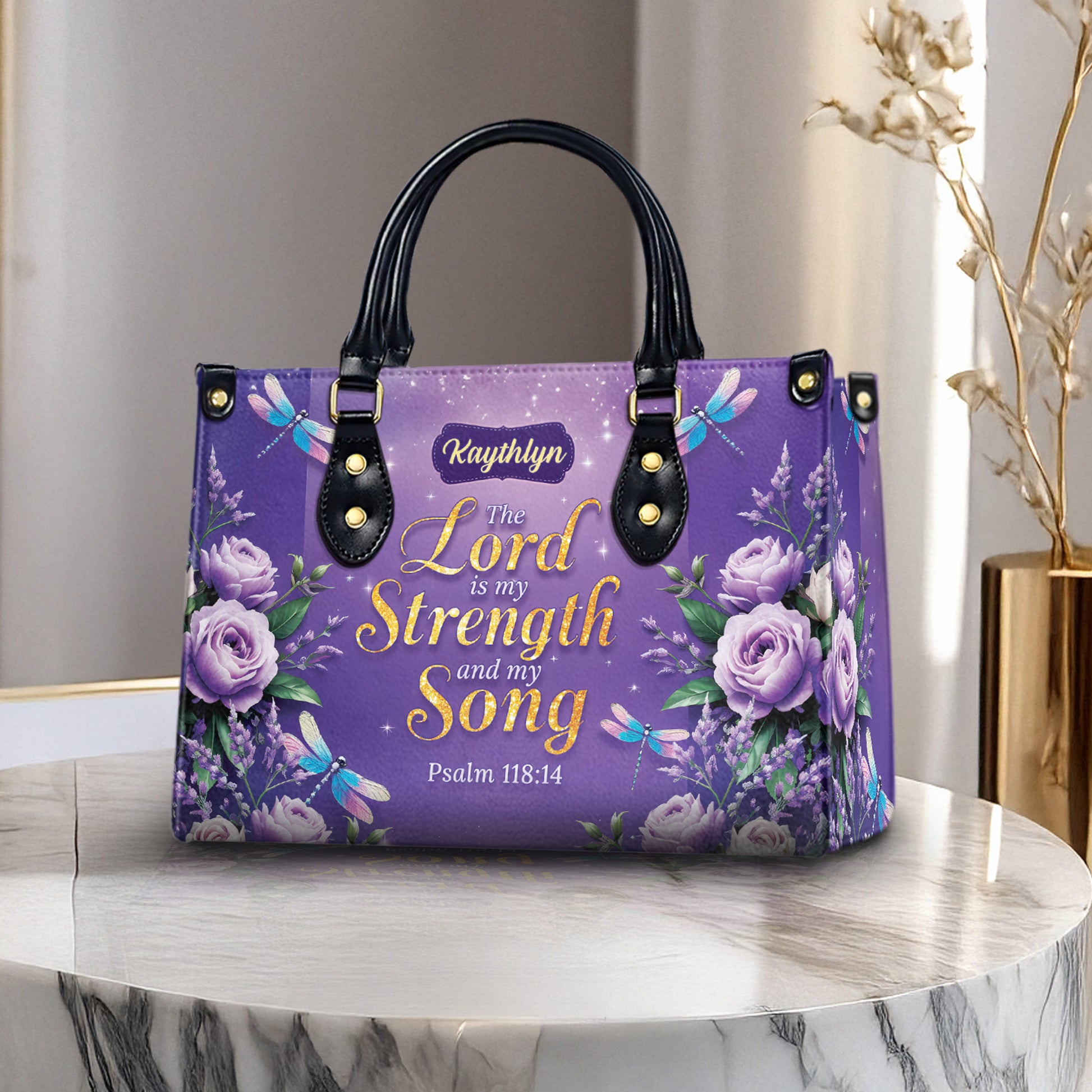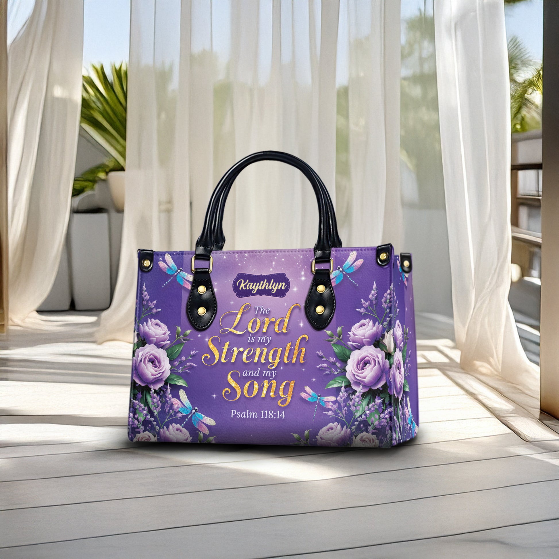 Carry your faith with beauty and purpose with this personalized Christian handbag featuring Psalm 118:14: “The Lord is my Strength and my Song.” Adorned with soft lavender roses, graceful dragonflies, and a shimmering purple background, this elegant handbag is a meaningful symbol of God's strength and grace in your life. A perfect faith-inspired accessory for women who find strength in Scripture.