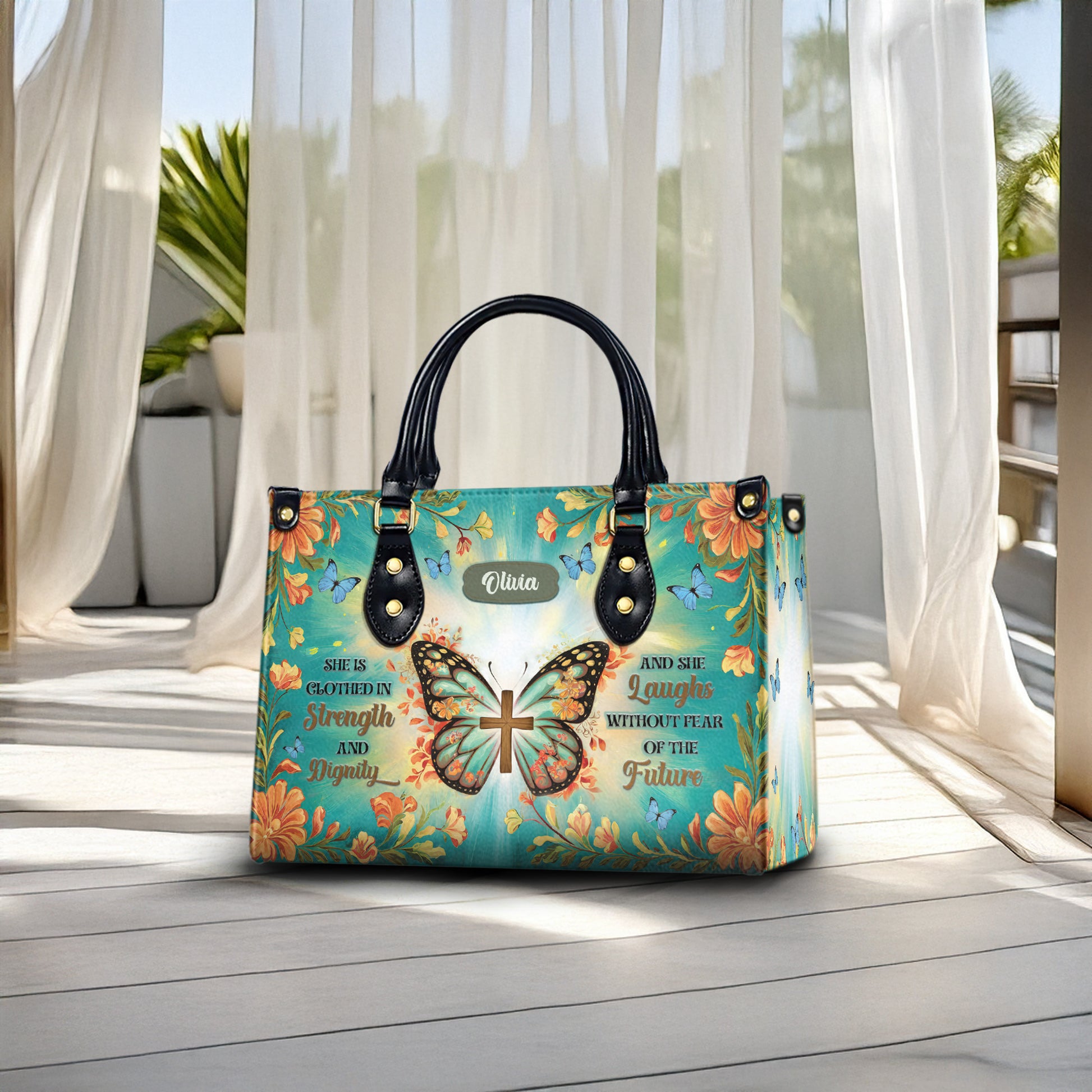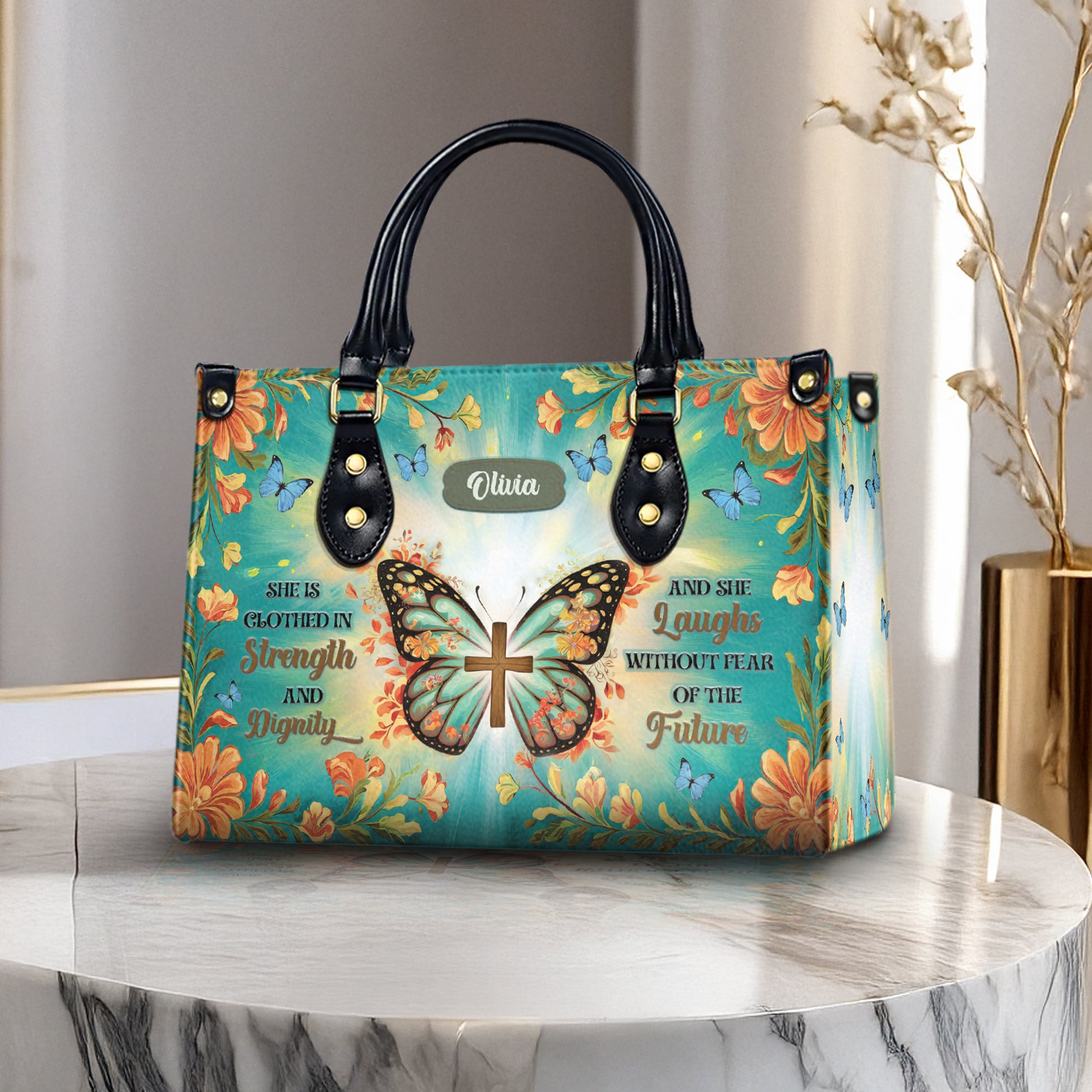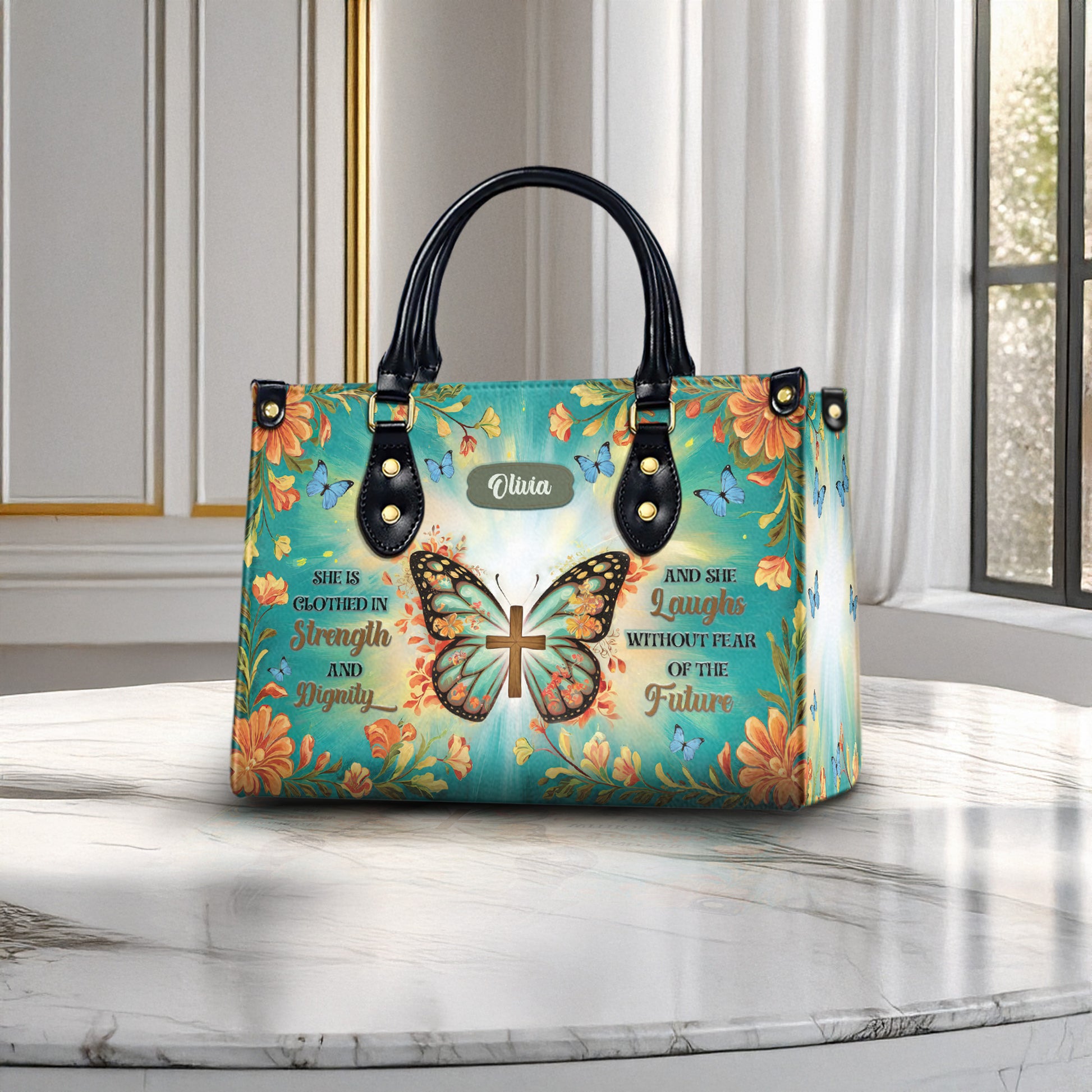 HB17-Custom Name Christian Leather Handbag - Faith Butterfly Bag, Bible Verse, Cross, Personalized Religious Gift for Women, Mom, Jesus Lovers.