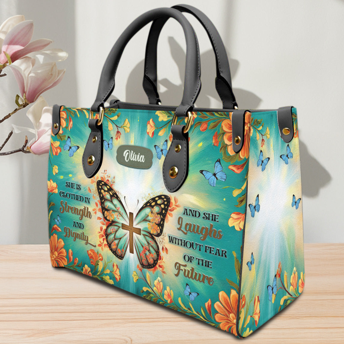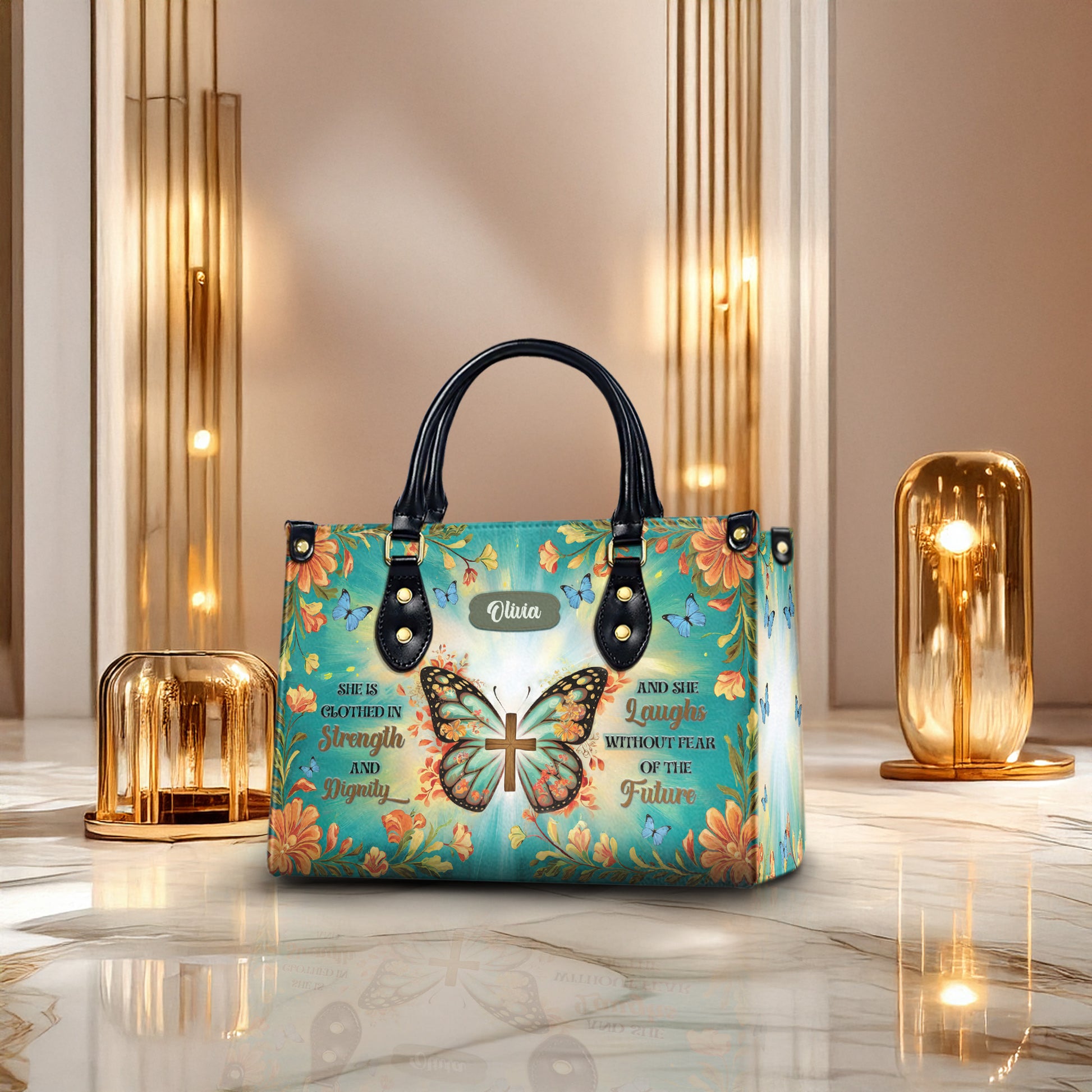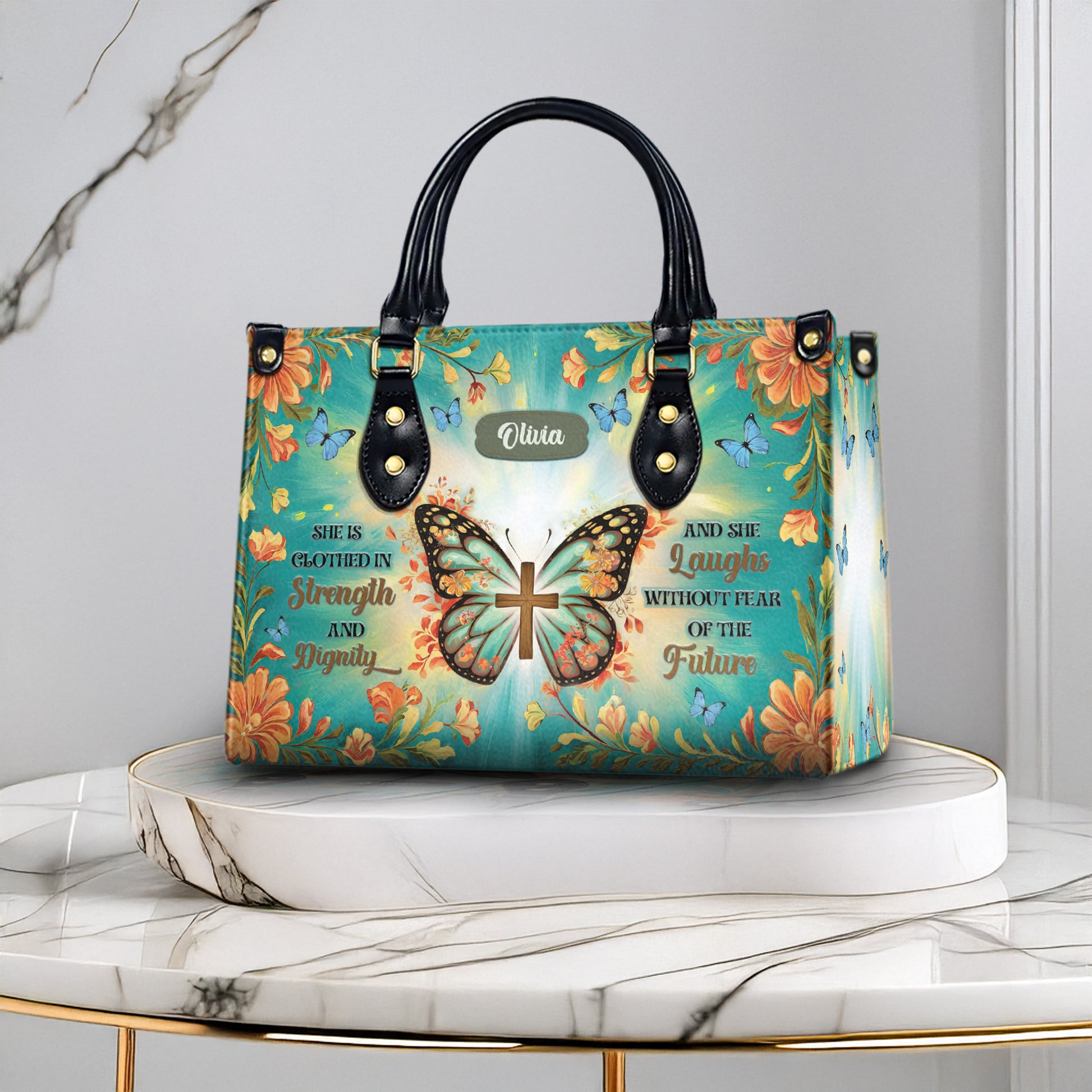 HB17-Custom Name Christian Leather Handbag - Faith Butterfly Bag, Bible Verse, Cross, Personalized Religious Gift for Women, Mom, Jesus Lovers.