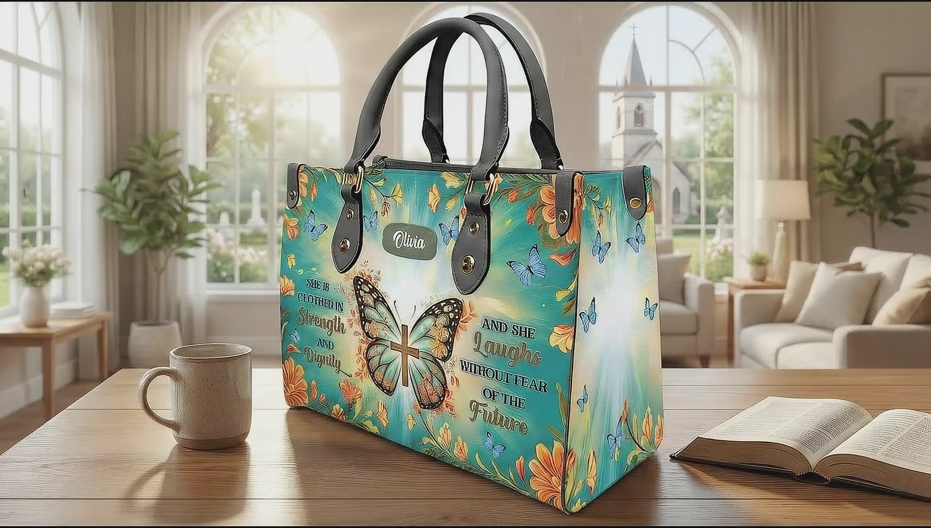 Name Christian Leather Handbag - Faith Butterfly Bag, Bible Verse, Cross, Personalized Religious Gift for Women, Mom, Jesus Lovers|HB17