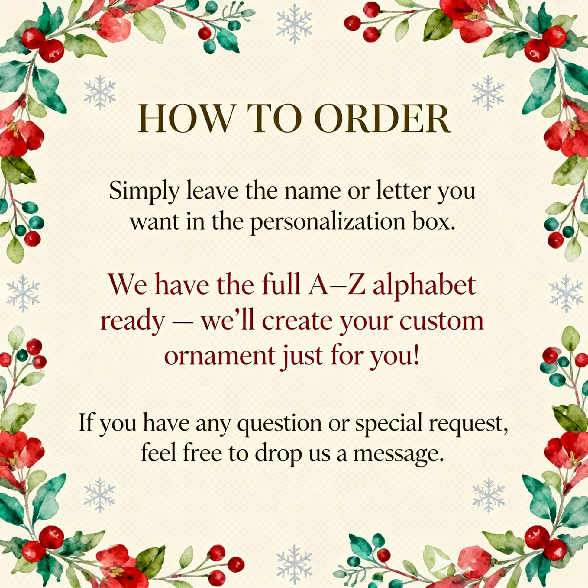 Each ornament features your chosen alphabet letter (A–Z) glowing with festive lights, surrounded by Santa, happy elves, pine branches, and snowflakes — a perfect touch of Christmas joy for every name in the family.