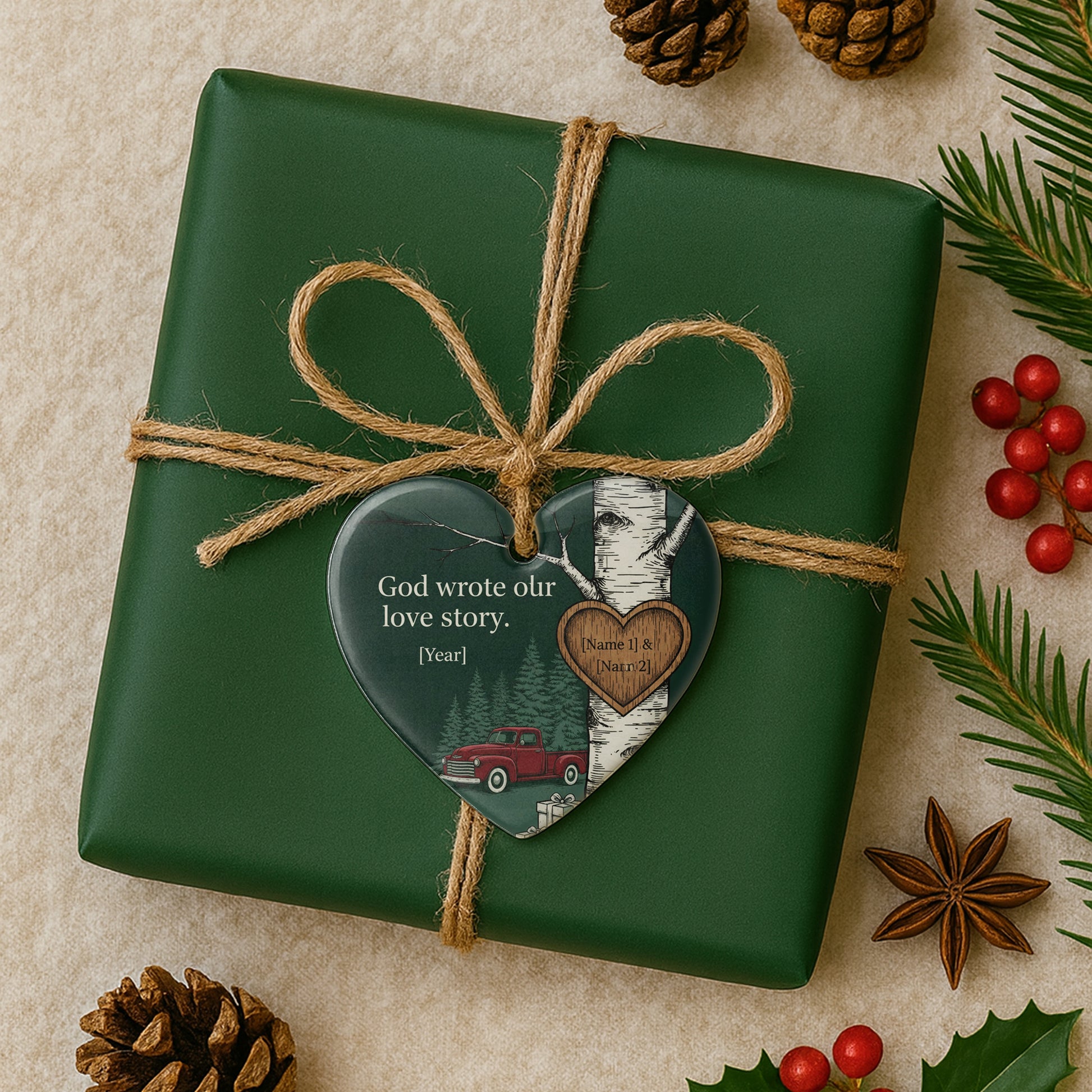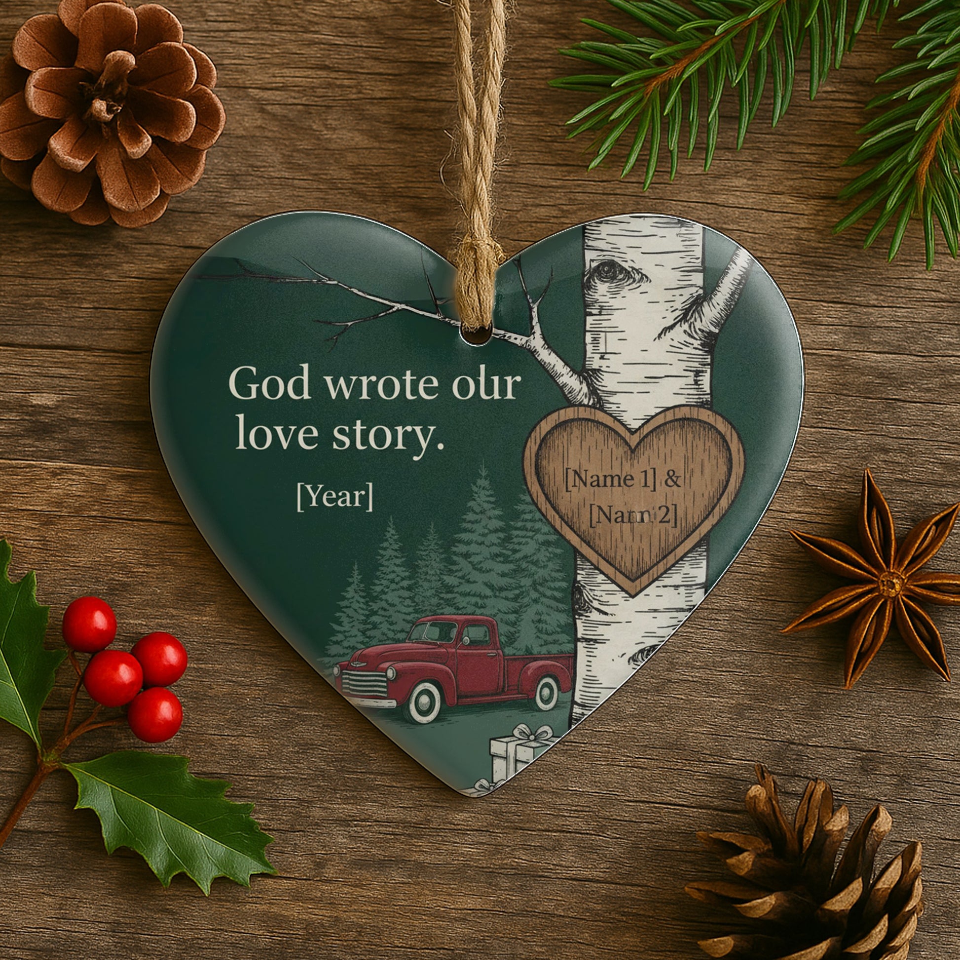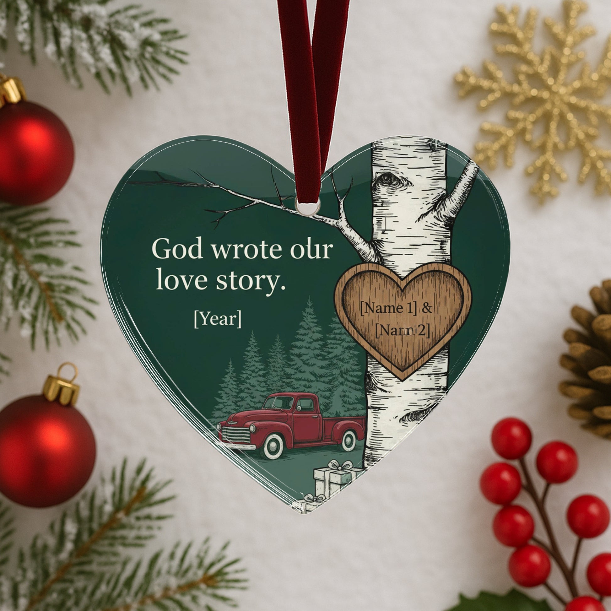 Celebrate love and faith this Christmas with our ✨ Personalized Couple Ornament ✨ featuring the touching quote “God wrote our love story.” Each heart-shaped ornament includes your names and year, beautifully engraved on a rustic birch tree with a classic red truck design 🚗 — perfect for couples who cherish God’s plan for their love.
