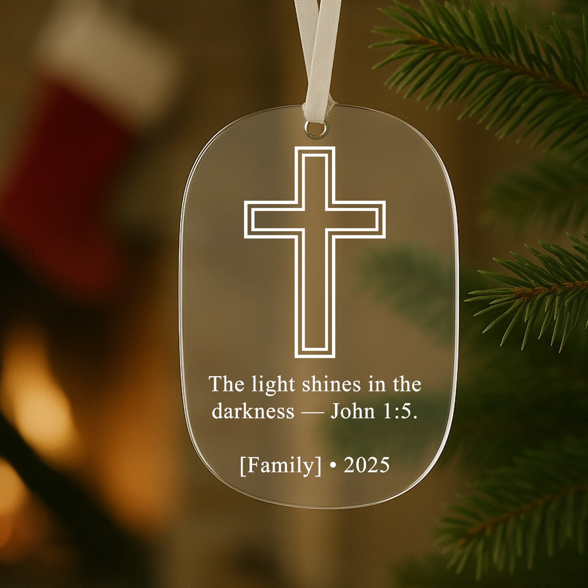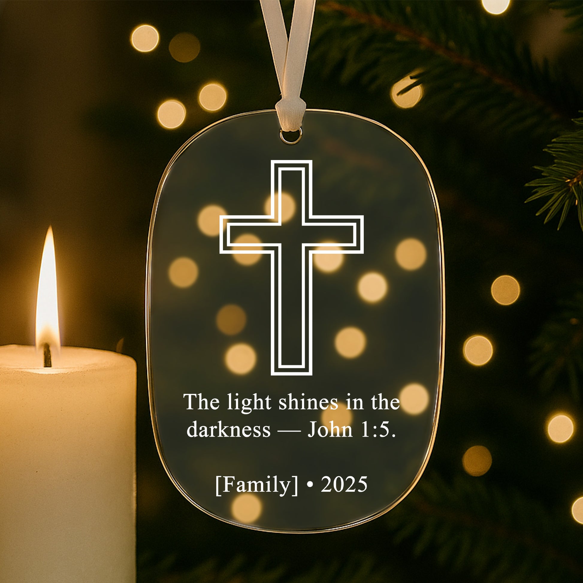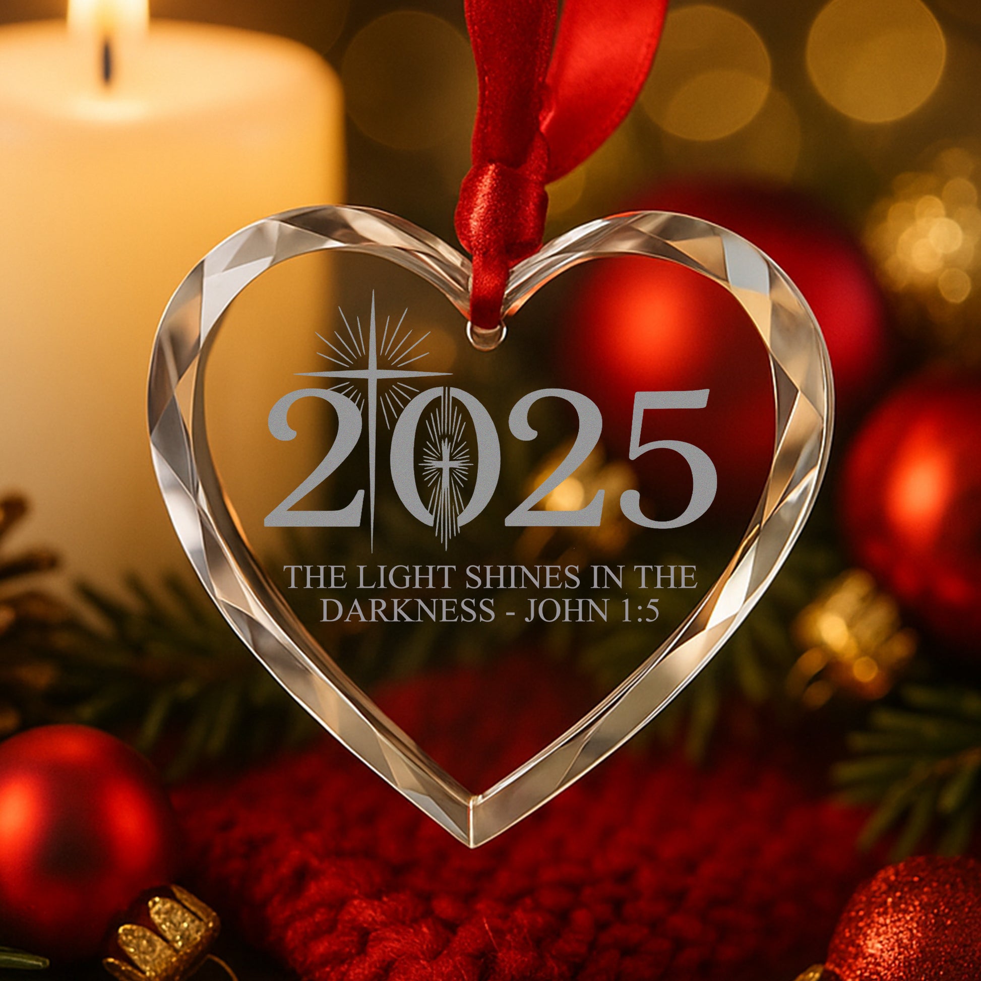 1 Glass Ornament: “The Light Shines in the Darkness – John 1:5” design, elegant and reflective for a timeless glow.