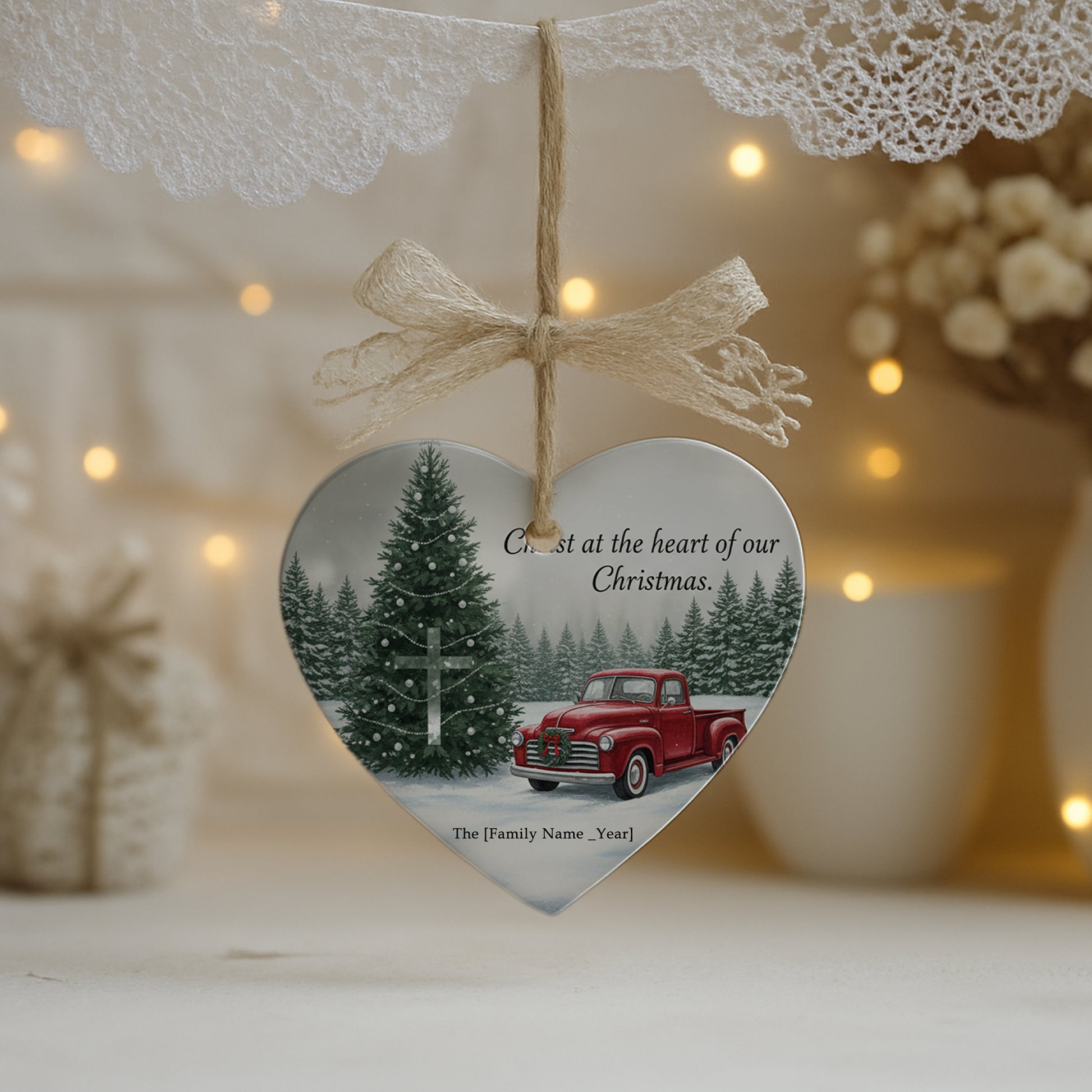 1 Ceramic Ornament: “Christ at the Heart of Our Christmas” design with a classic red truck and peaceful forest scene.