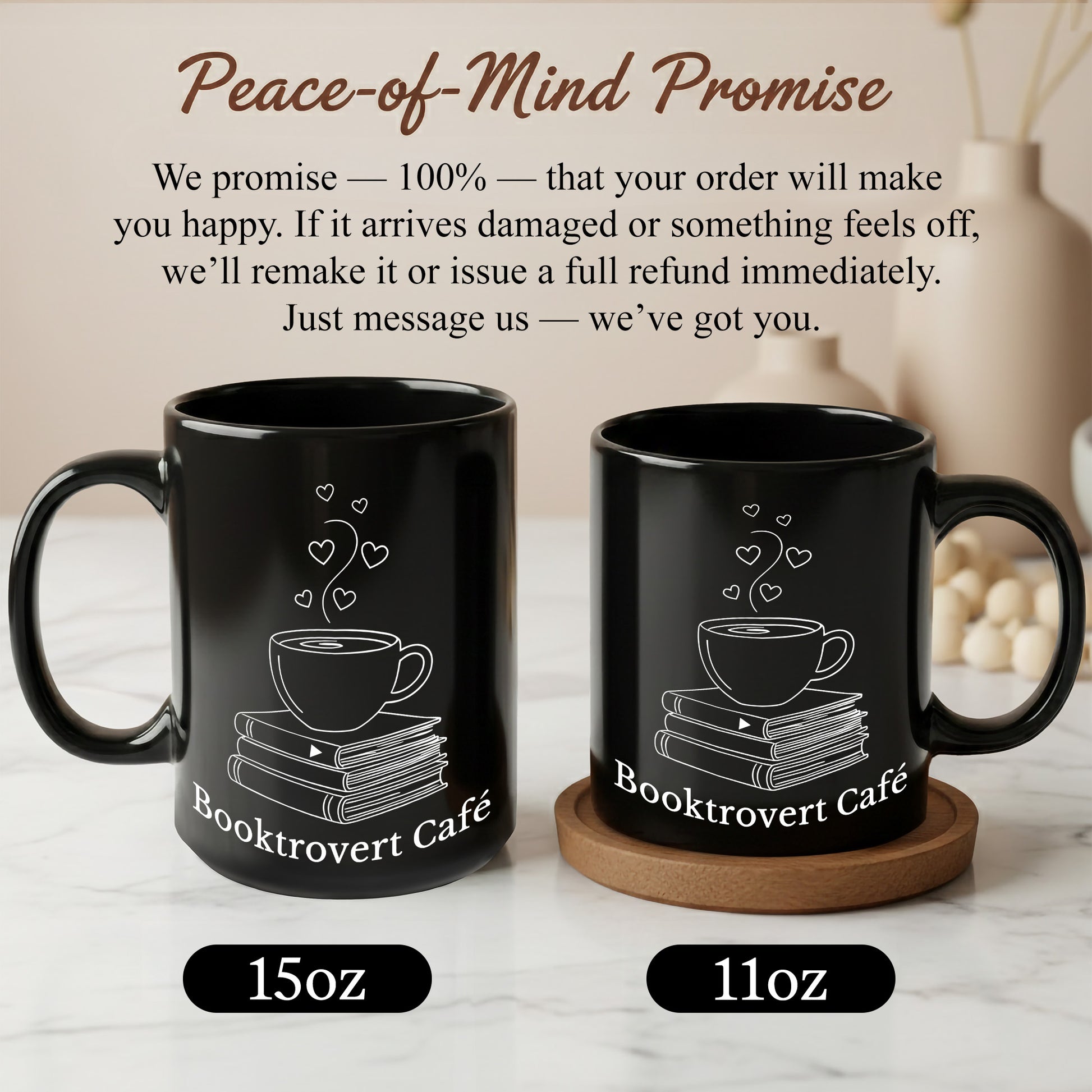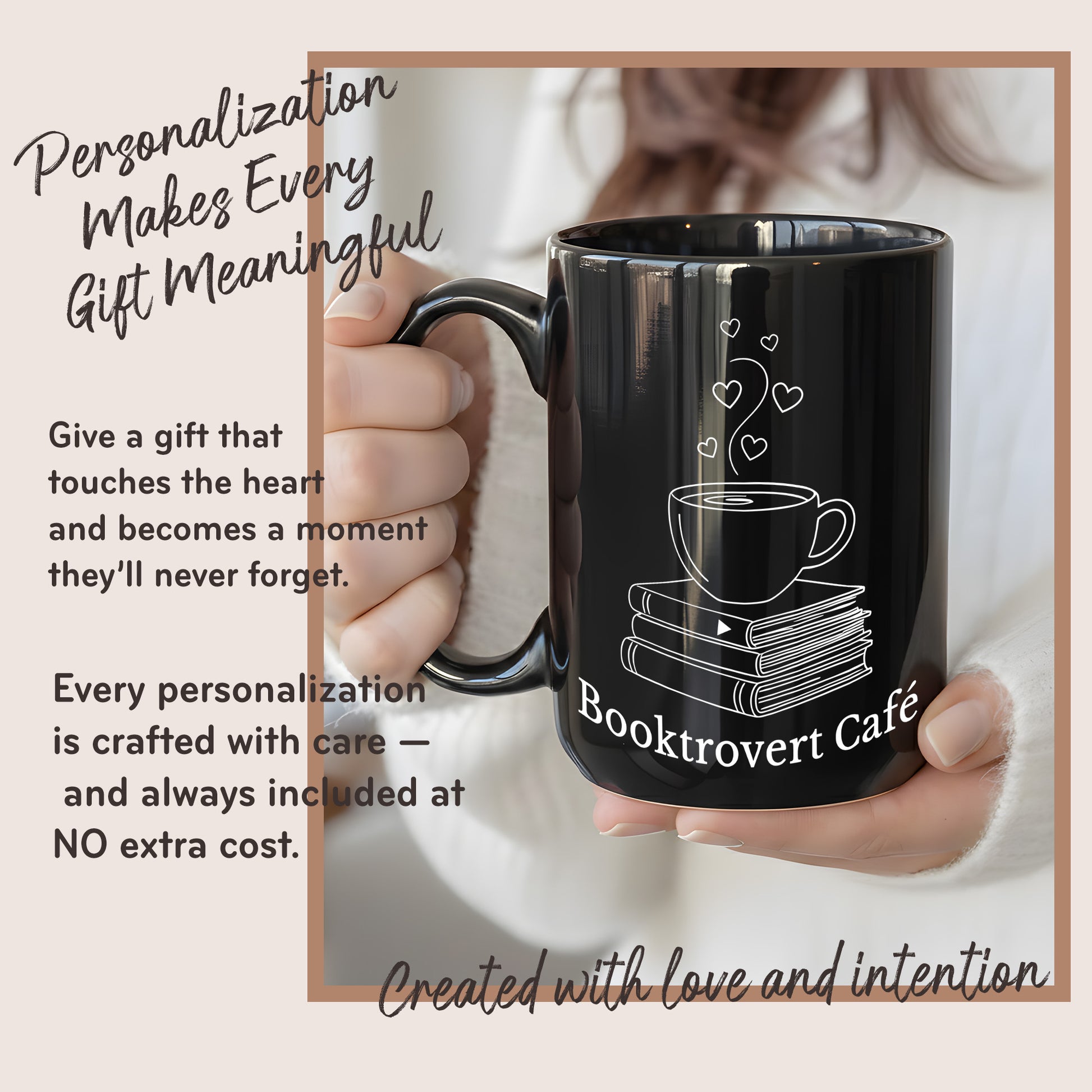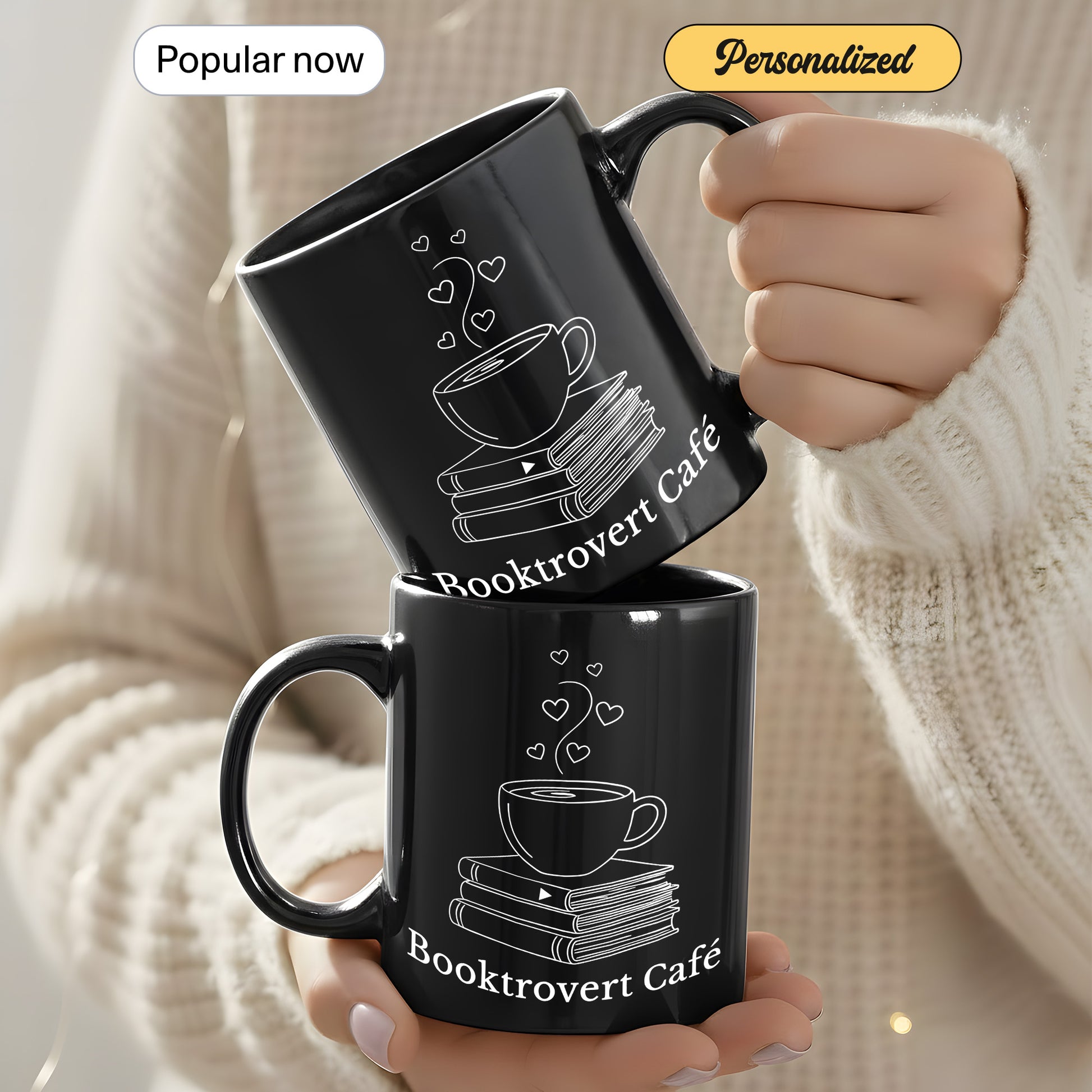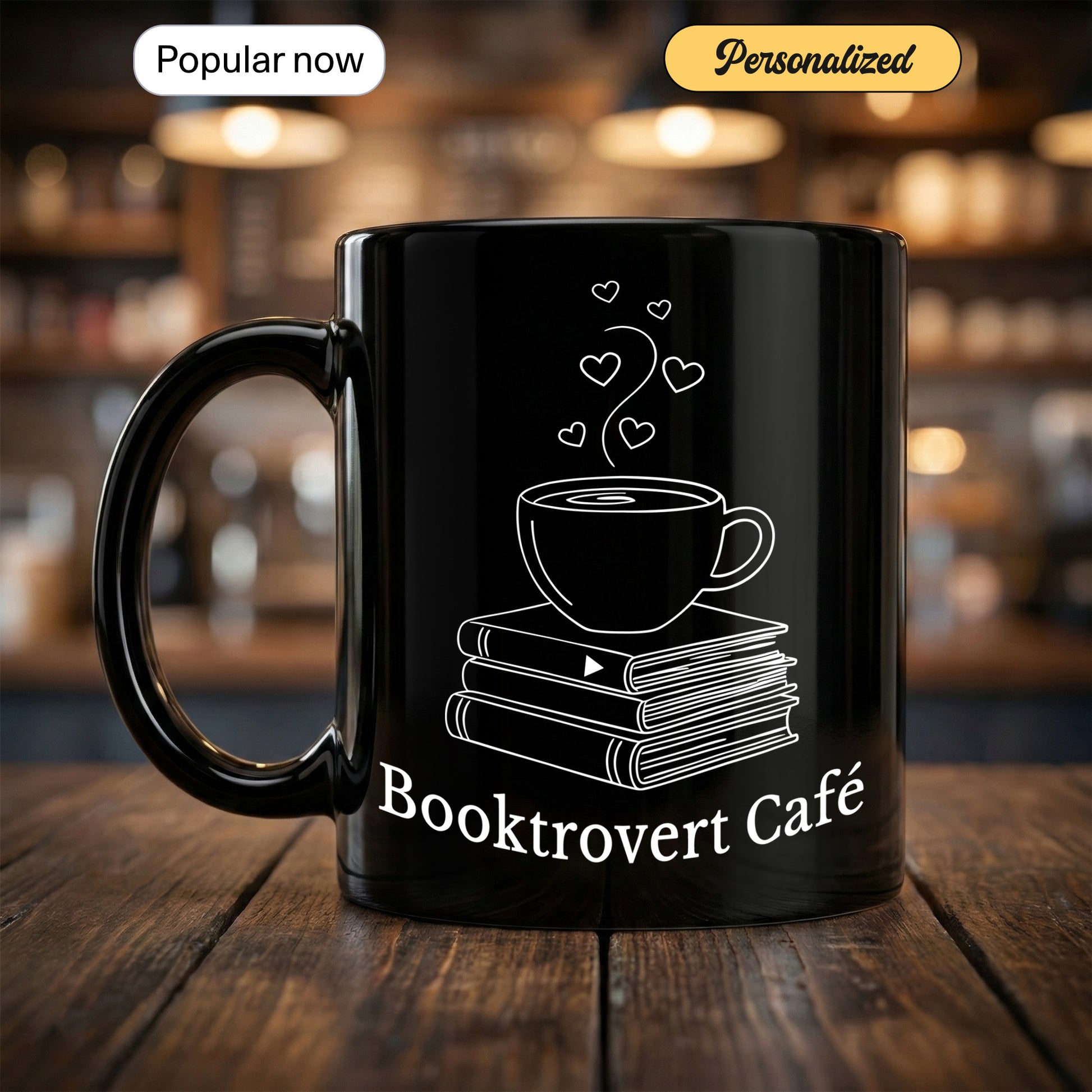 Design: Bold white print on a black mug featuring a steaming cup above a stack of books with the “Booktrovert Café” text and cute hearts. 💖